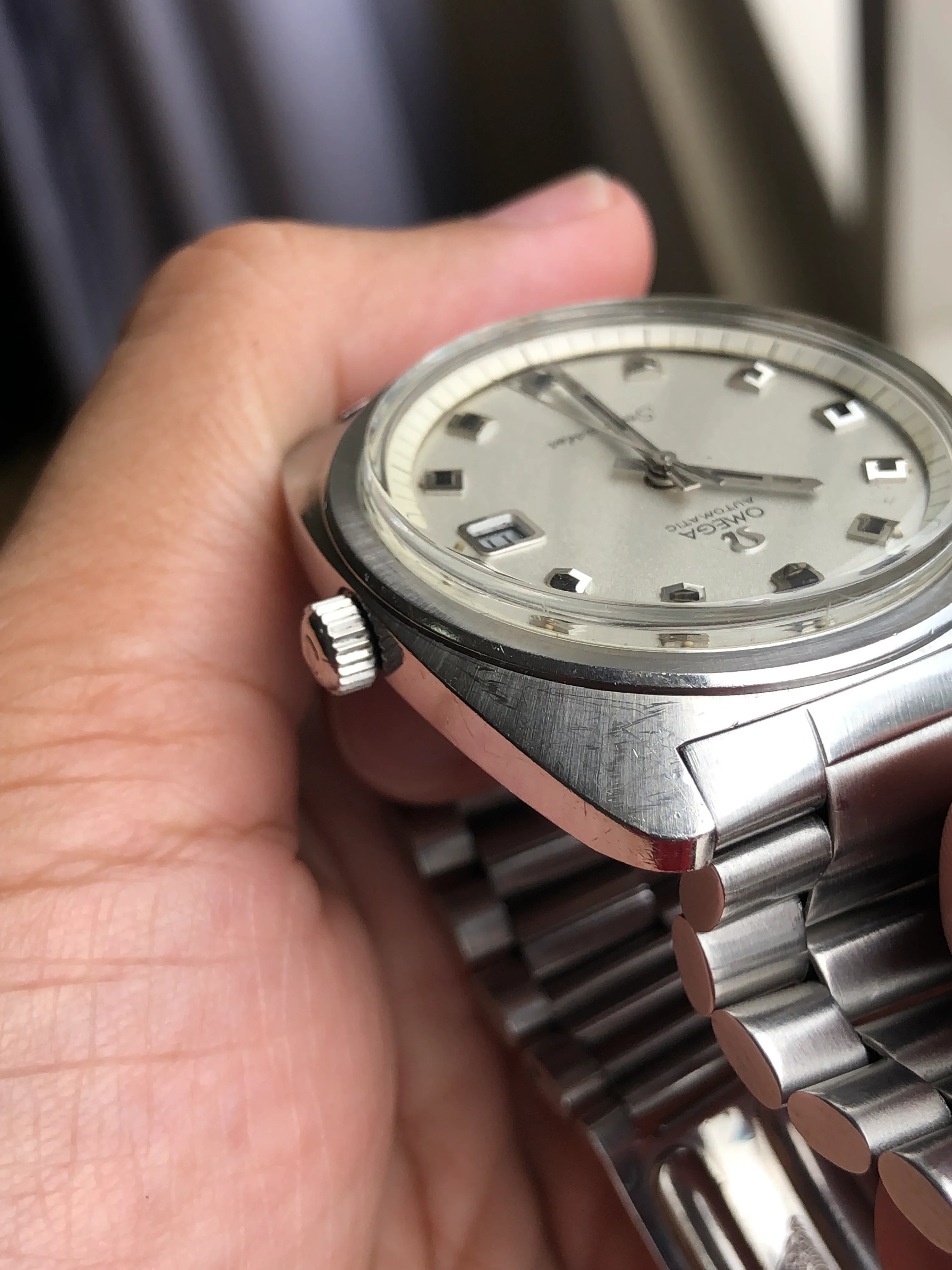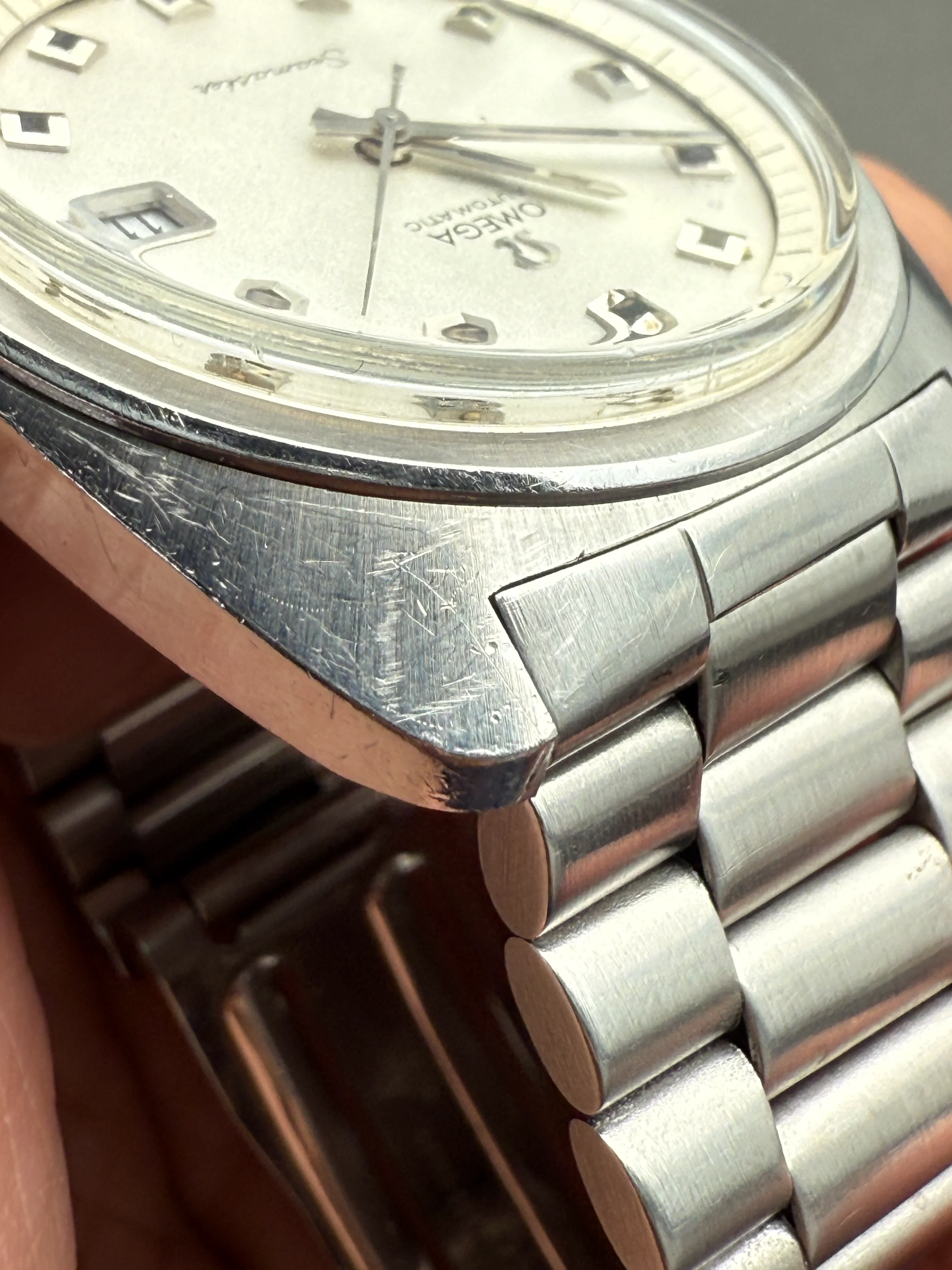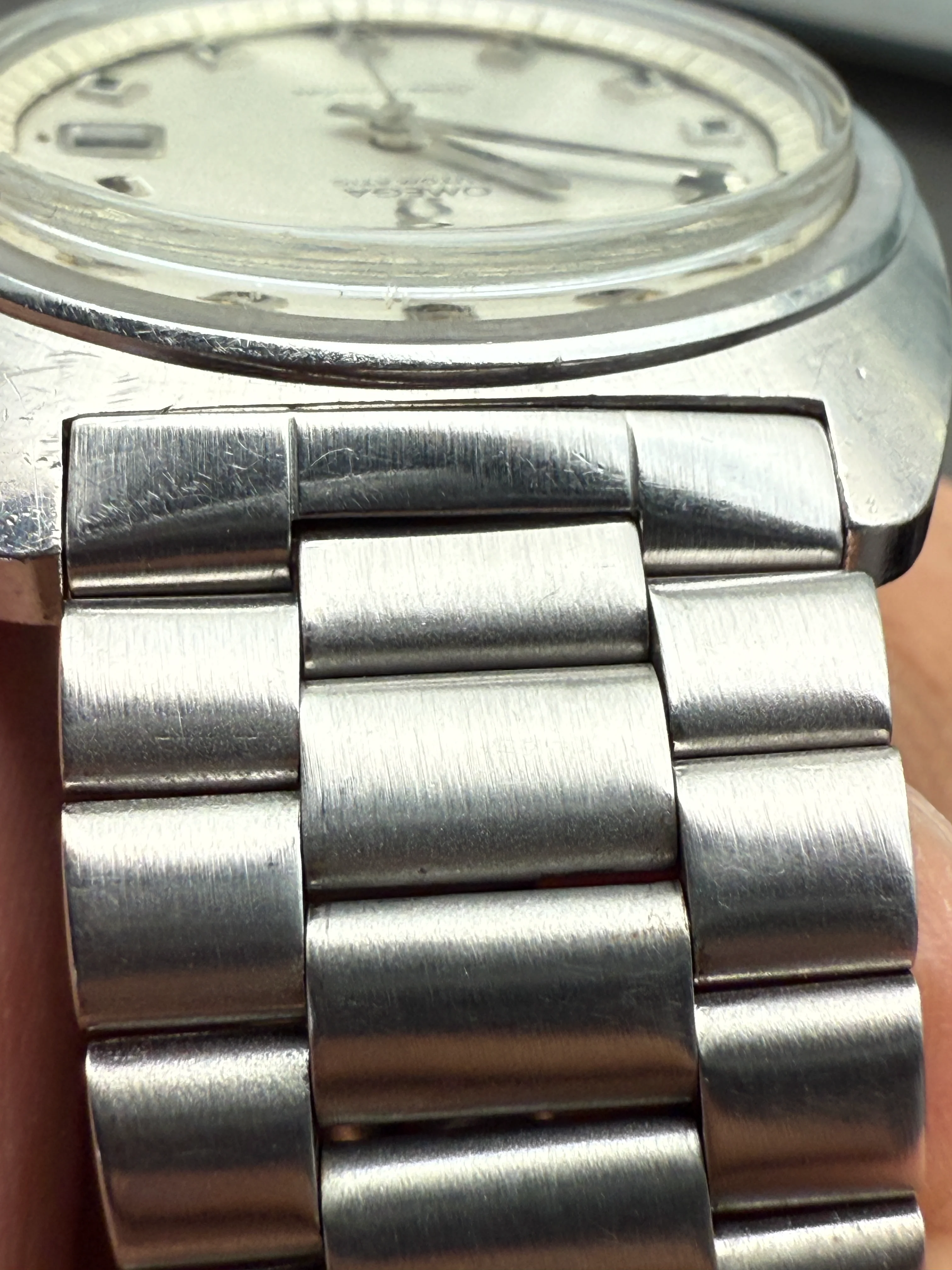 - Case: The diameter is 38.5m without the crown, 22 mm lugs. Original case is in good condition with scratches, retains all the brushed surfaces. Original Omega knurled crown.