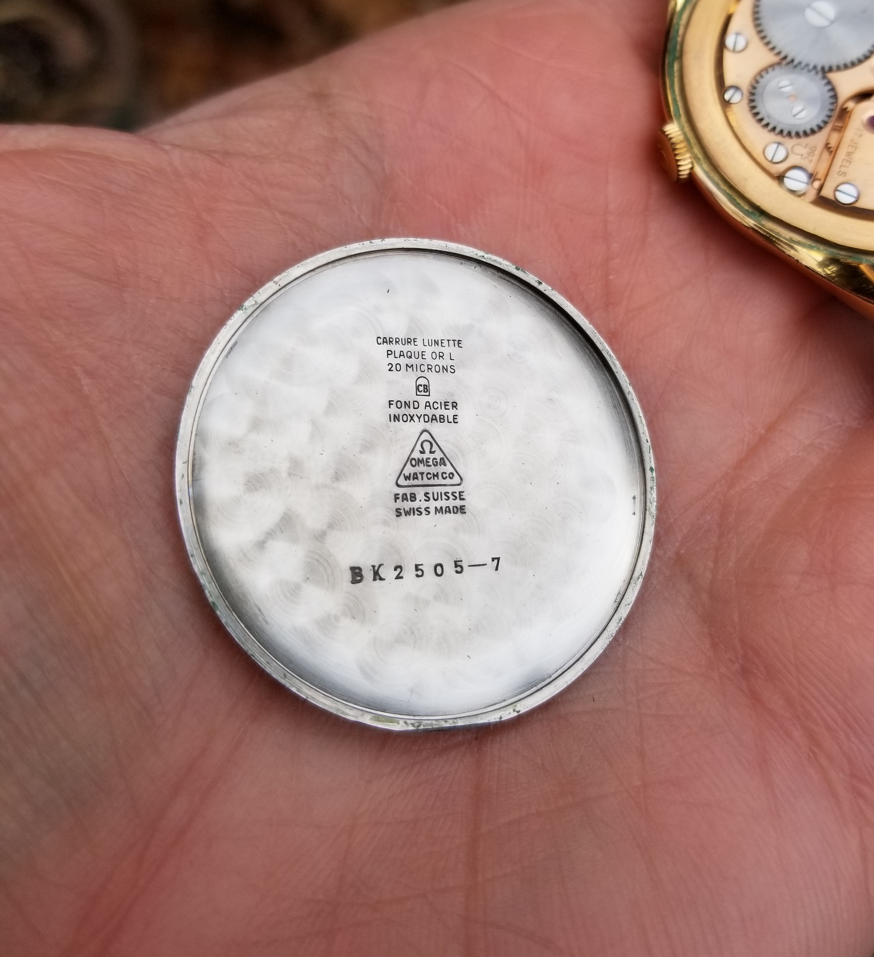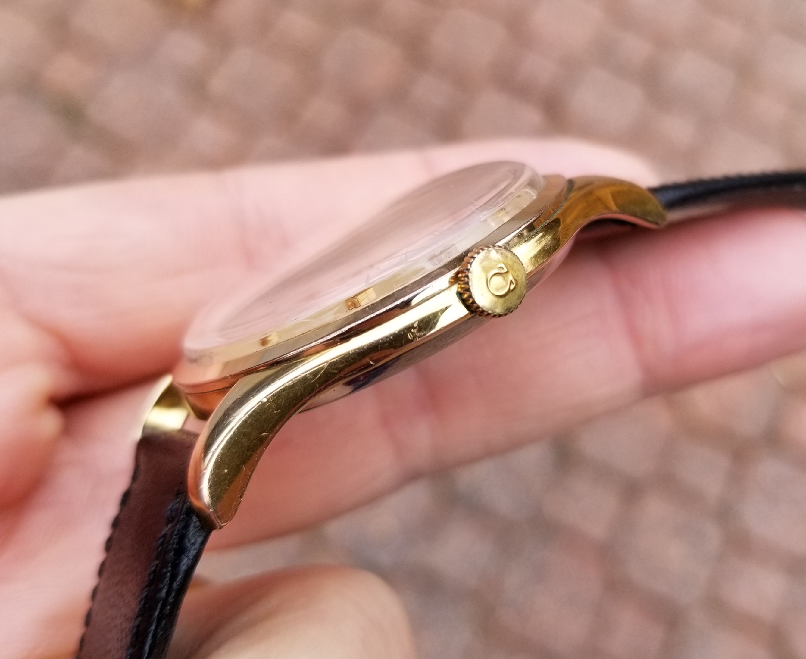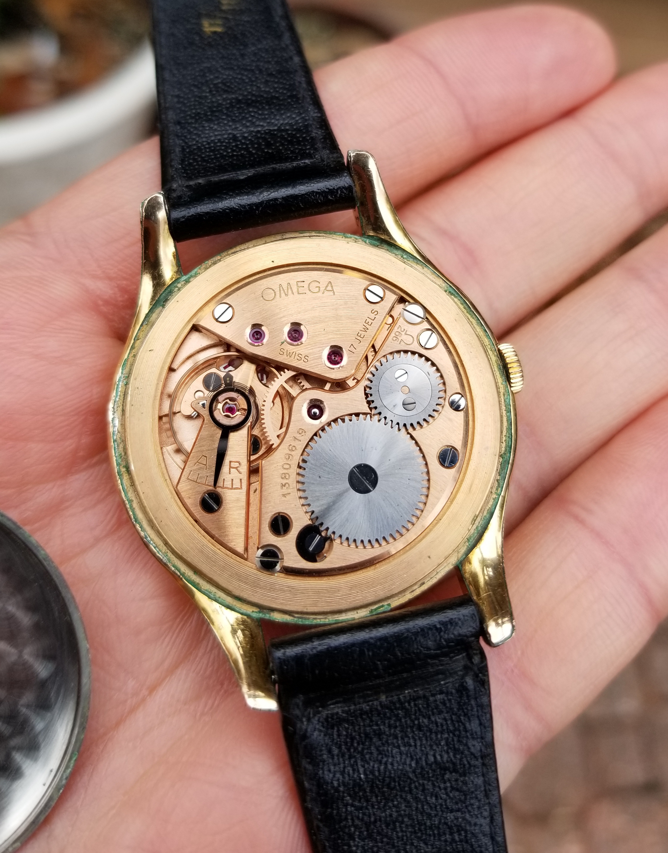 The crown is gold, signed Omega in excellent condition. The crystal may be original to the watch given its profile, but I am not totally sure. The movement is aesthetically very clean, winds crisply, and runs well. However, I have not had it serviced. As seen in the photos, there is oxidation under the caseback where the gold plating meets the case. Vintage black strap in the photos is included.