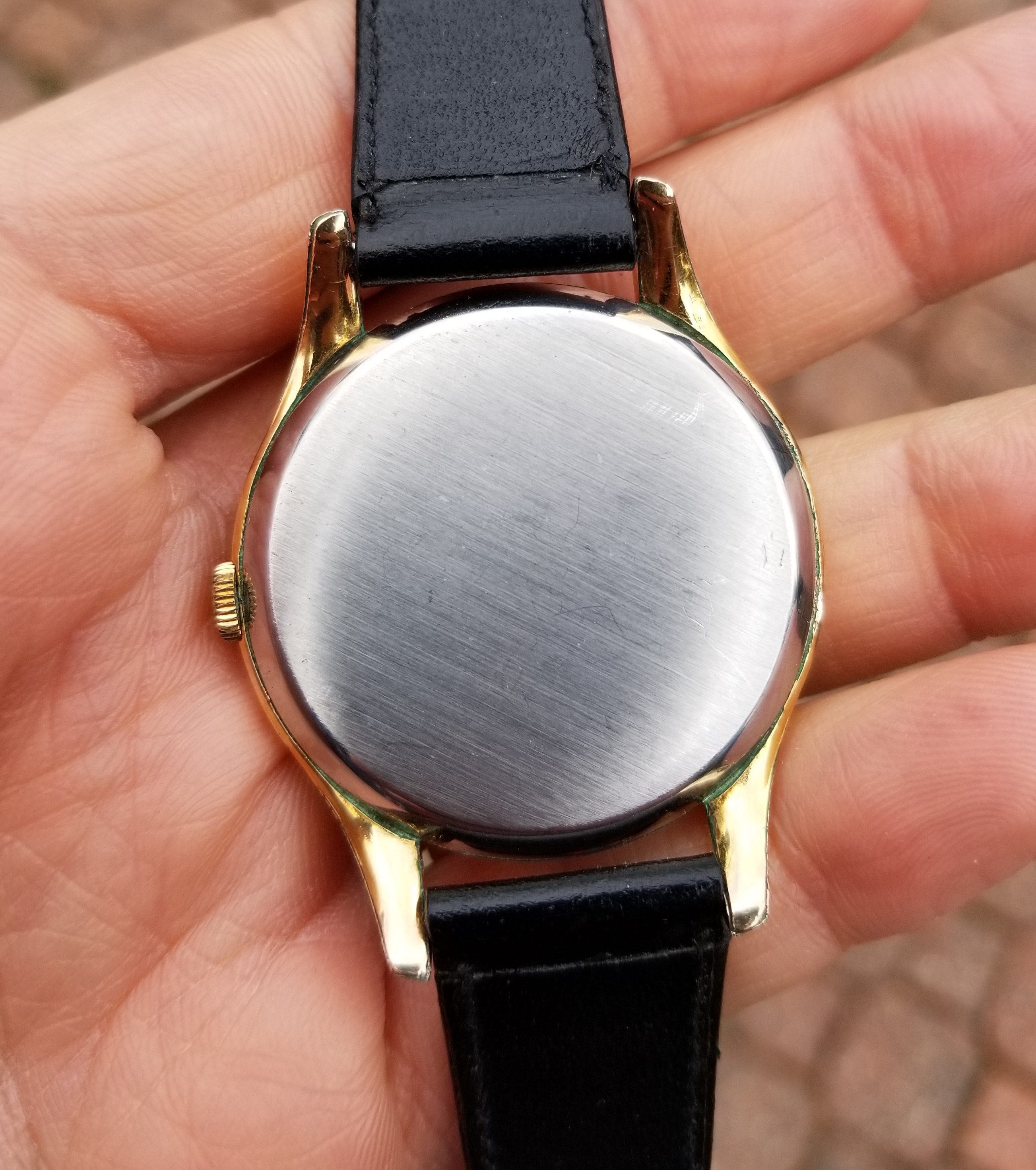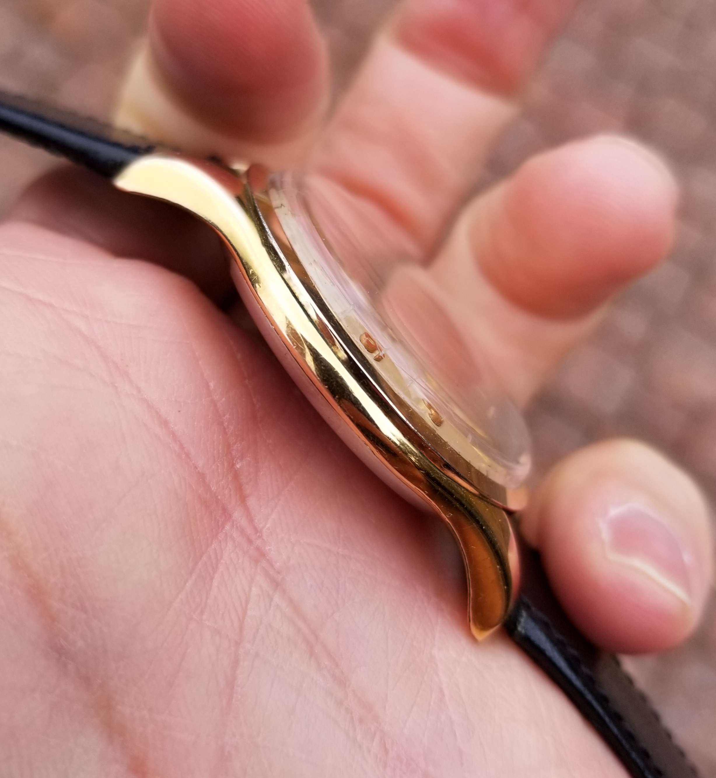 Overall, the watch is in excellent condition. The dial has taken on a light, even patina and has applied gold numerals. The small speck above the 7 hour mark is on the inside of the crystal, not on the dial. The hands show light oxidation. The gold plated case is also in excellent condition and appears unpolished. There is no loss or thinning of the gold. Tiny superficial scratches are commensurate with age.
