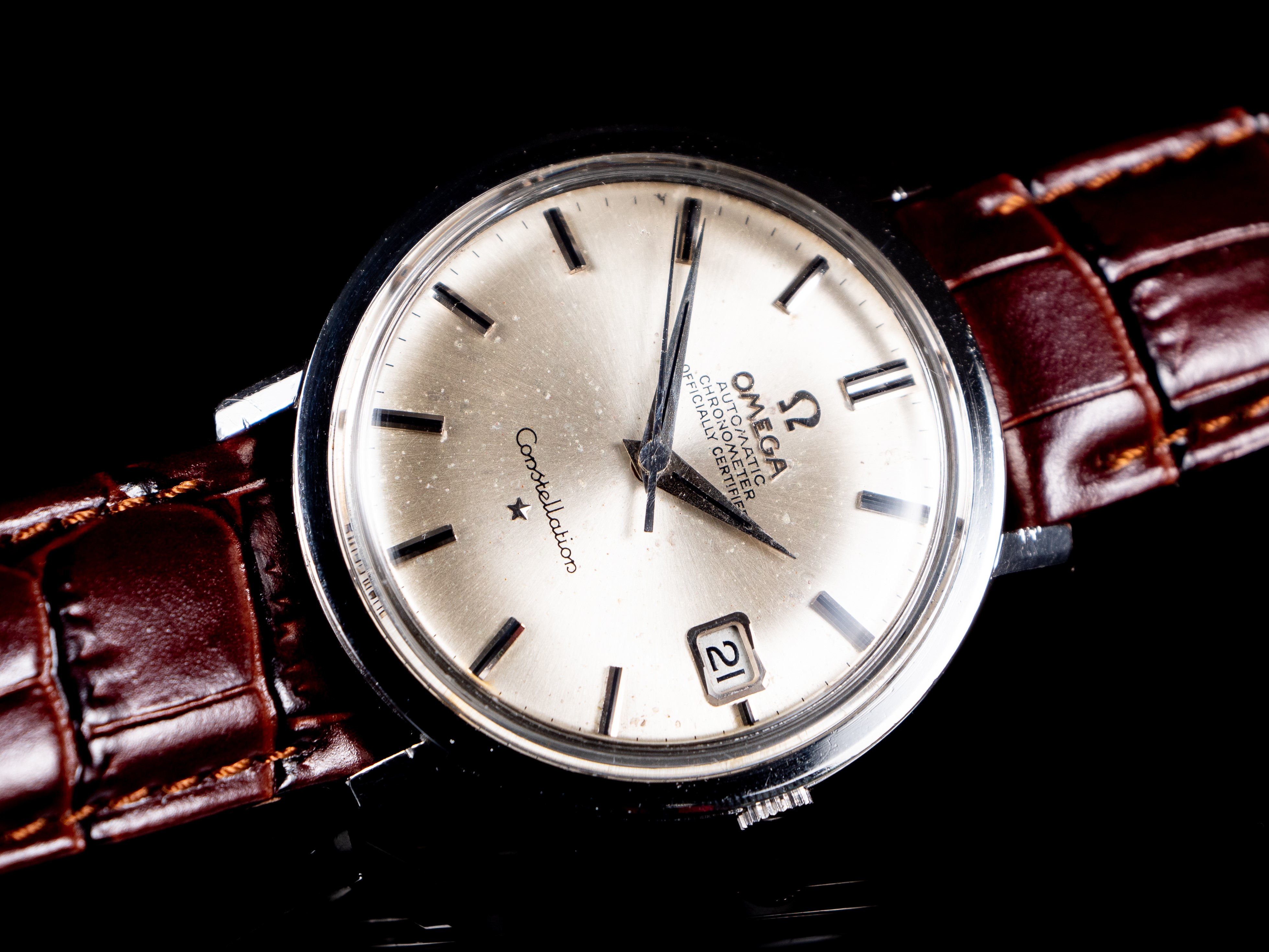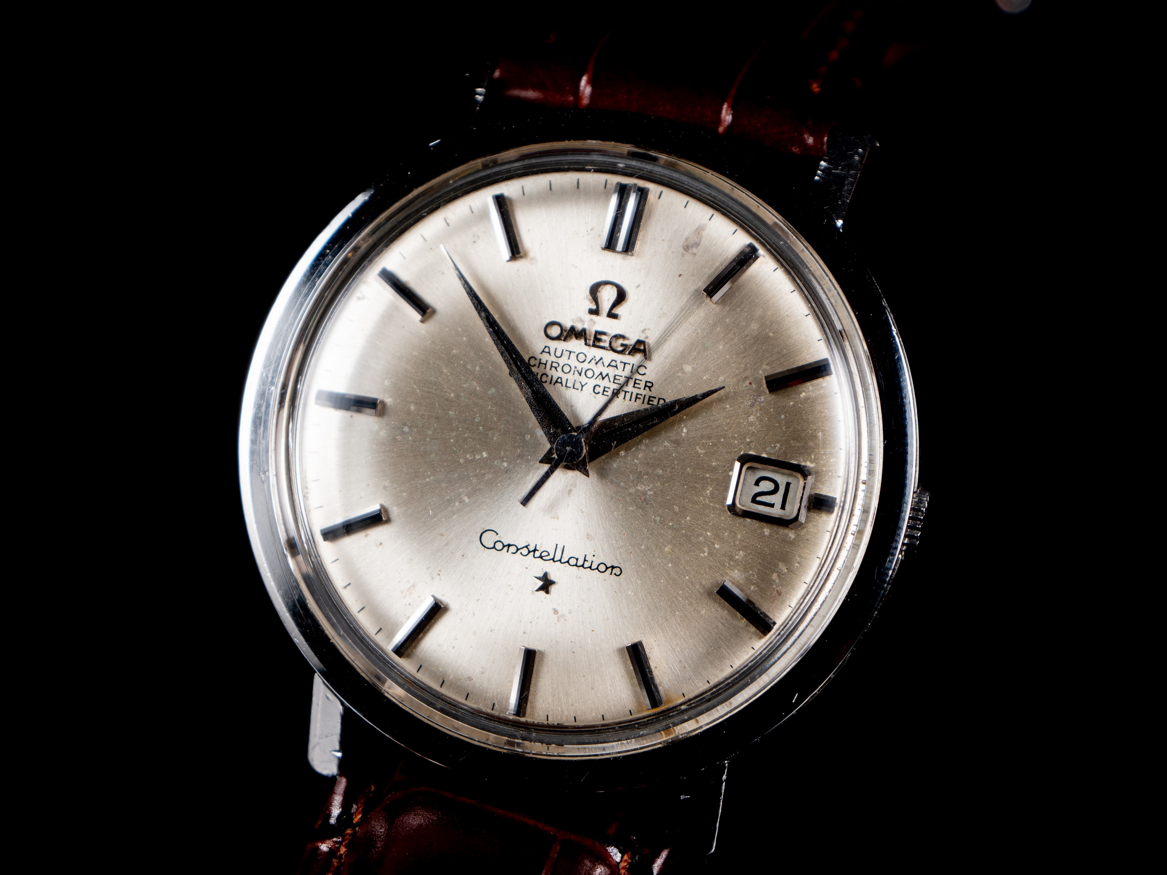 Dial: Patina is present with sheer crazing of the lacquer. Original printing, lapped indices with onyx inserts. Applied Omega logo and brand name.
