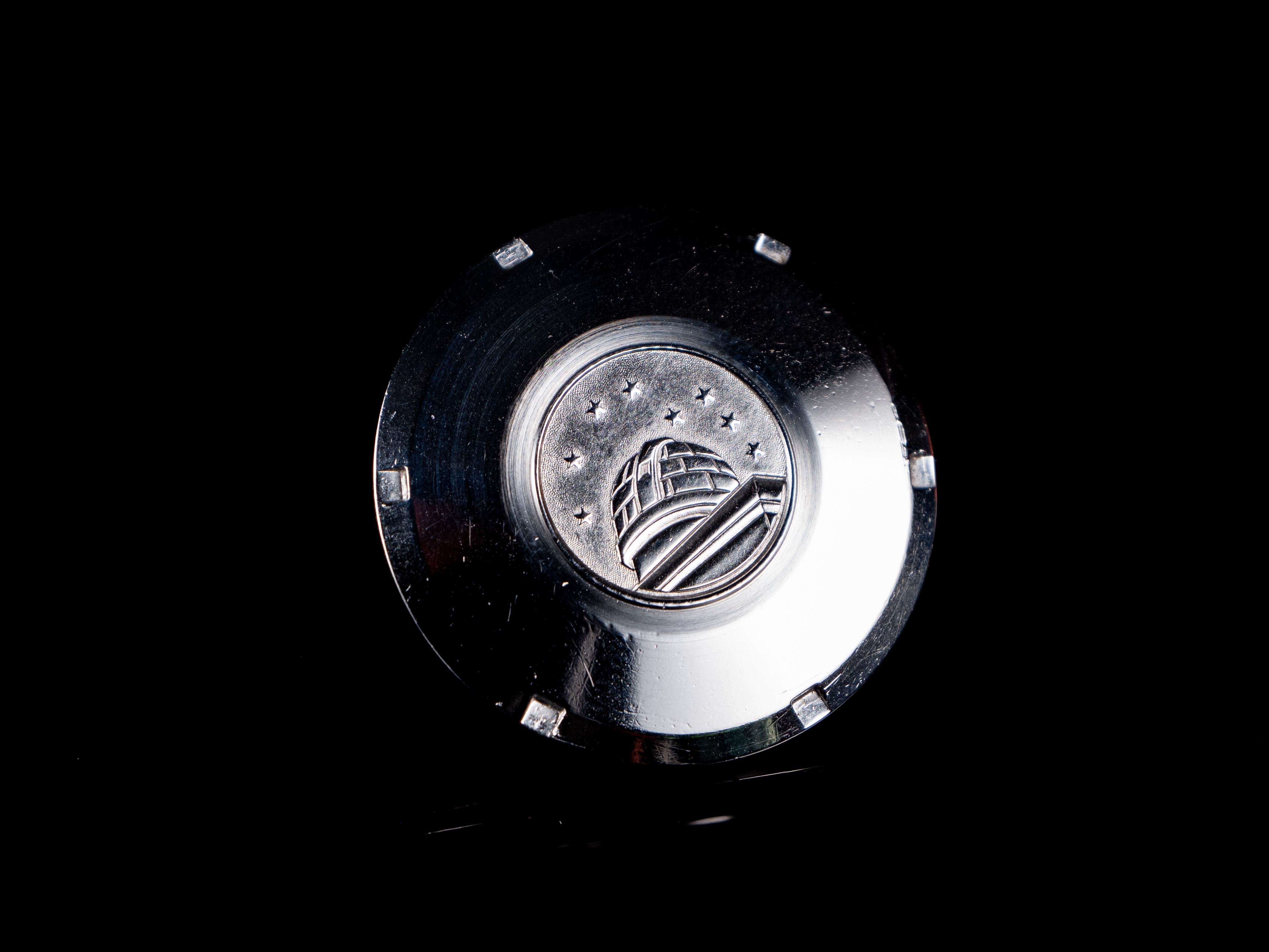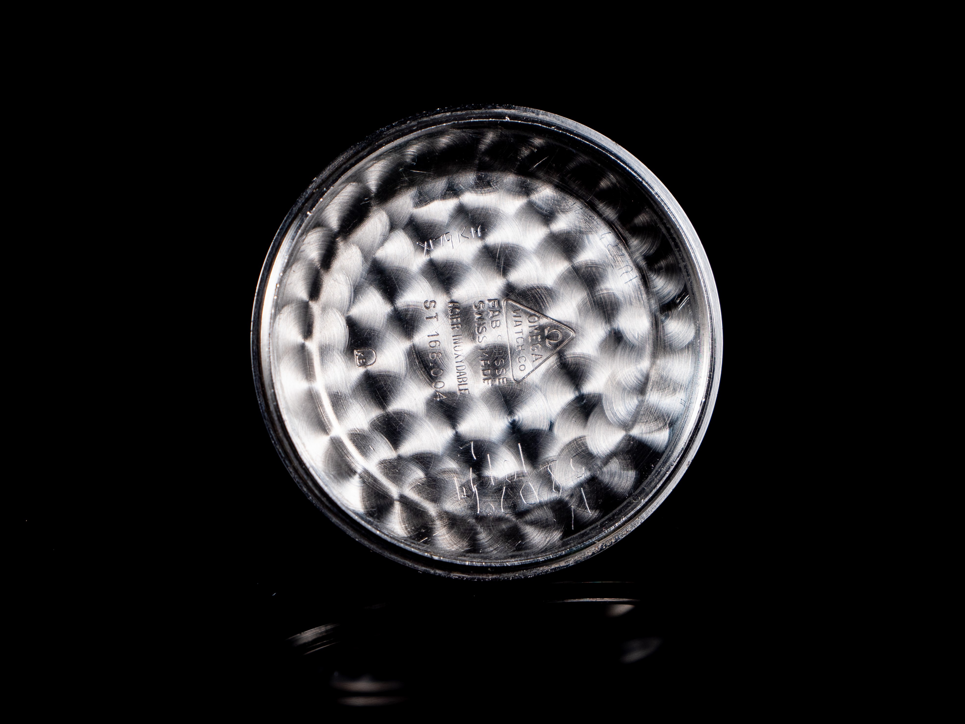 Case: The case has been lightly polished in the past. Most of the original geometry is still present and recognizable. The case also has some dents, most notably on the underside of the case middle side, and on the top of the lugs. A custom sapphire exhibition caseback was installed on this watch, but the original 168.004 caseback will be provided as shown. The caseback has watchmaker's engravings, perlage, and the '168.004' engraving on the interior side. The exterior has been polished at some point, with a scratching visible.