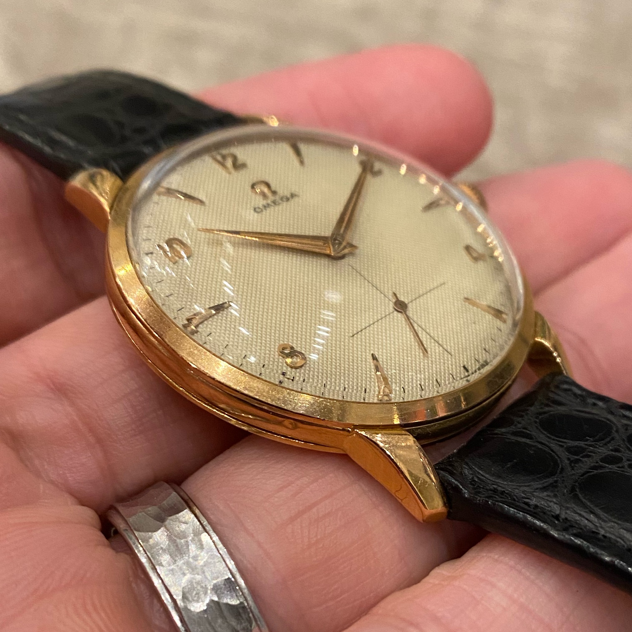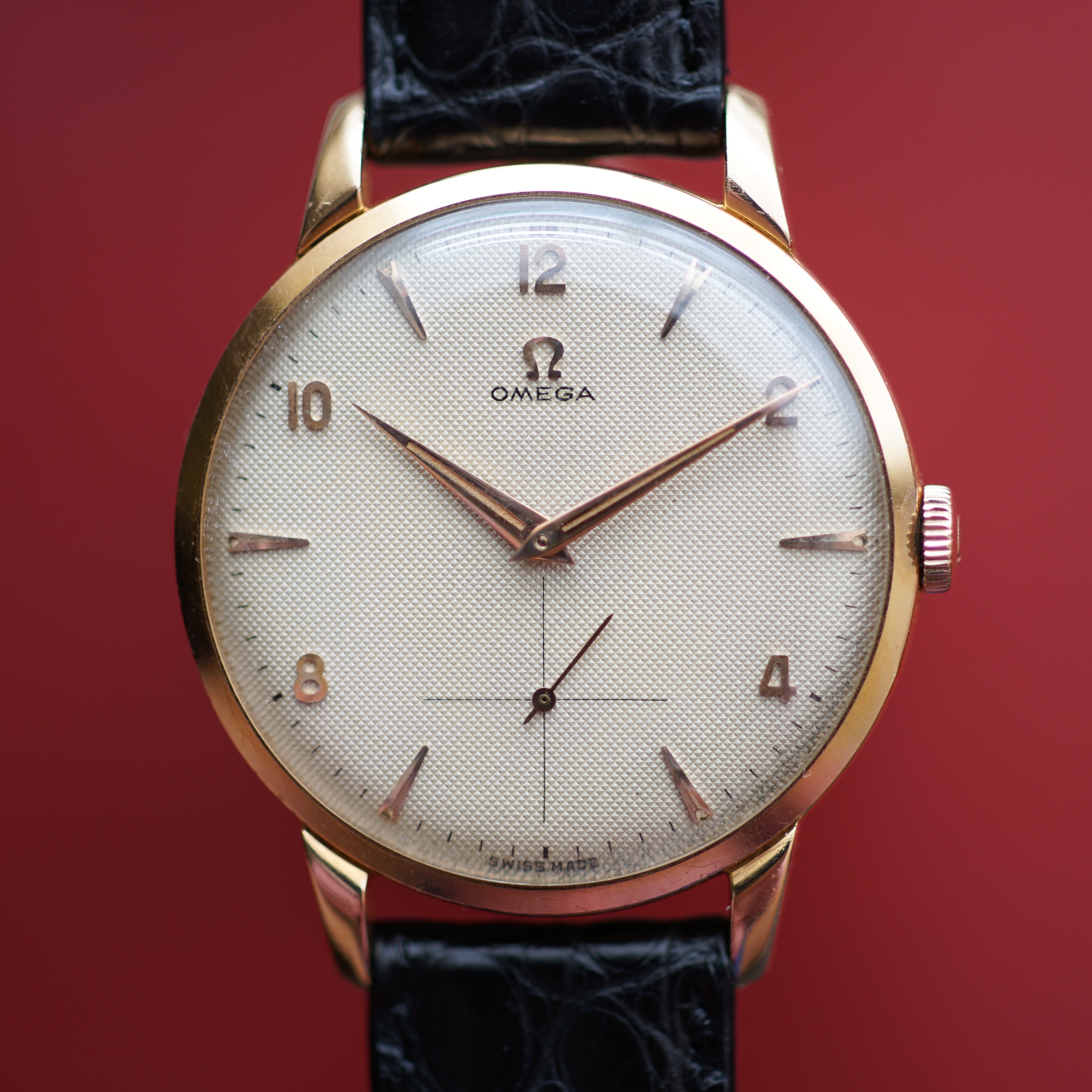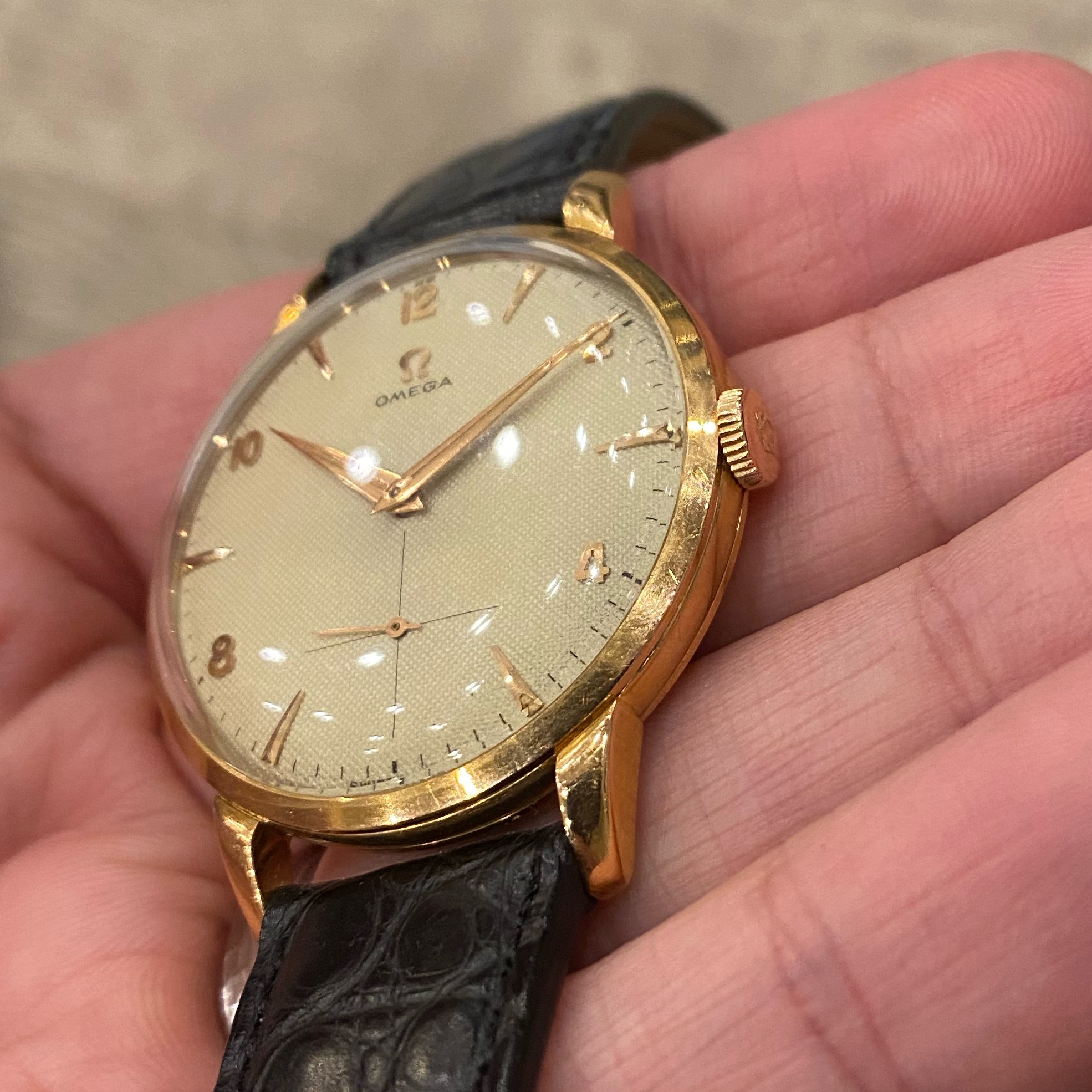 Beautiful original waffle dial with 18k applied dagger markers and Arabic numerals. Lume intact on the dial. Gold dauphine hands with intact beautifully aged lume.