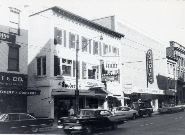 The original location of Dunnette Jewllers (the striped awning) circa 1962