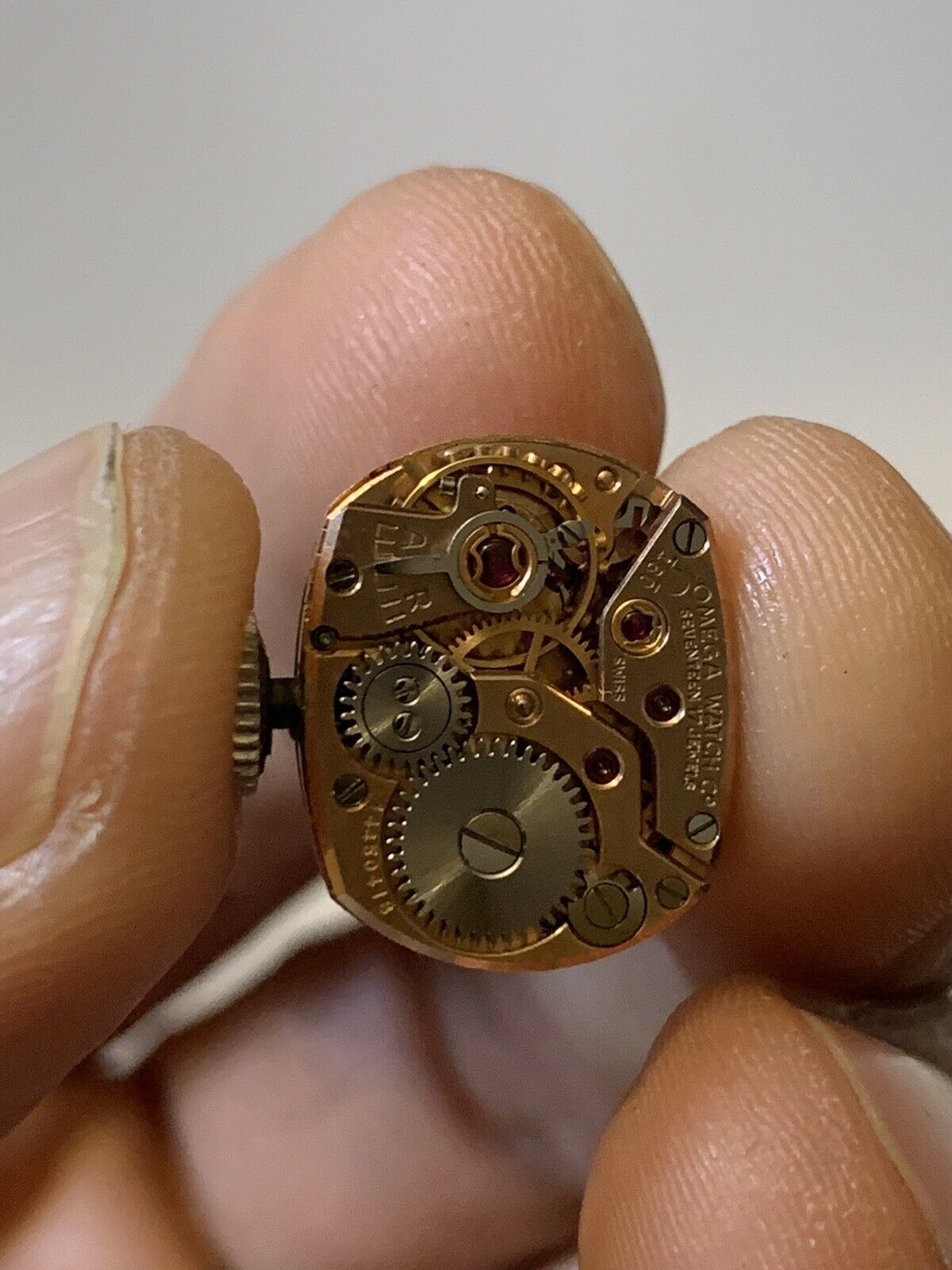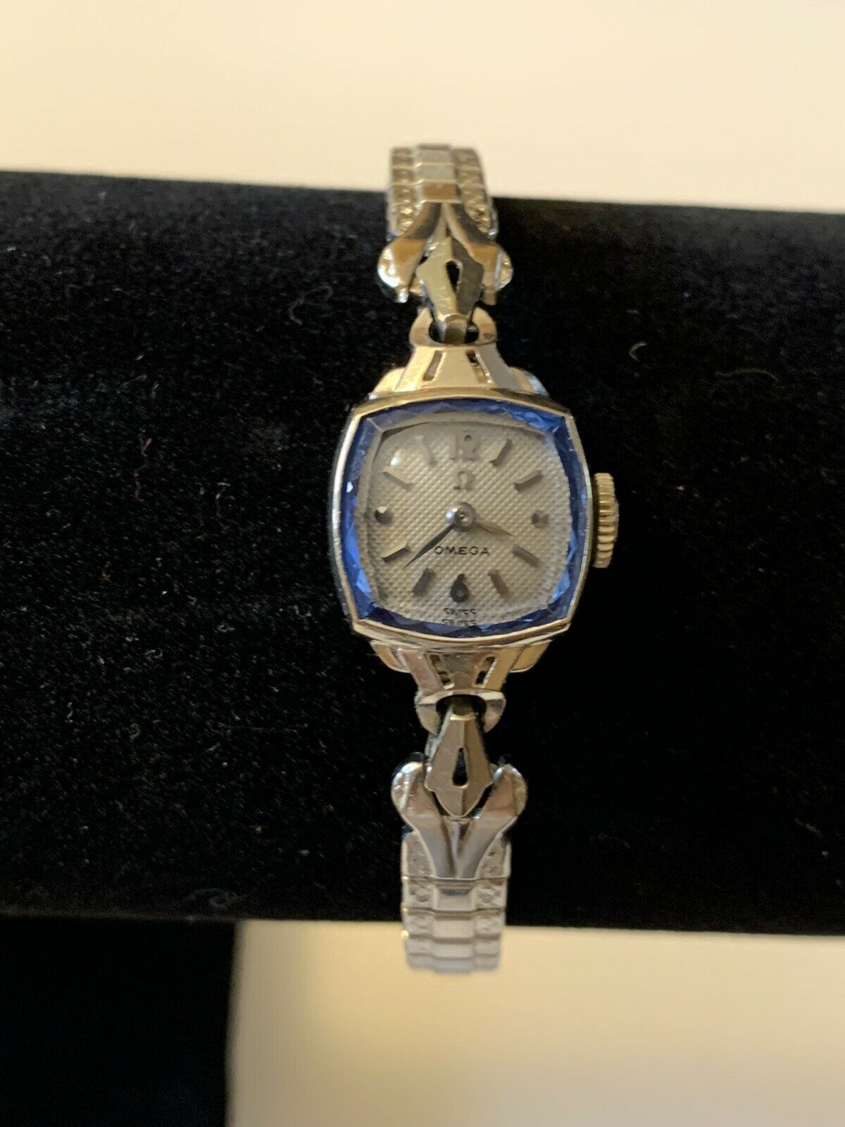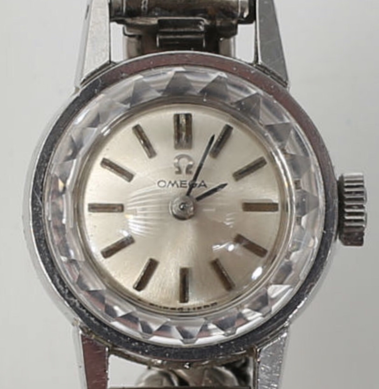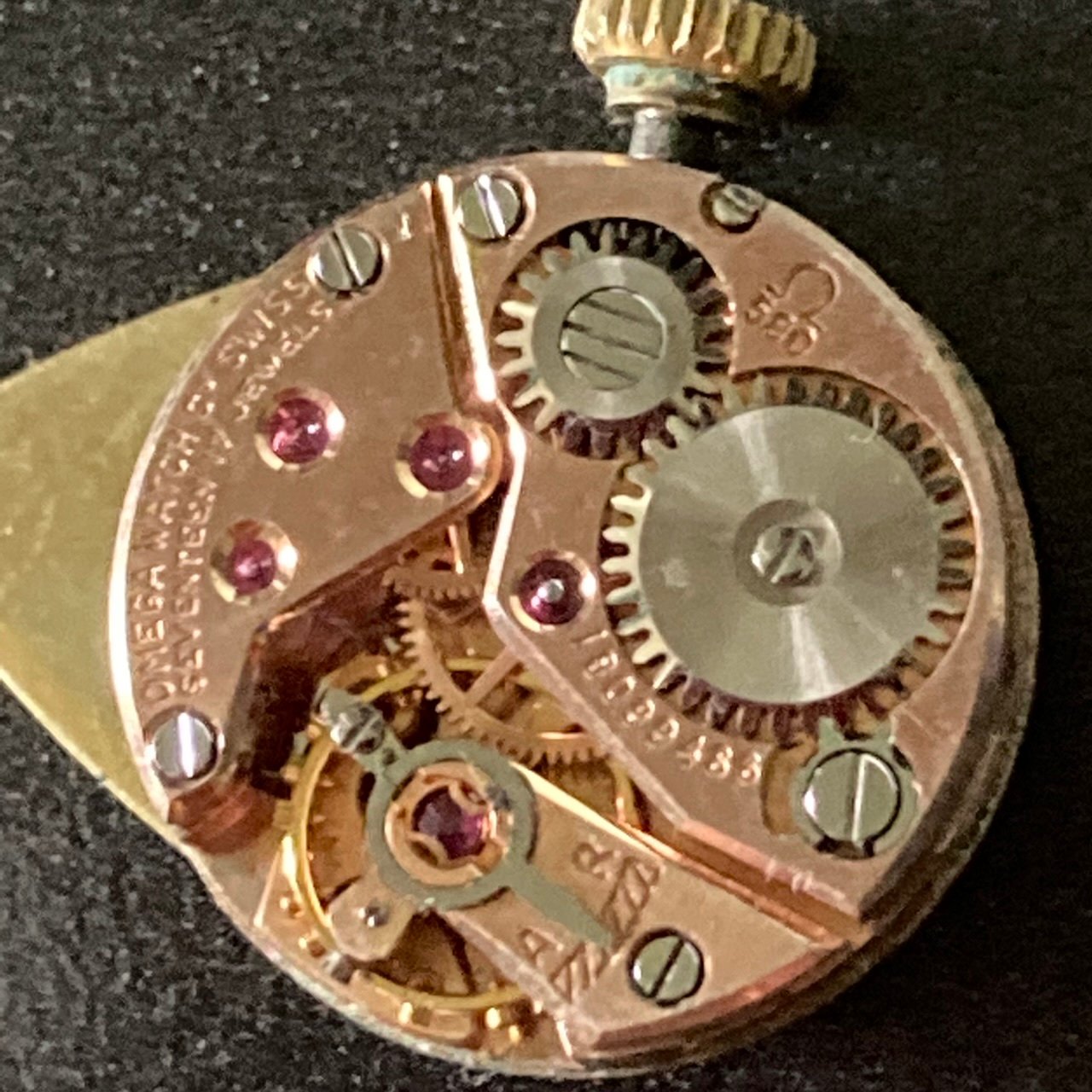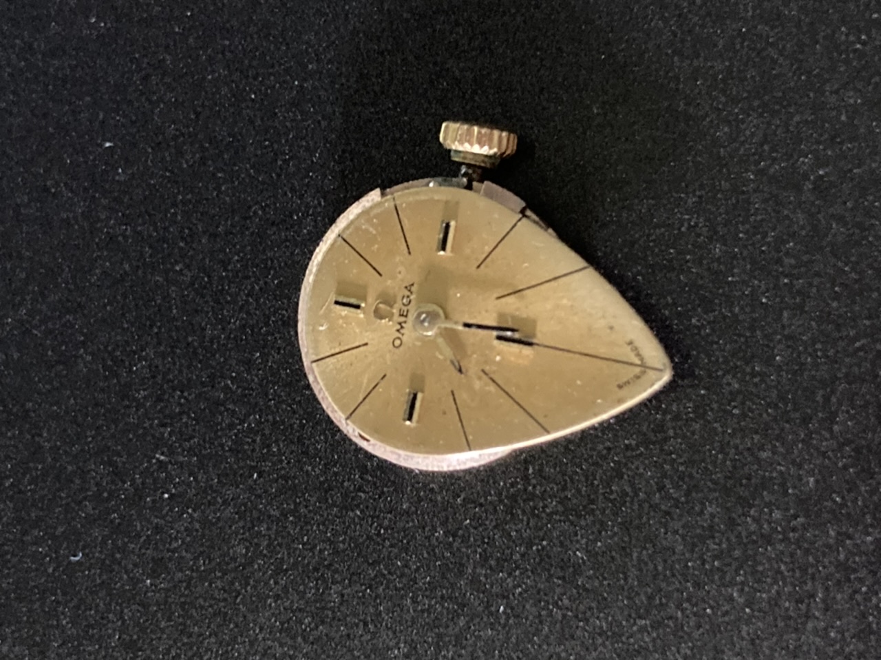 Today I would like your help in identifying this dial and movement that I found in a lot that I won. It’s a cal. 580 handwinder with an extraordinary dial in the form of a droplet, onyx inlays and probably a non-original crown without the omega logo.