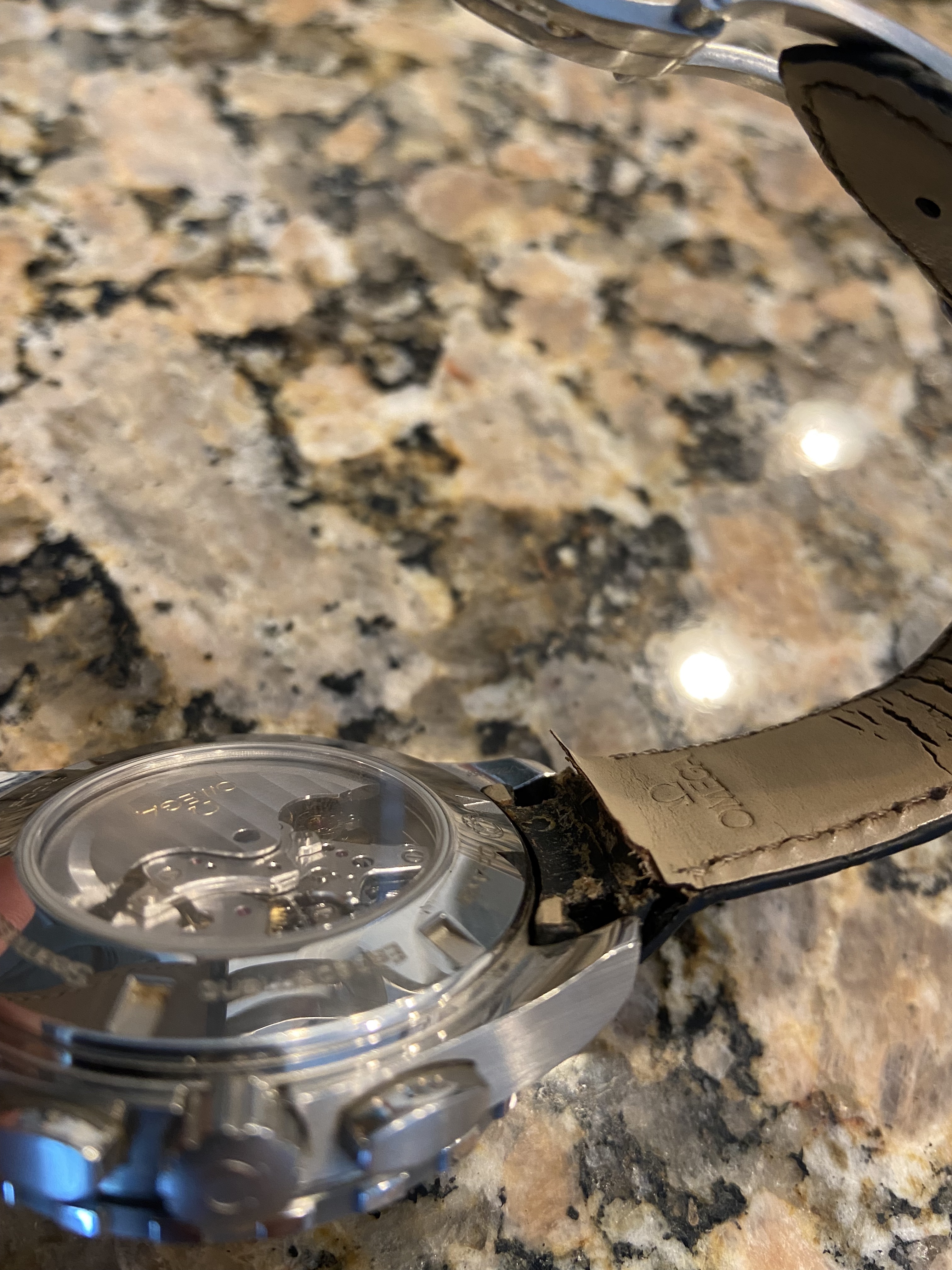 On my Seamaster Auga Terra GMT (with the leather strap 98000309), a replacement strap was purchased from the local OB (USD$395). Yes, it wore it daily. I work in an office setting, I have a sedentary lifestyle, any chance something was going to scratch / ding / touch my SATGMT, it would get removed and put away. Yes, I live in the Southern states in the USA, but, I don't think that after 18 months of wearing my SATGMT the leather strap should start to delaminate. Mind you, I replaced this strap 18 month ago for the very same reason, delamination.