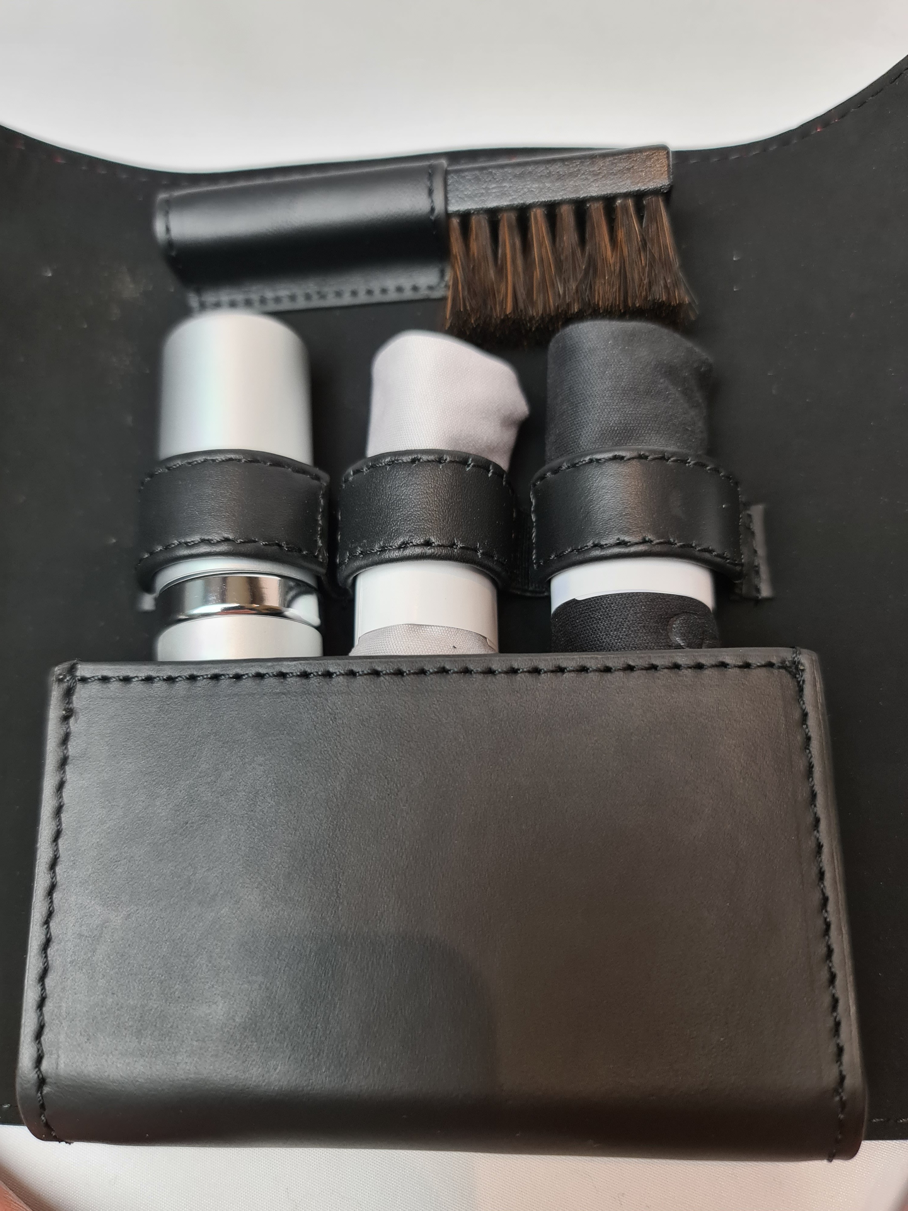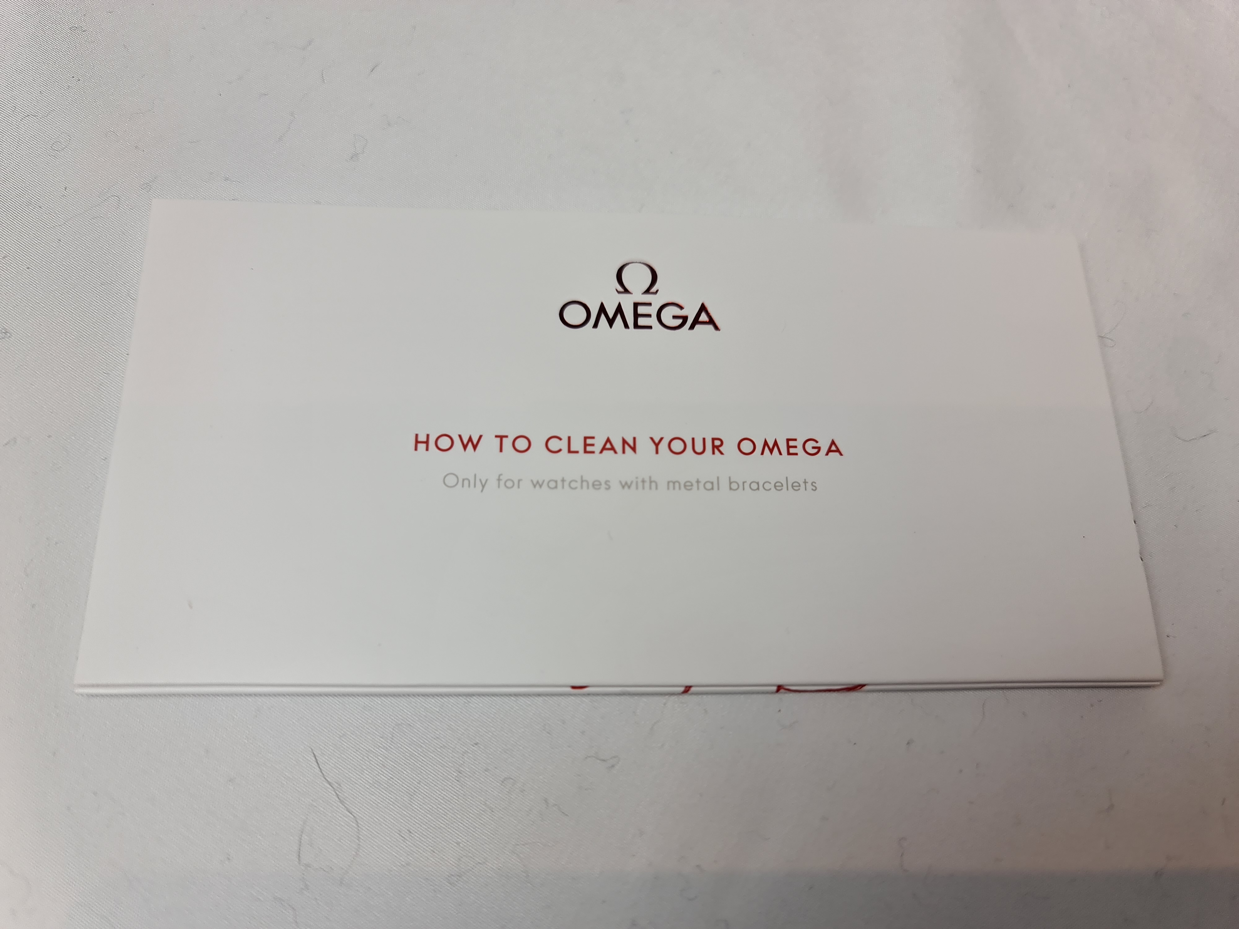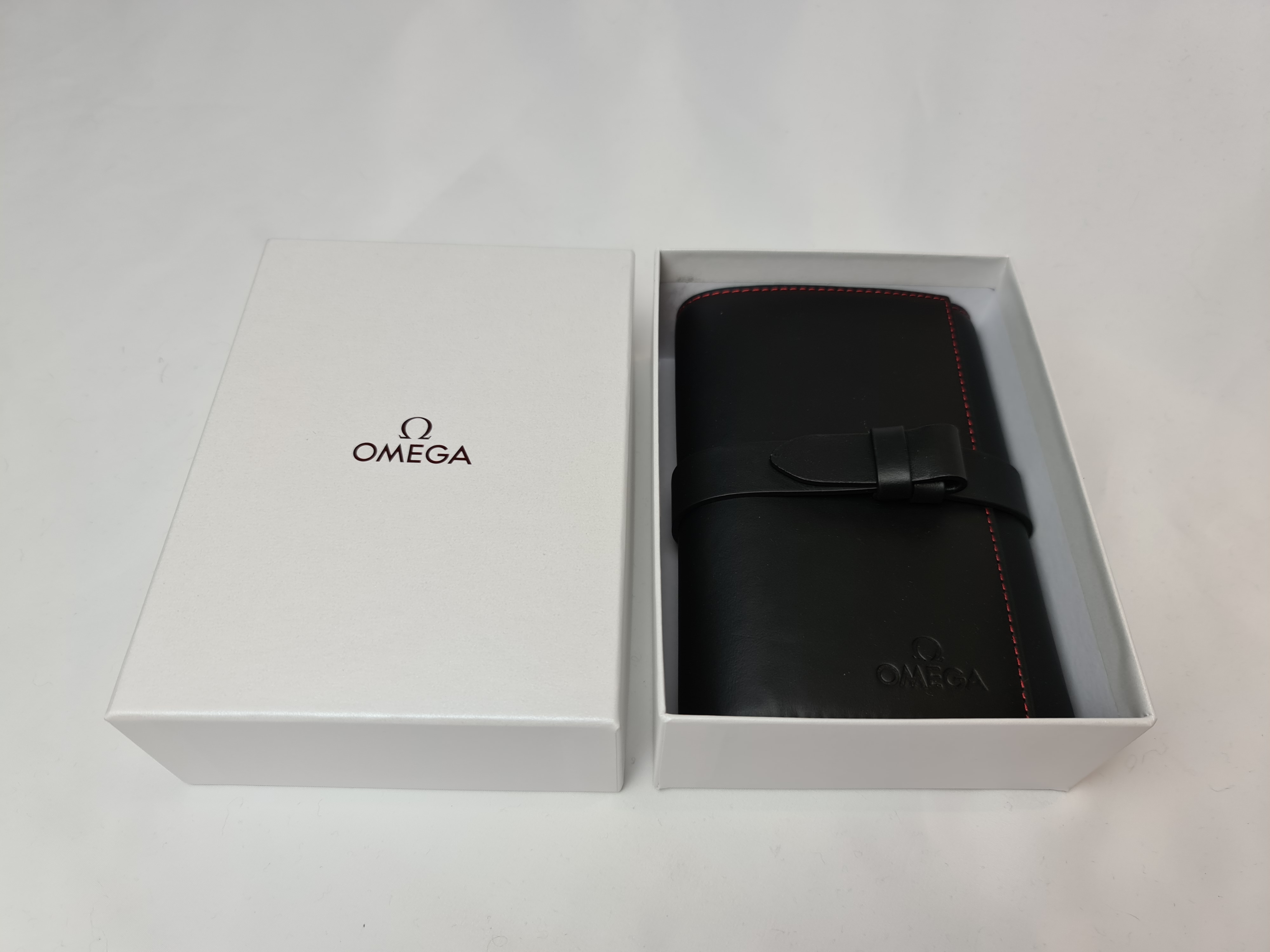 ·For sale is this unused Leather Omega travel watch cleaning kit roll. The leather is embossed Omega. The roll has a leather exterior and a suede interior. The roll accommodates 1 brush, spray bottle and 2 polishing cloths and Omega specific instructions on how to clean your watch. Accompanied by a fitted Omega box. Approximate dimensions: 14in x 6.75 open flat; 5in x 6.75in x 1.50in closed.