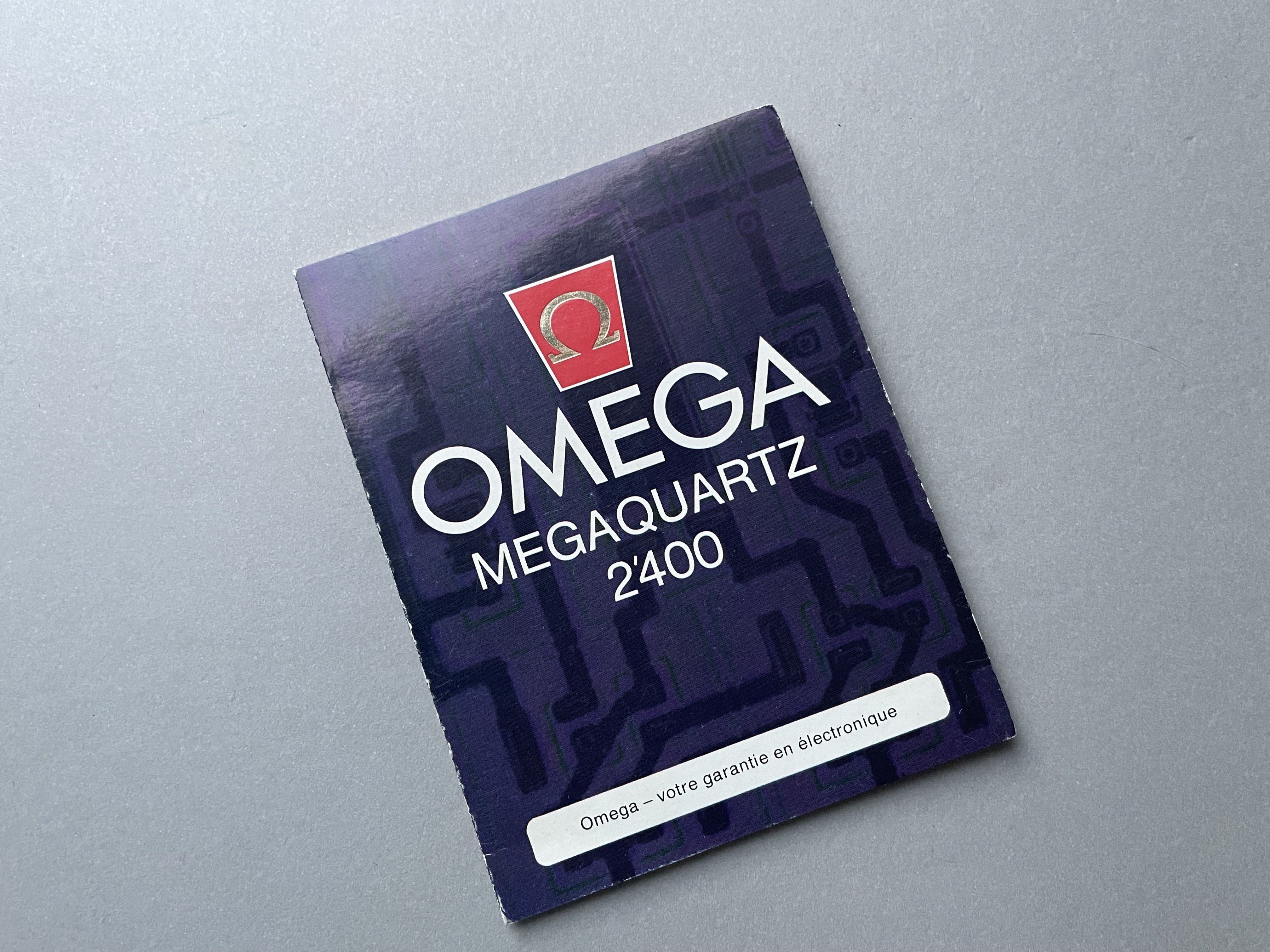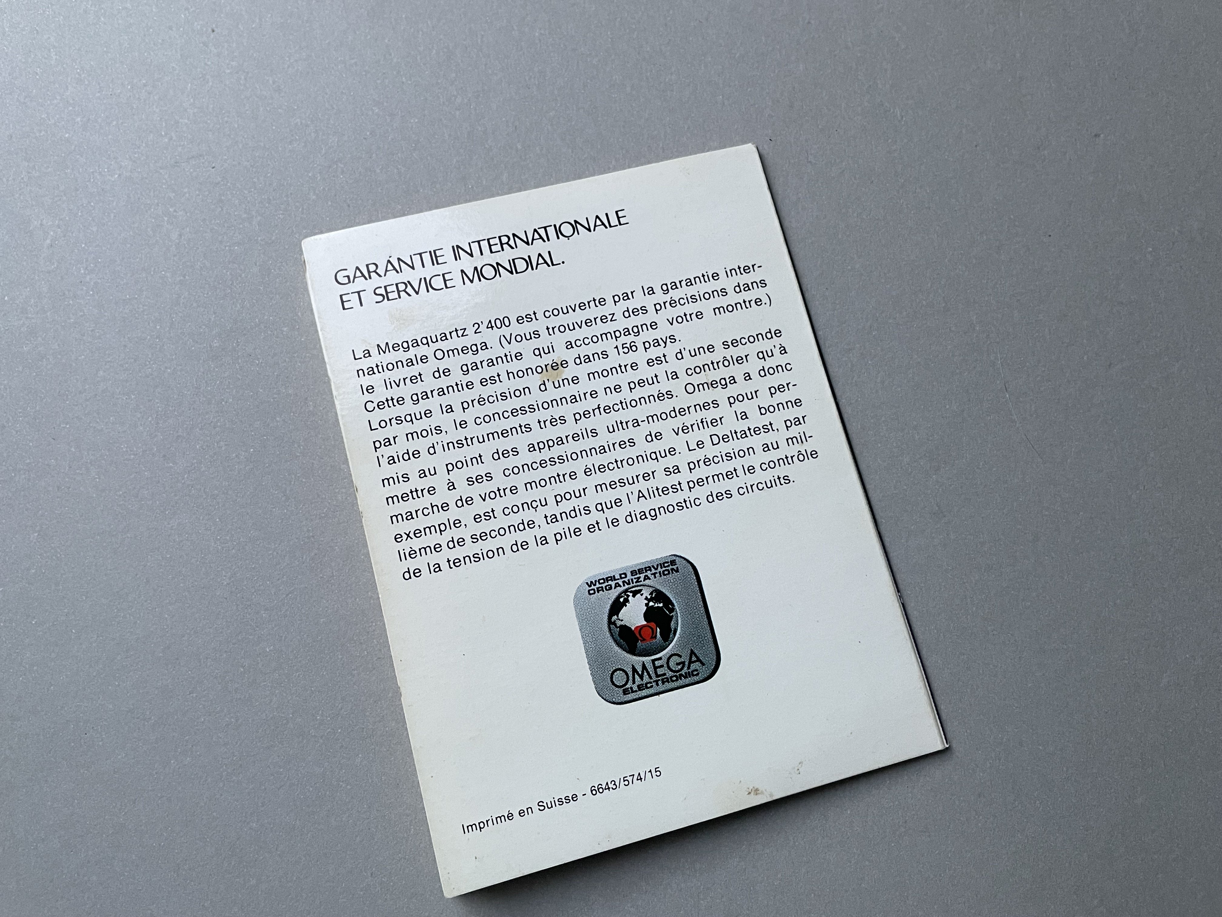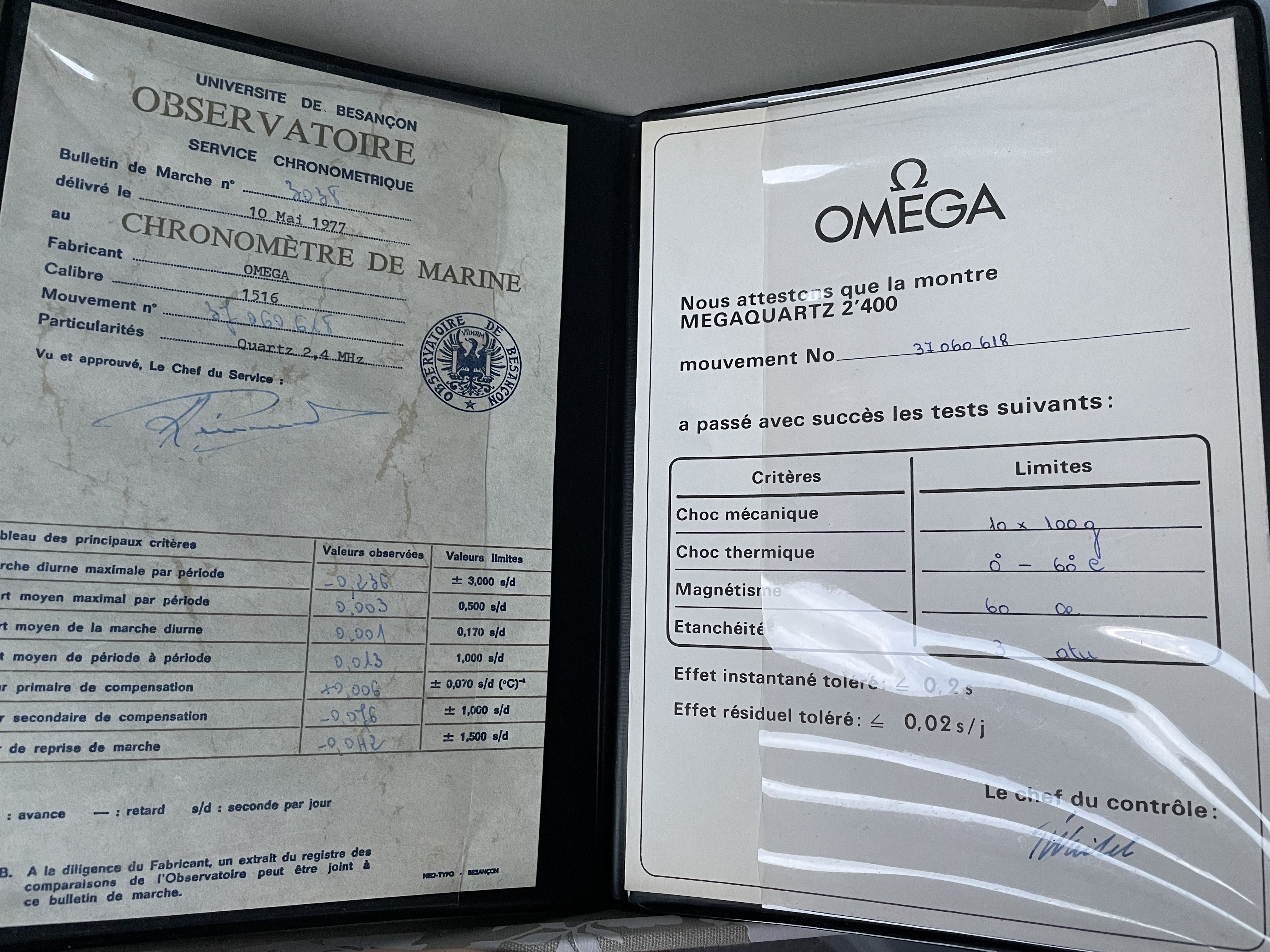 It comes with its original Omega "Votre Garantie En Electronique" black folder with both the Besancon certificate, and the Omega test certificate, along with an Omega Megaquartz 2400 instruction/guarantee brochure.