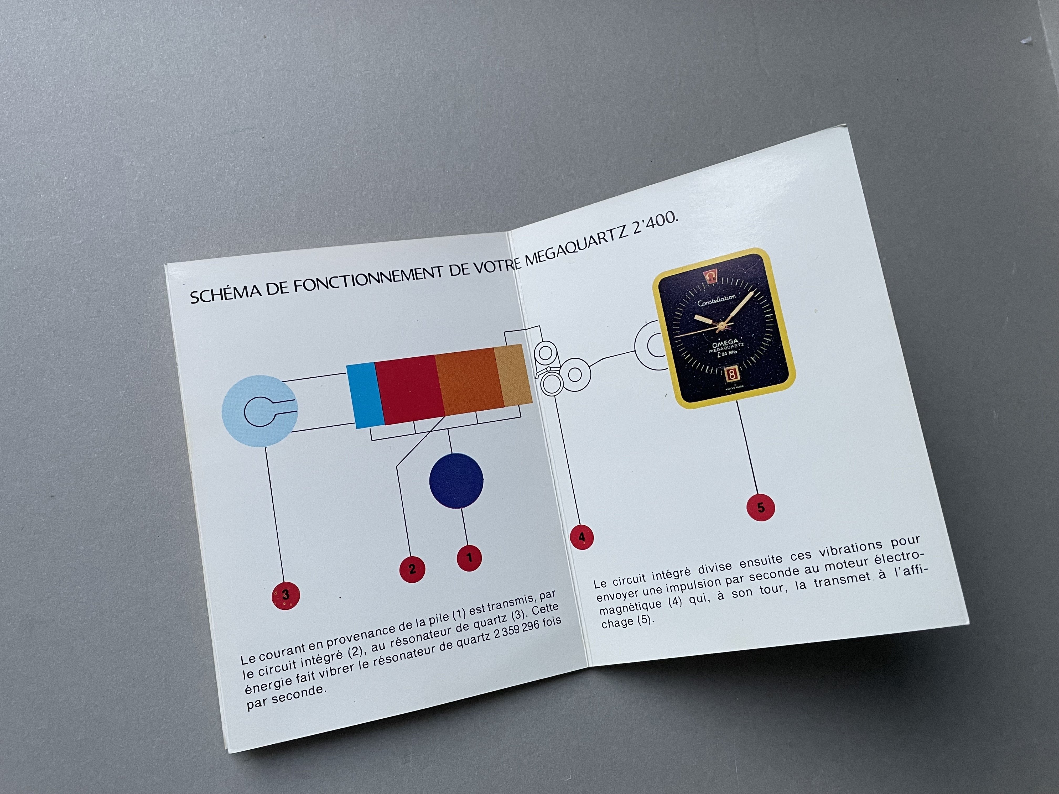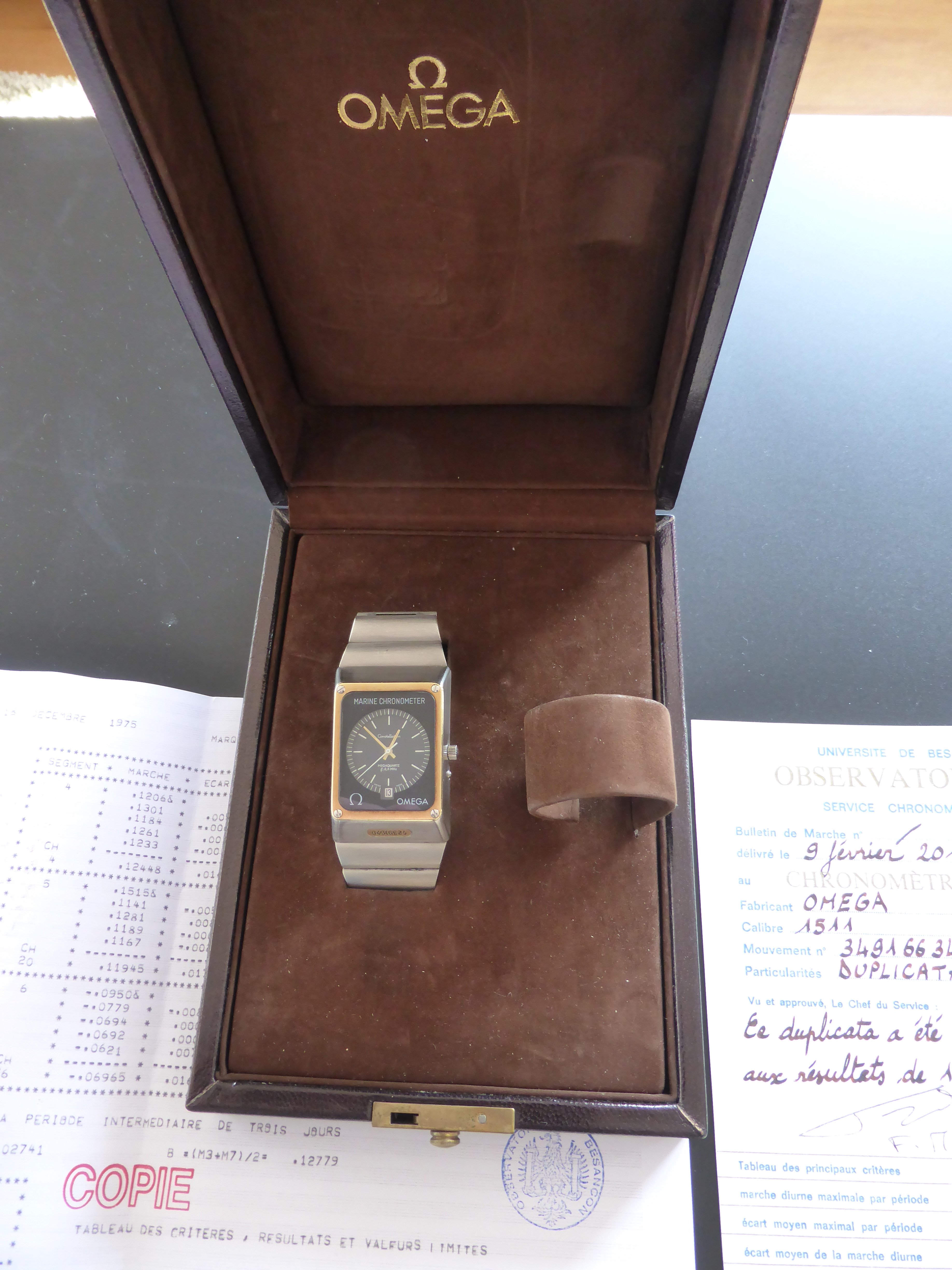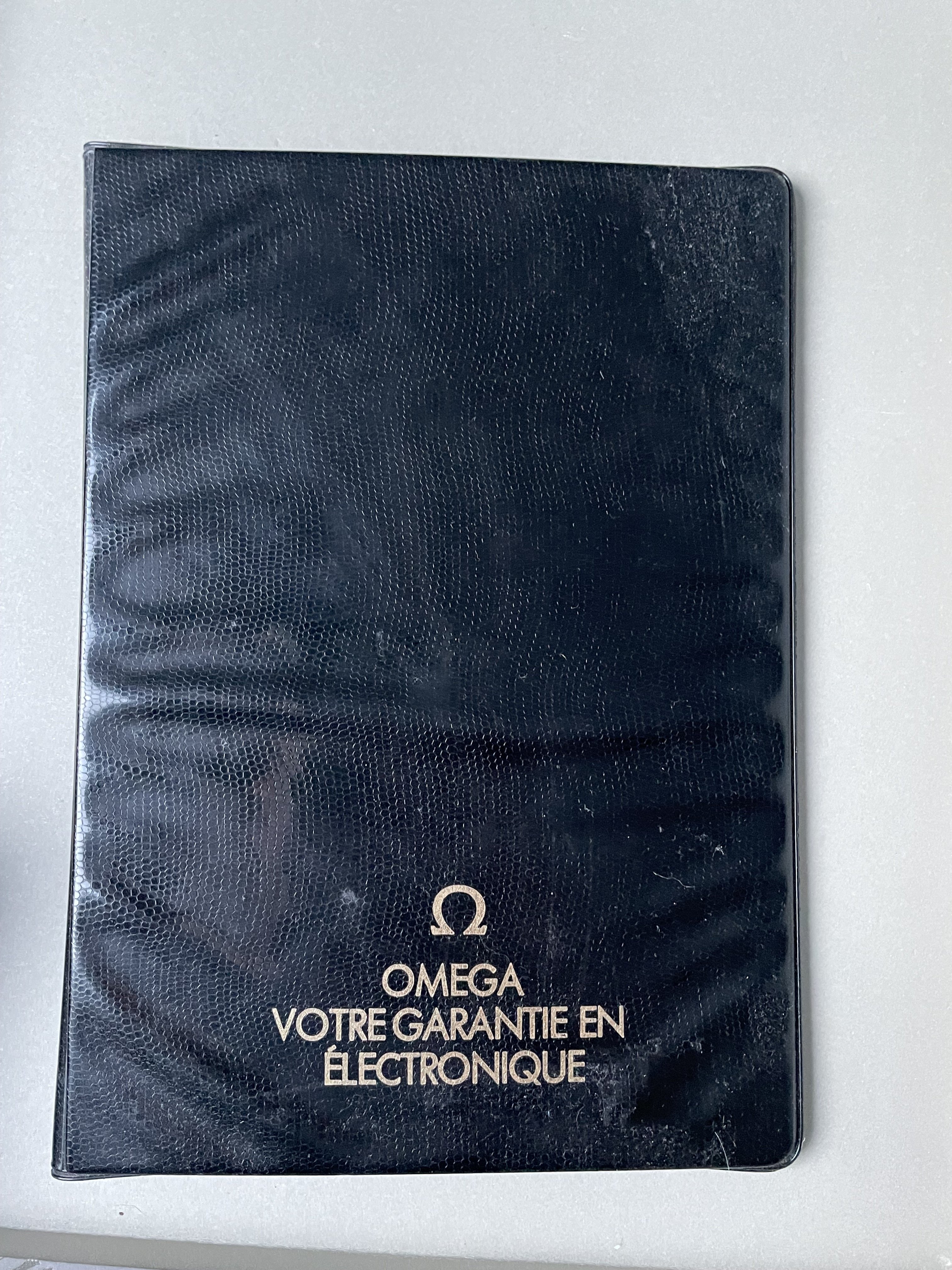 It comes with its original Omega "Votre Garantie En Electronique" black folder with both the Besancon certificate, and the Omega test certificate, along with an Omega Megaquartz 2400 instruction/guarantee brochure.