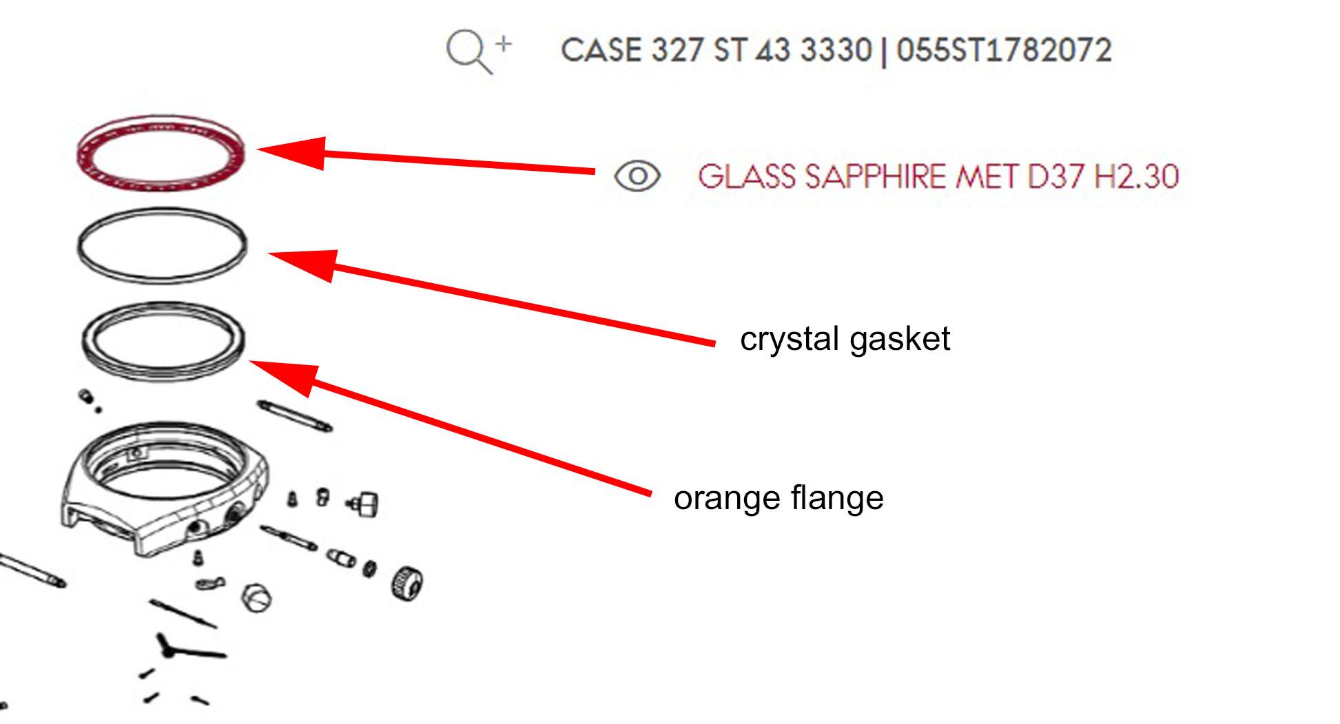 Top arrow points to the crystal, second to the crystal gasket, and the bottom to the orange flange. There's no "white ring" in this watch anywhere.
