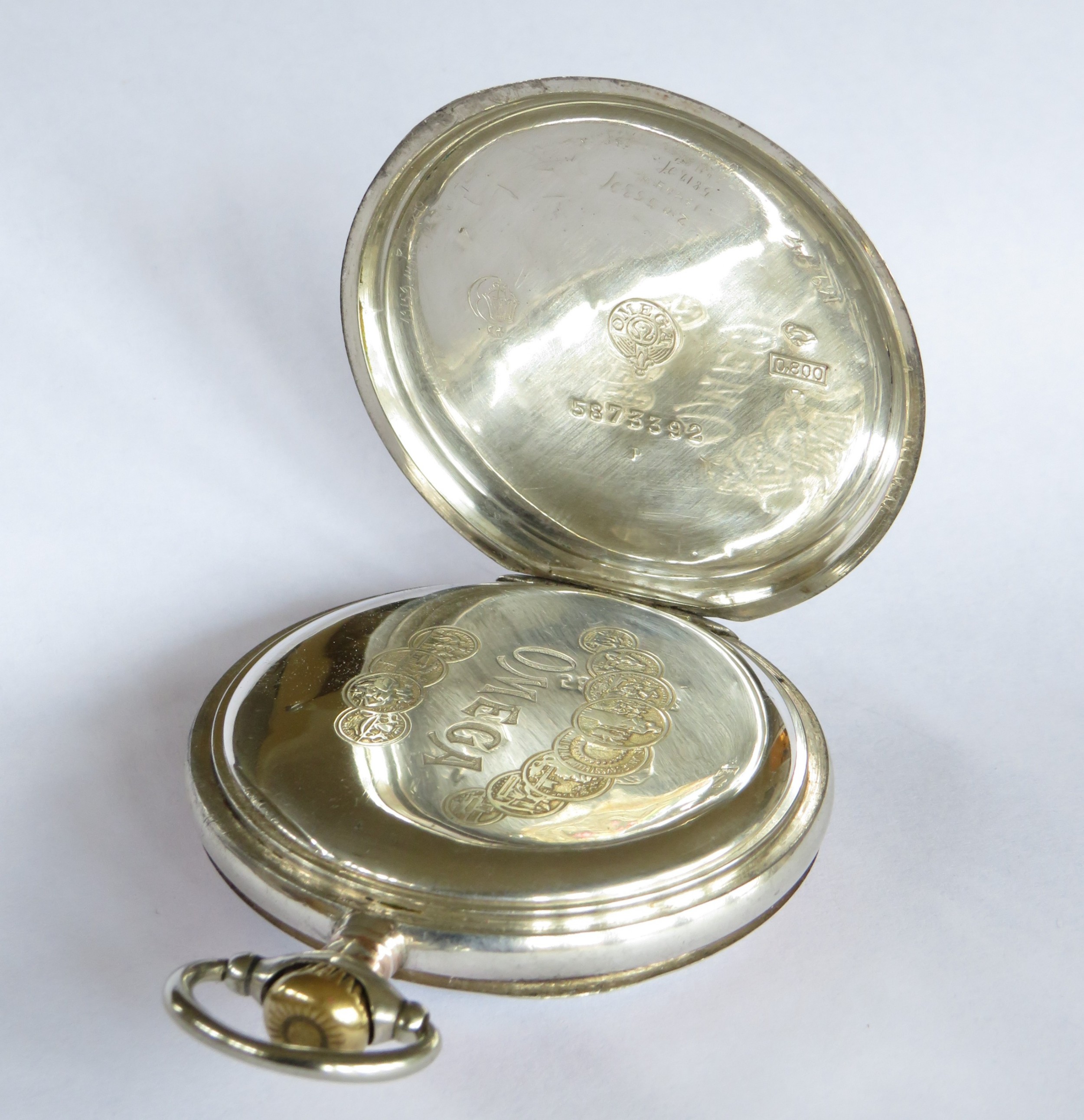 In terms of the watch it's a 1916/17 pocket watch (dealer says so and serial number agrees) (think movement is 19''' lepine orientation but I'm not sure how many jewels.) Hallmarks are interesting, swiss 0.800 silver with the German moon and crown (believe may have gone through Germany but may have not - got that from a well reference article on hallmarks - David Boettcher). There is a case number but I'm not sure if there are databases for those of this age.