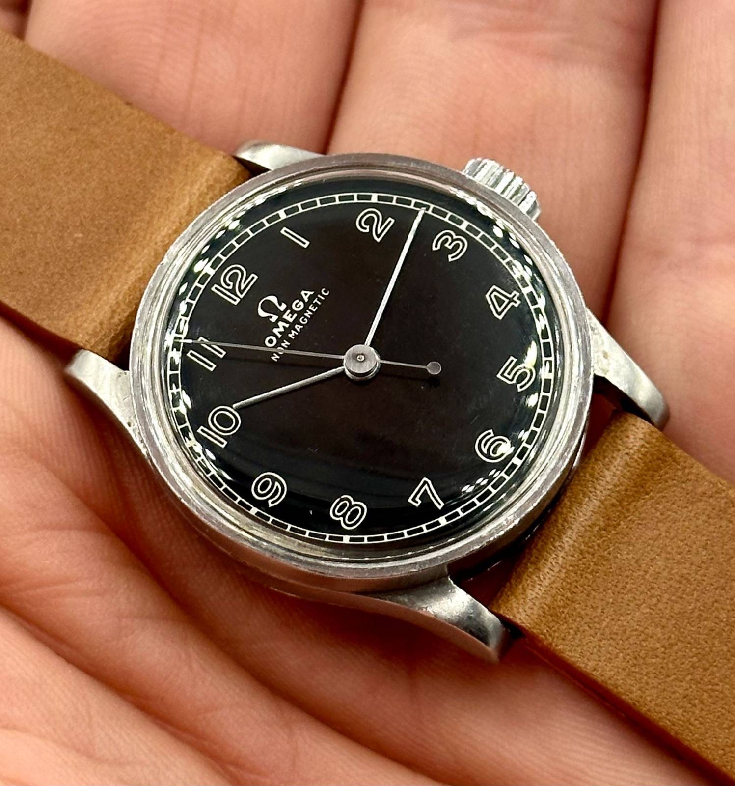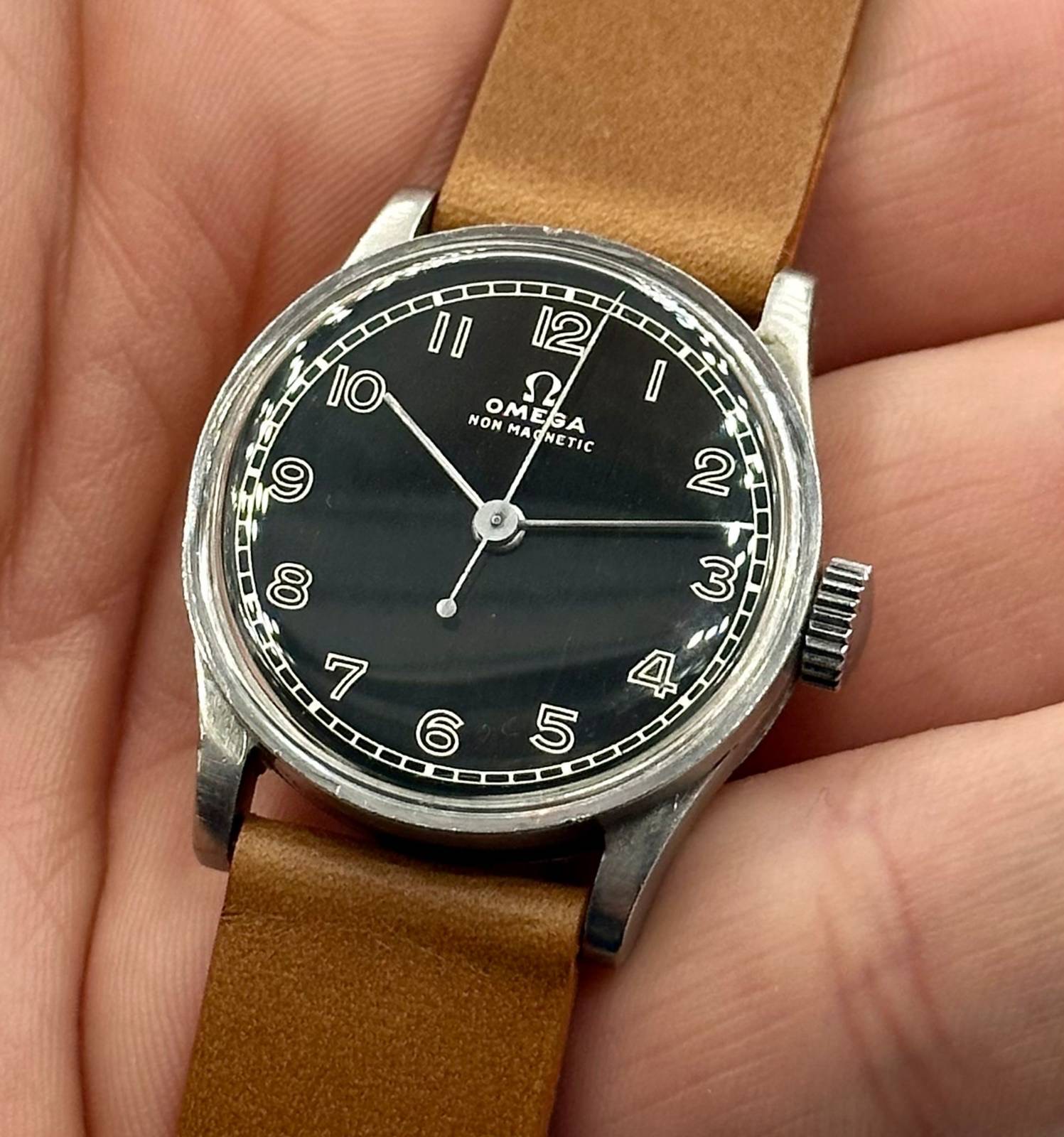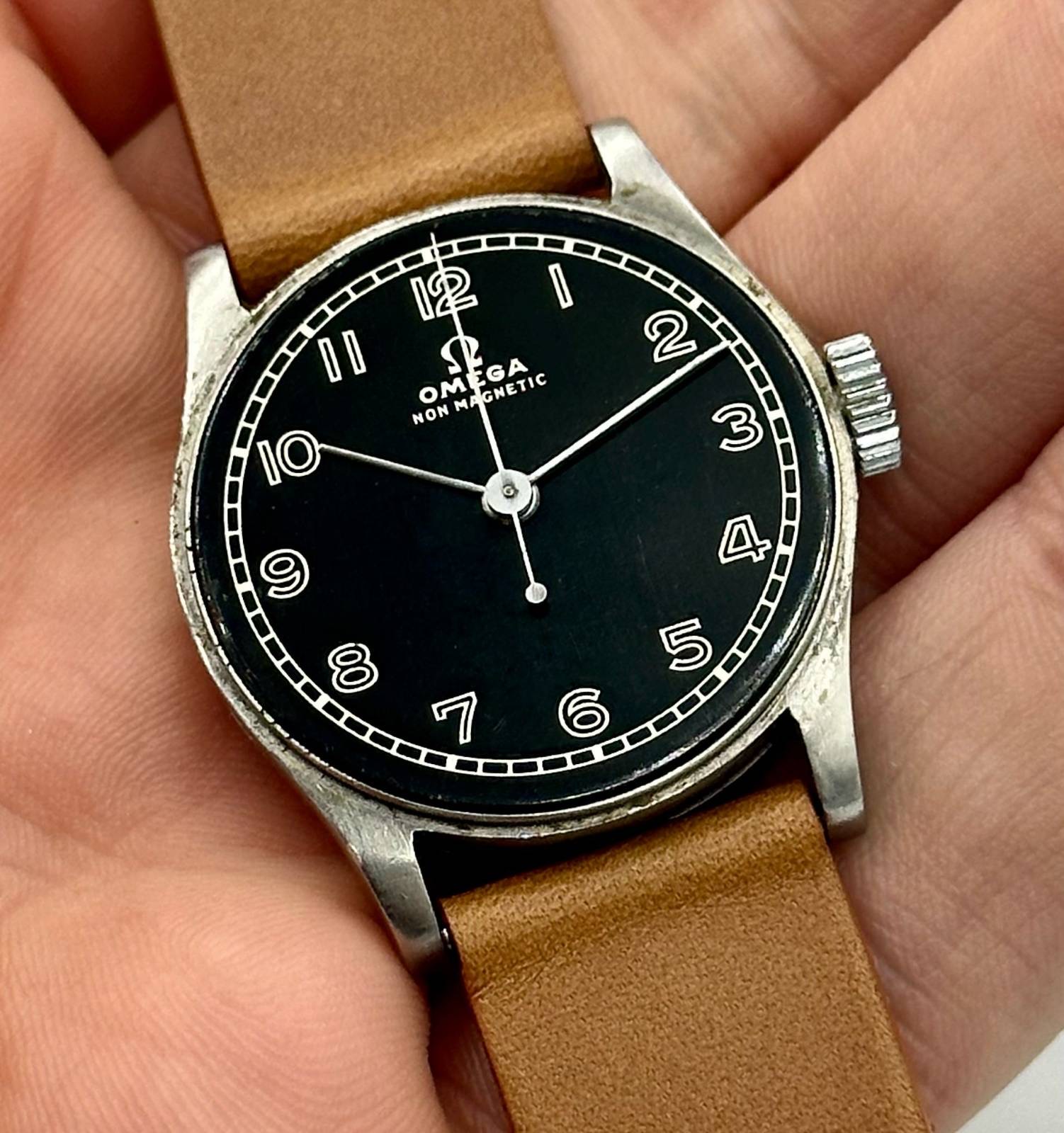 I've done my best, and I *think* it's legit, as I can see black paint above the white (metal??) filled numerals unerneath the paint. I did a comparison with another known (and slightly bigger) gilt dial in my collection - a Mulco. I think I can also see spots of rust on the gilt aspects of the Omega as I do with the Mulco.