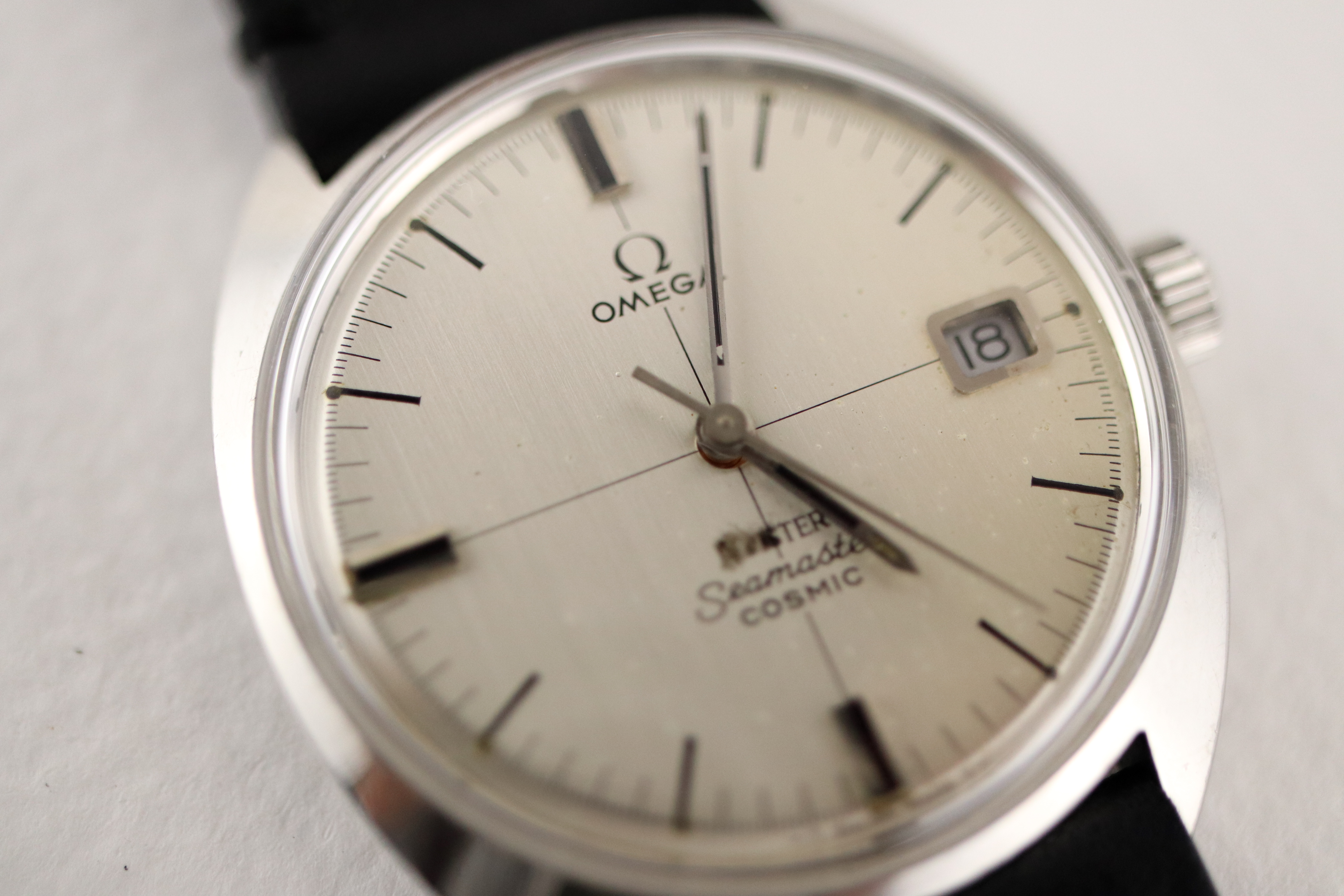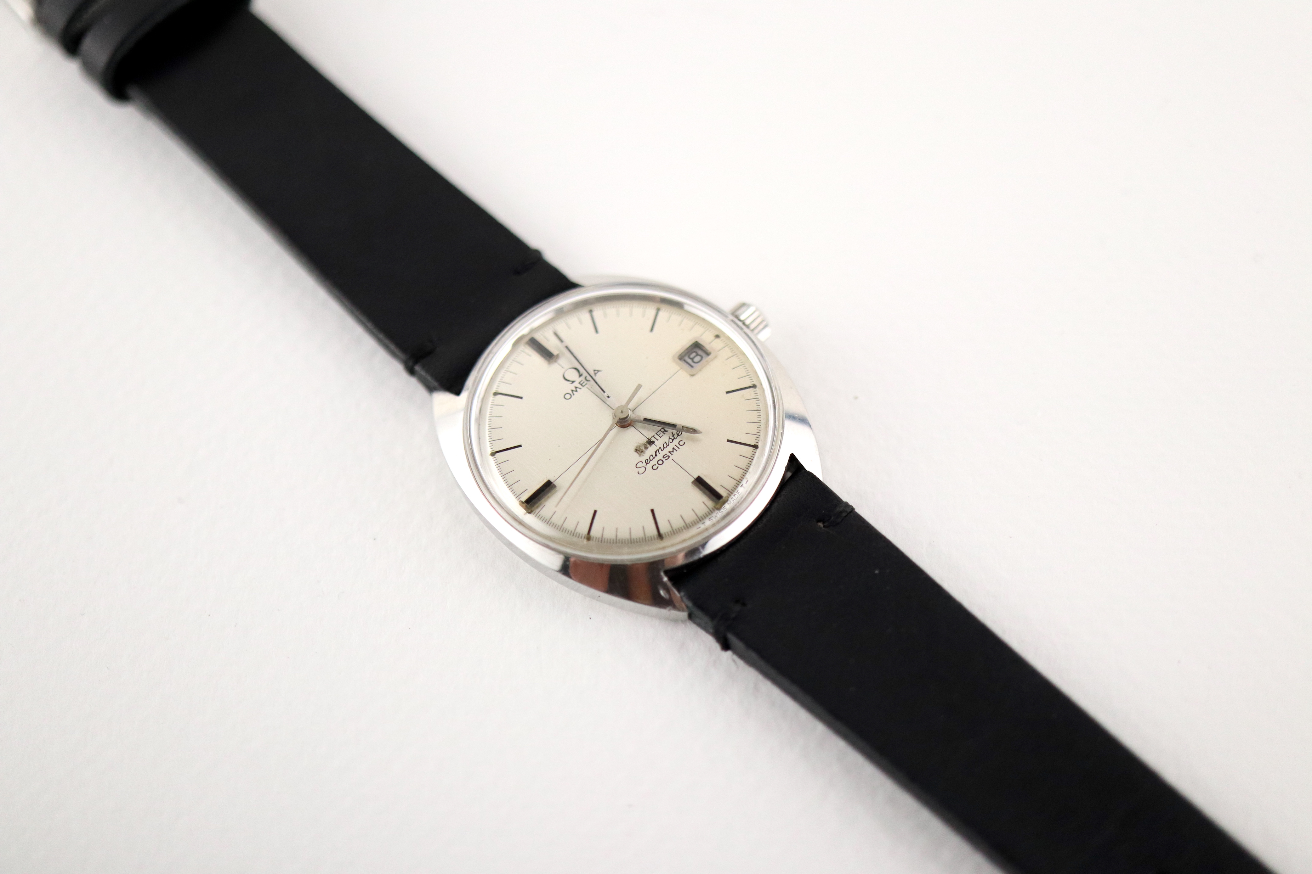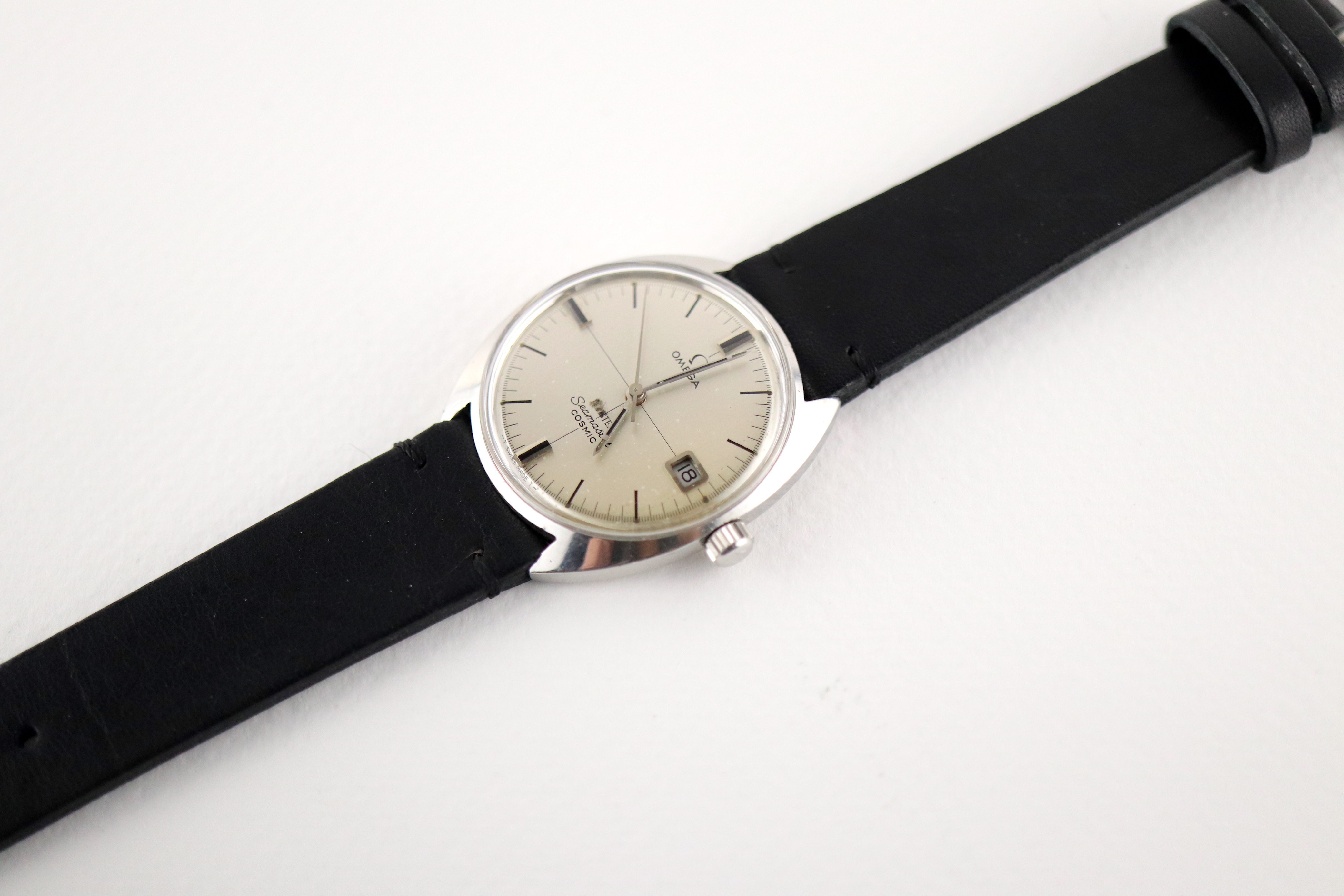 ·For sale, I have an Omega Meister Seamaster Cosmic reference number 136.017. It has the Caliber 613 which is a manual wound movement. The case has some dings and scratches and appears to have been polished in the past. Watch has just been serviced and comes with a 2-year warranty. The dial has some issues with the main one being the Meister print. The first four letters have been rubbed off. The watch will come with your choice of either a new Brown or Black leather strap. You can also have a bracelet for an additional fee if you like. If you need more pictures let me know.