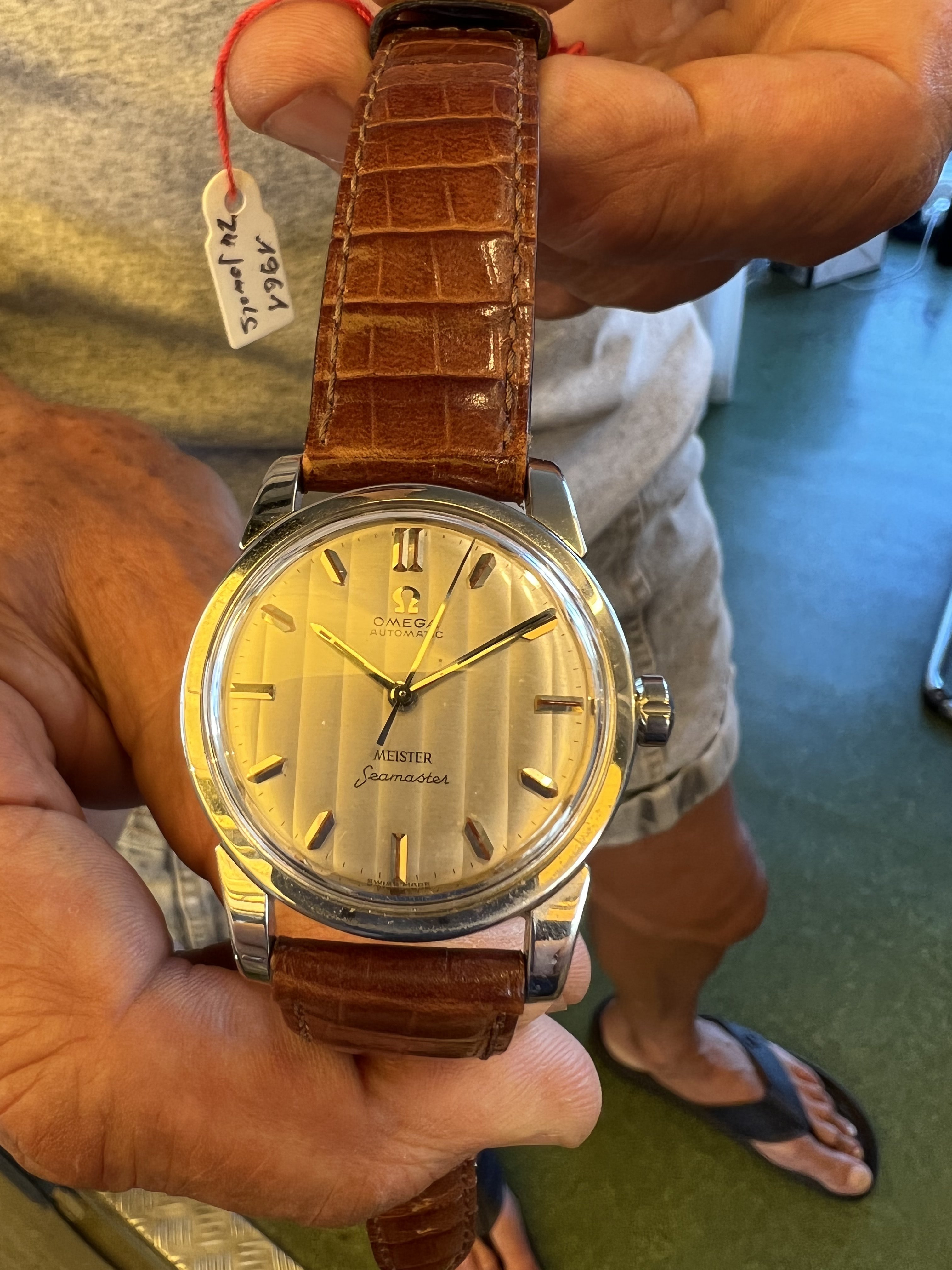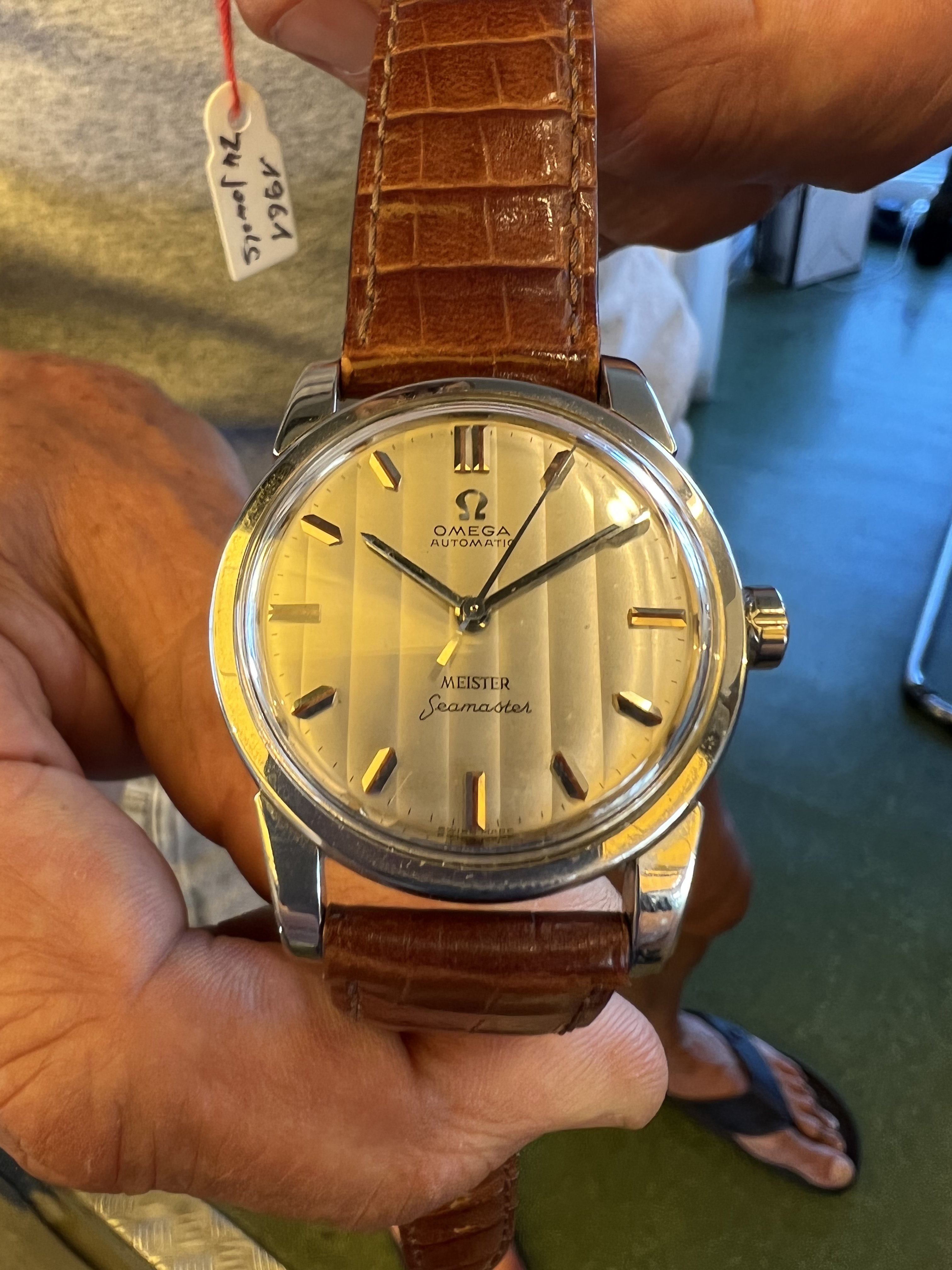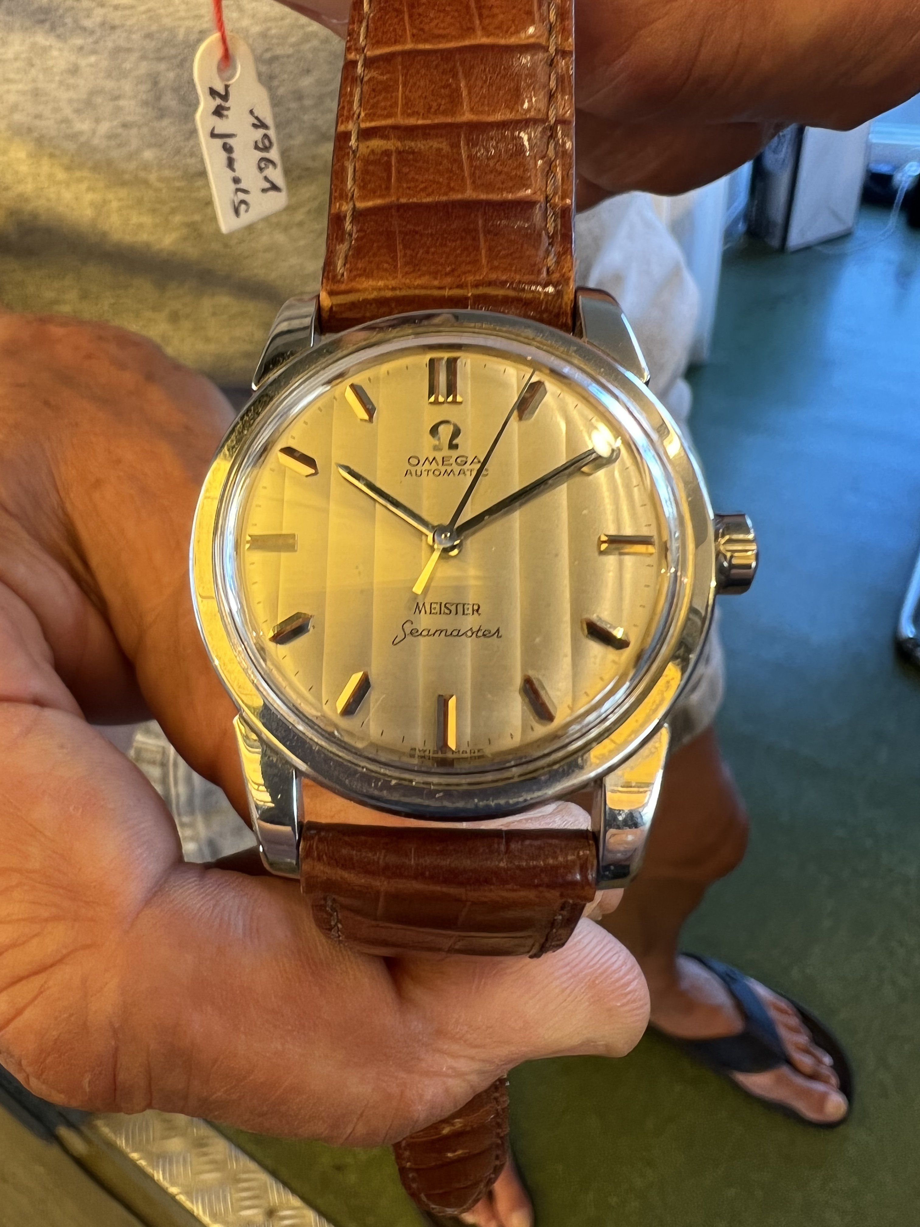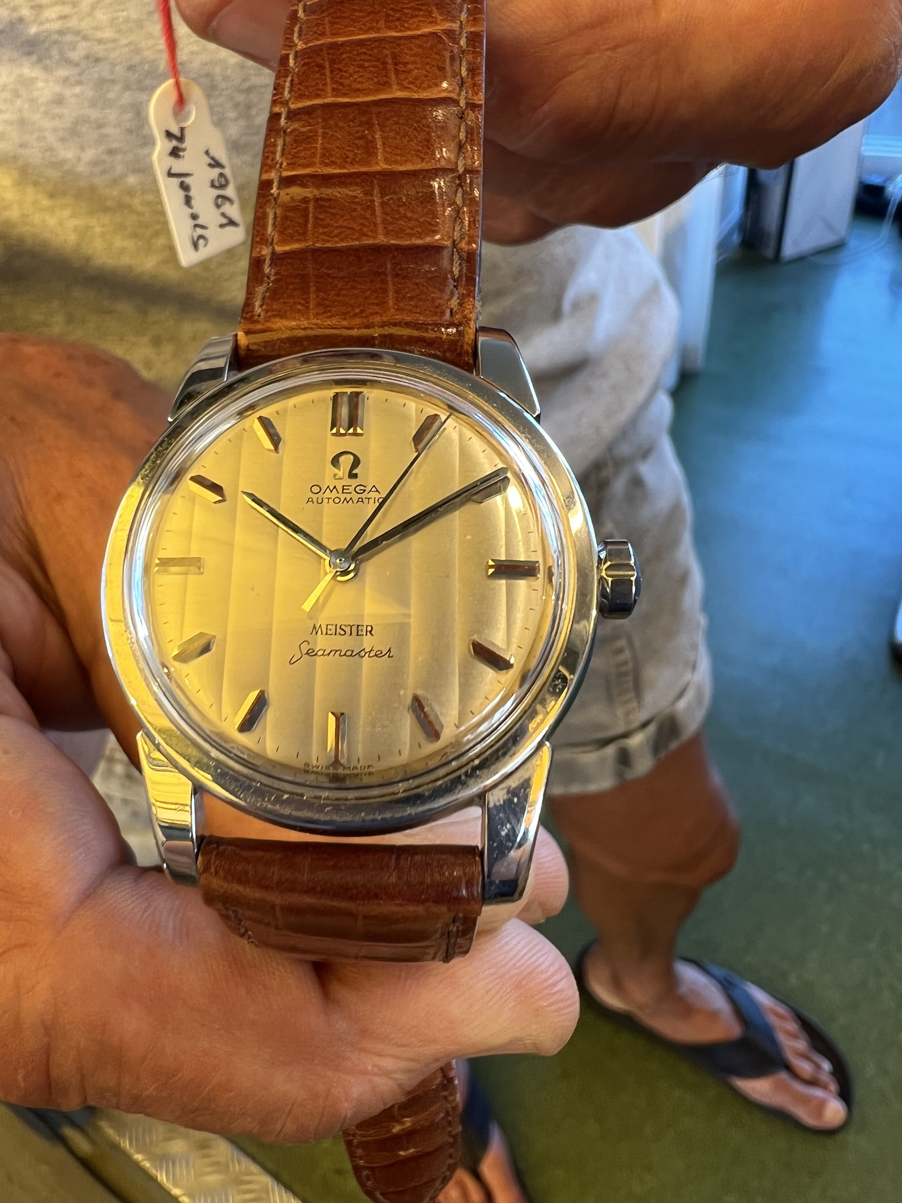 路Hello OF gurus please help assessing this 1961 cal 552 Seamaster signed Meister with unusual vertical texture dial, fat indices. Very clean looks like some polishing in past??, looks like original or early replacement crown. Pictures taken in yellow light best I could do at the small shop. Dial is very pleasing creamy white in person. I know these were co-signed by Zurich retailer (like Turler)