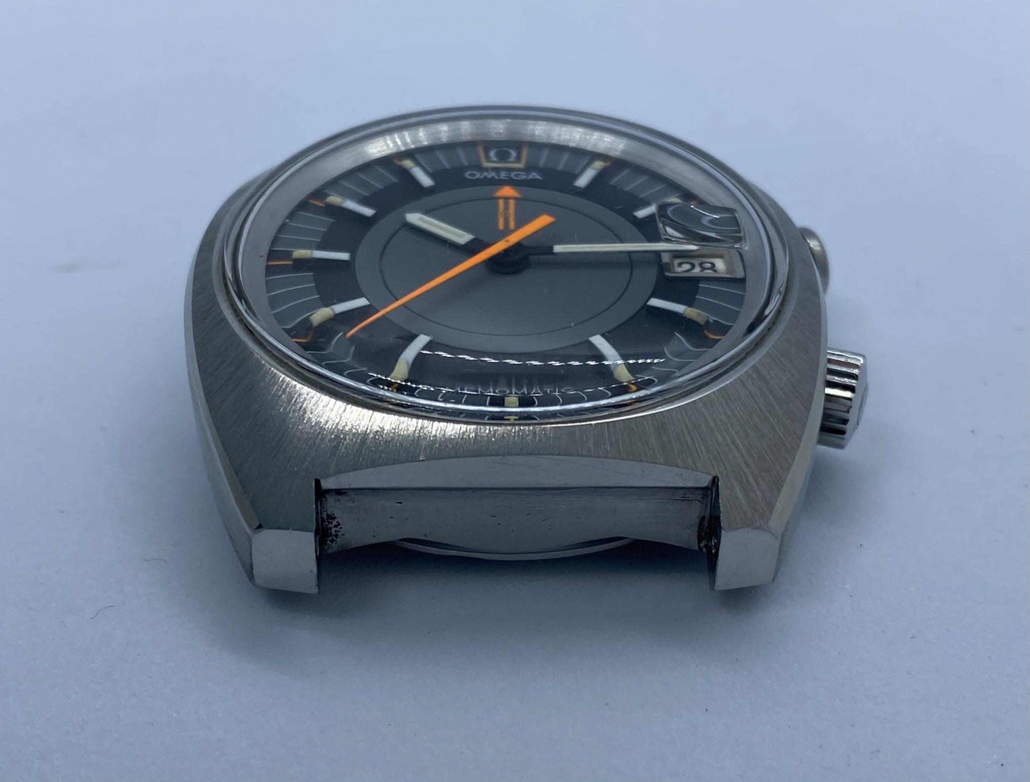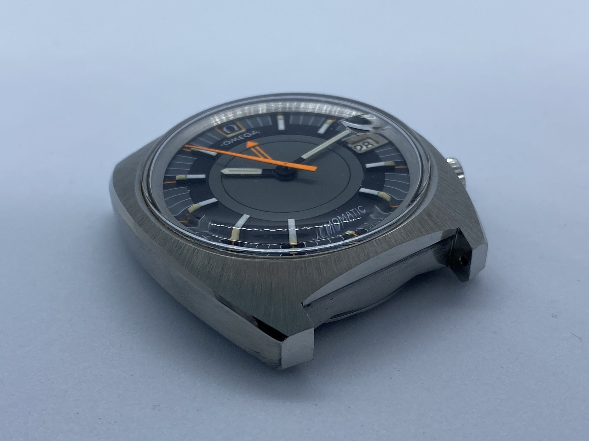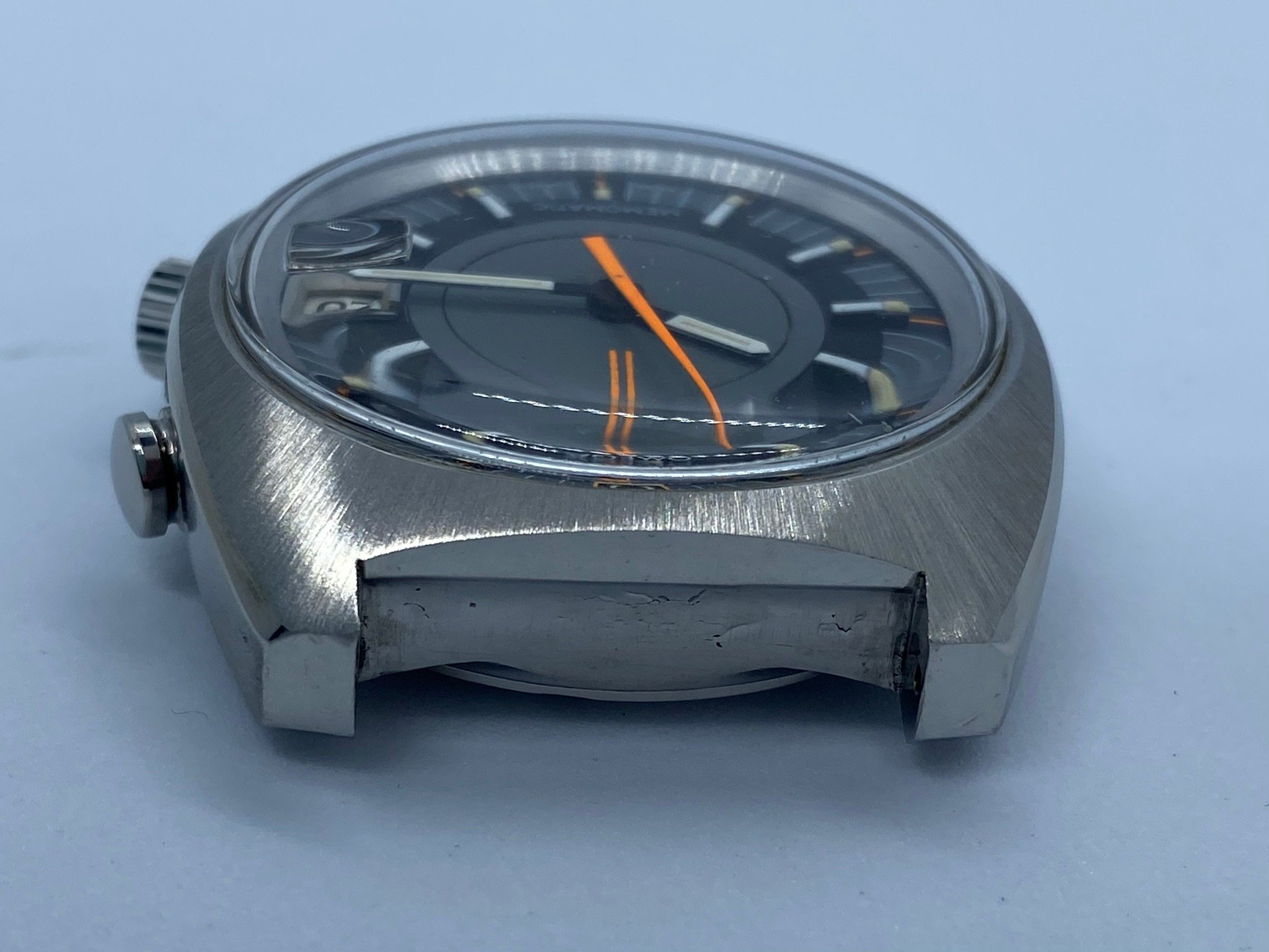 Dial: Original, non-refinished, even under the magnifying glas I can't spot any blemished whatsoever. What you might see in the pictures is dust/minute scratches on the plexi. Same goes for the hands, the lume and the bright orange accents.