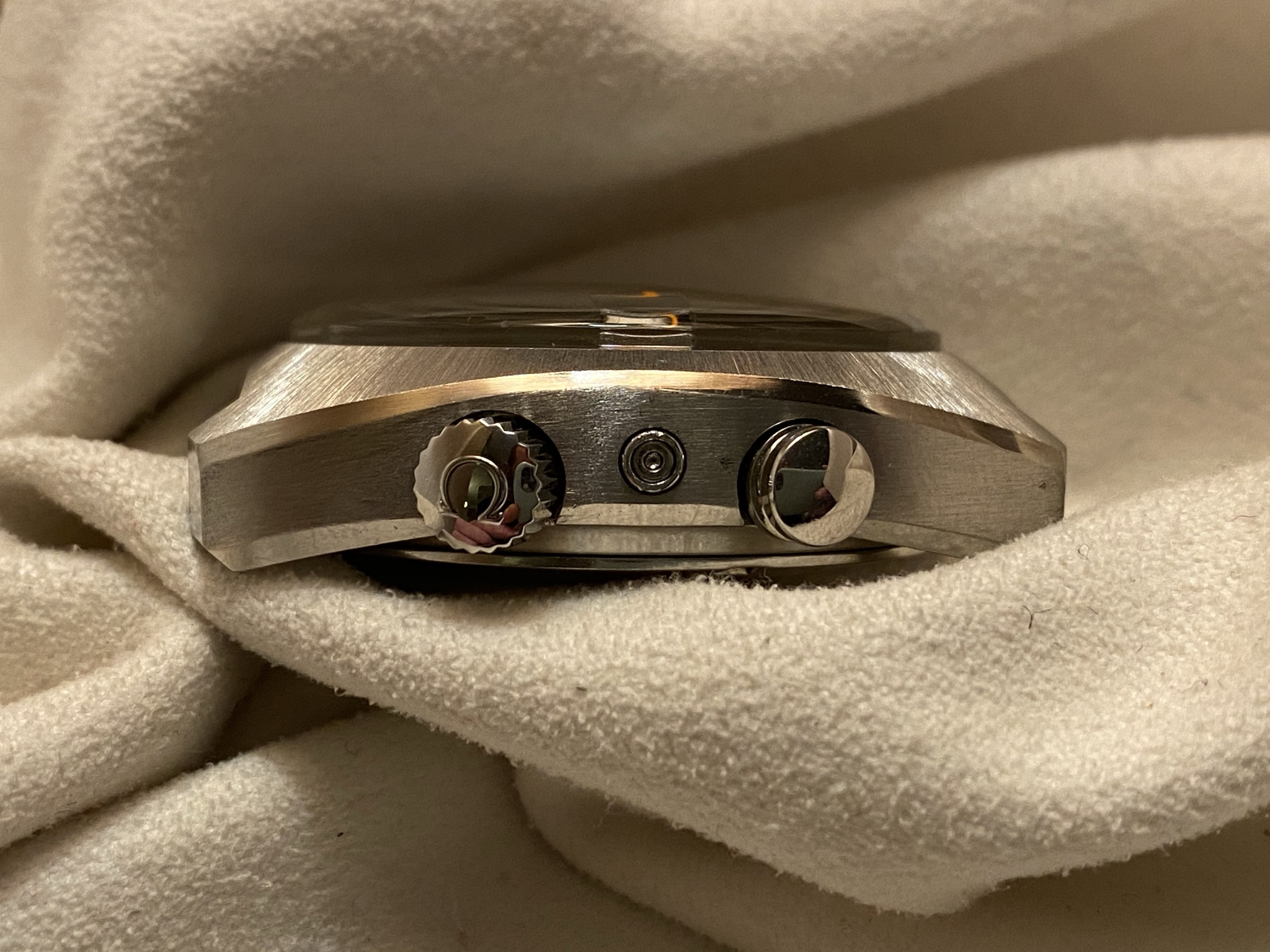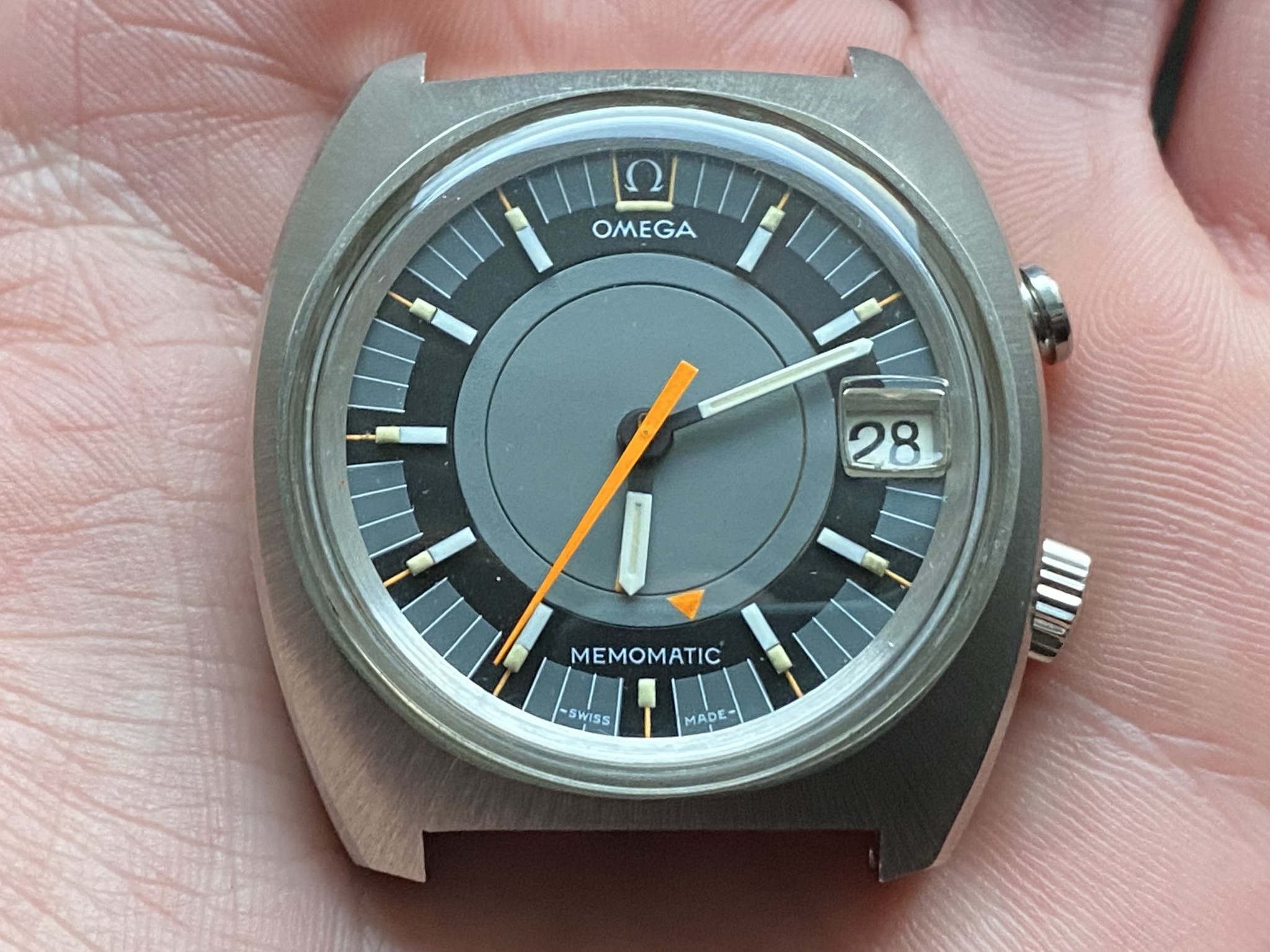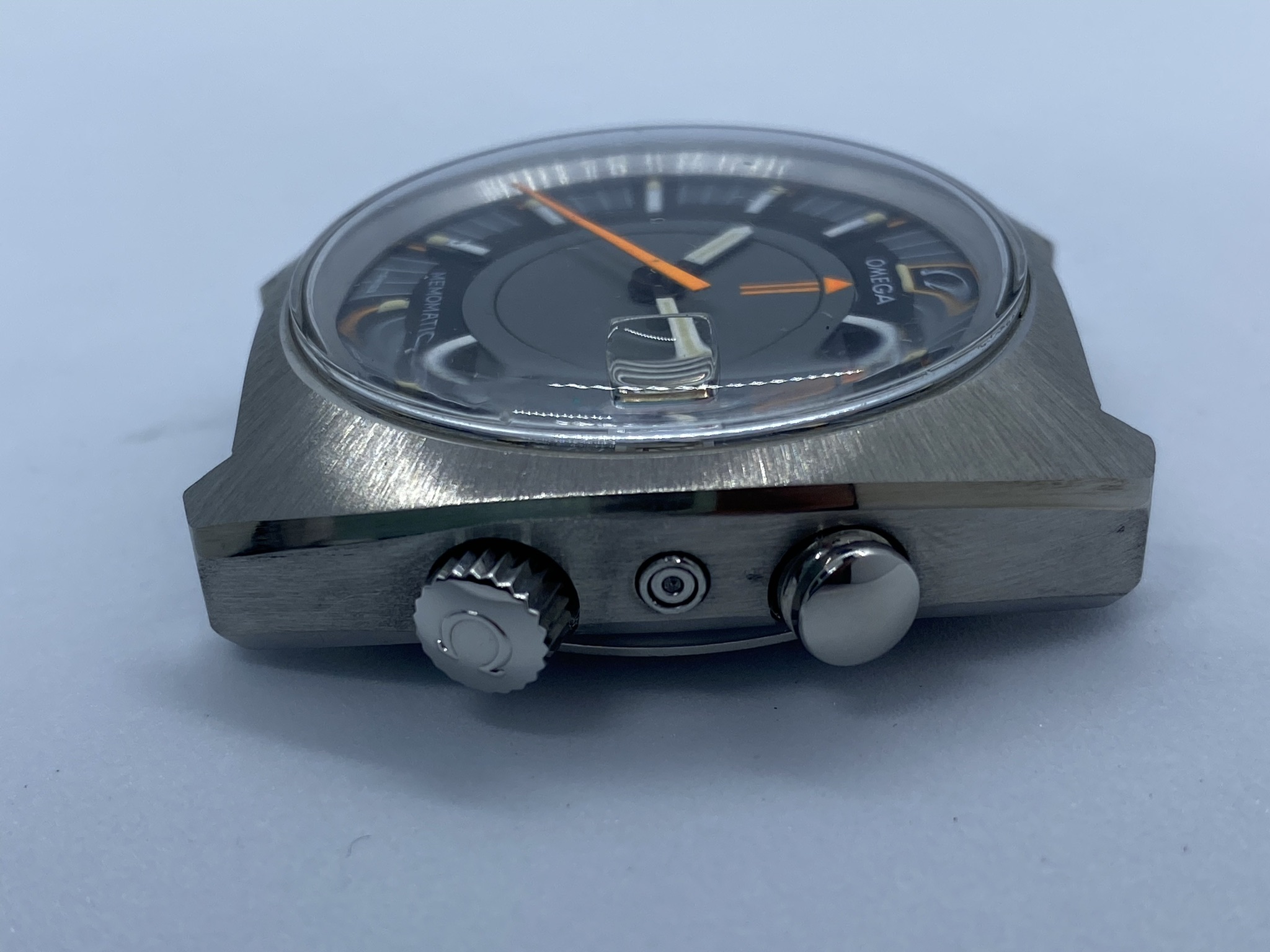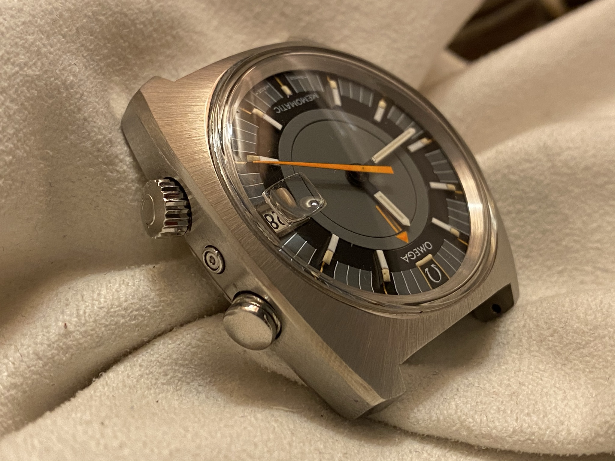 Dial: Original, non-refinished, even under the magnifying glas I can't spot any blemished whatsoever. What you might see in the pictures is dust/minute scratches on the plexi. Same goes for the hands, the lume and the bright orange accents.