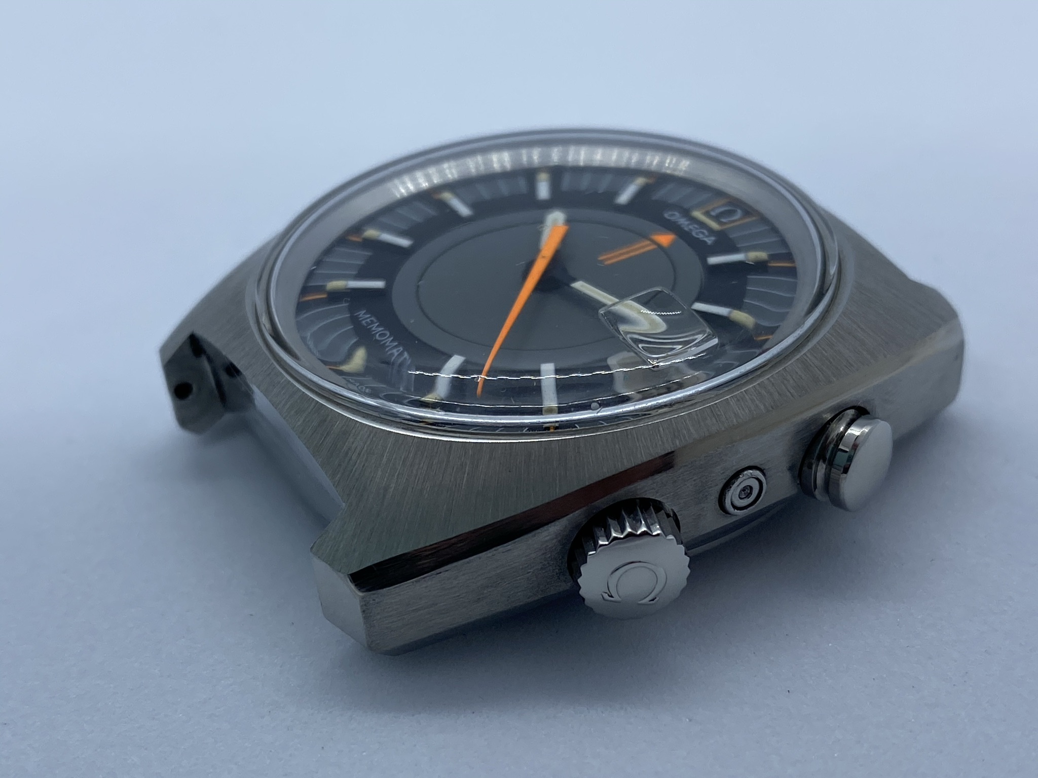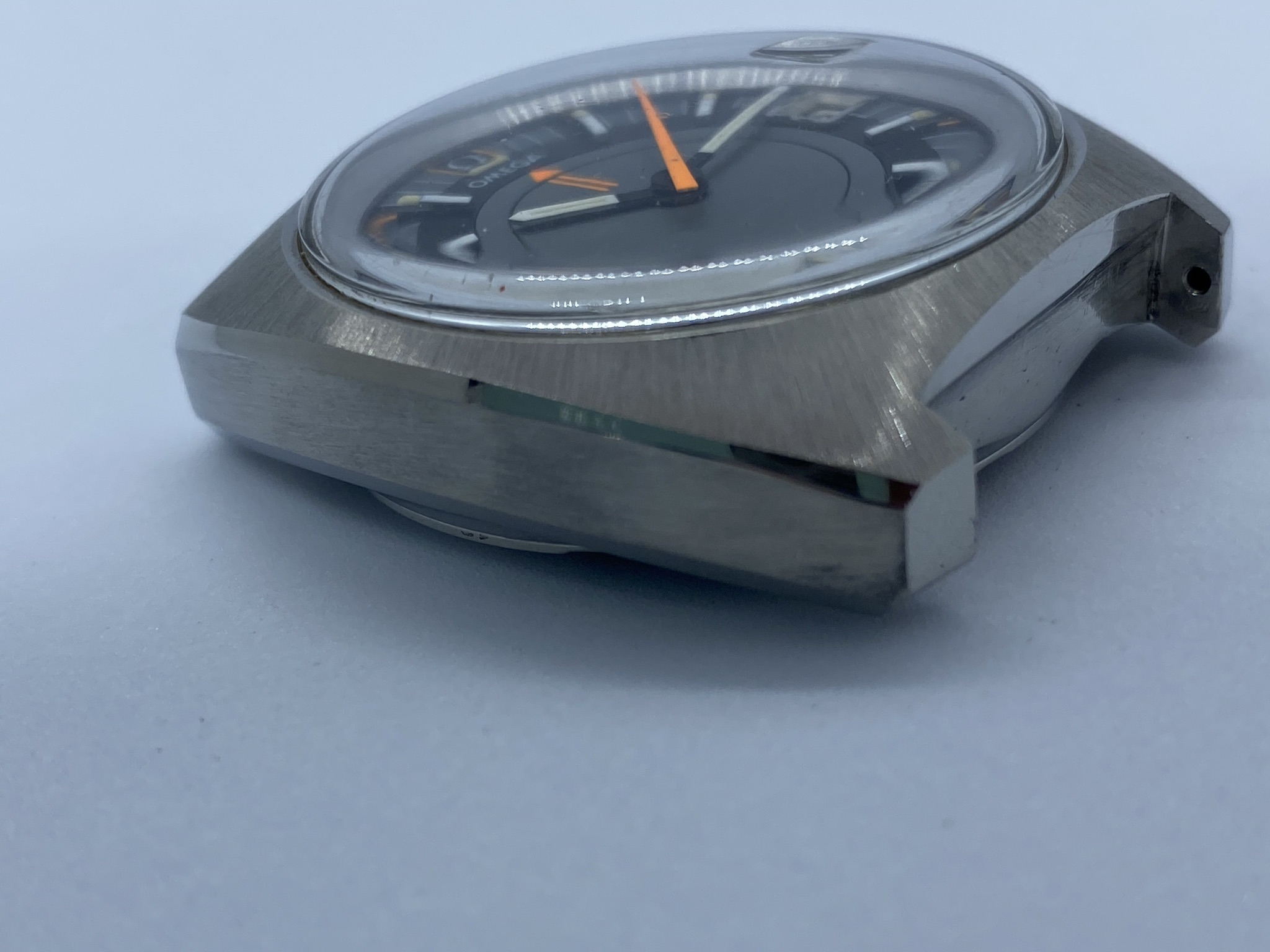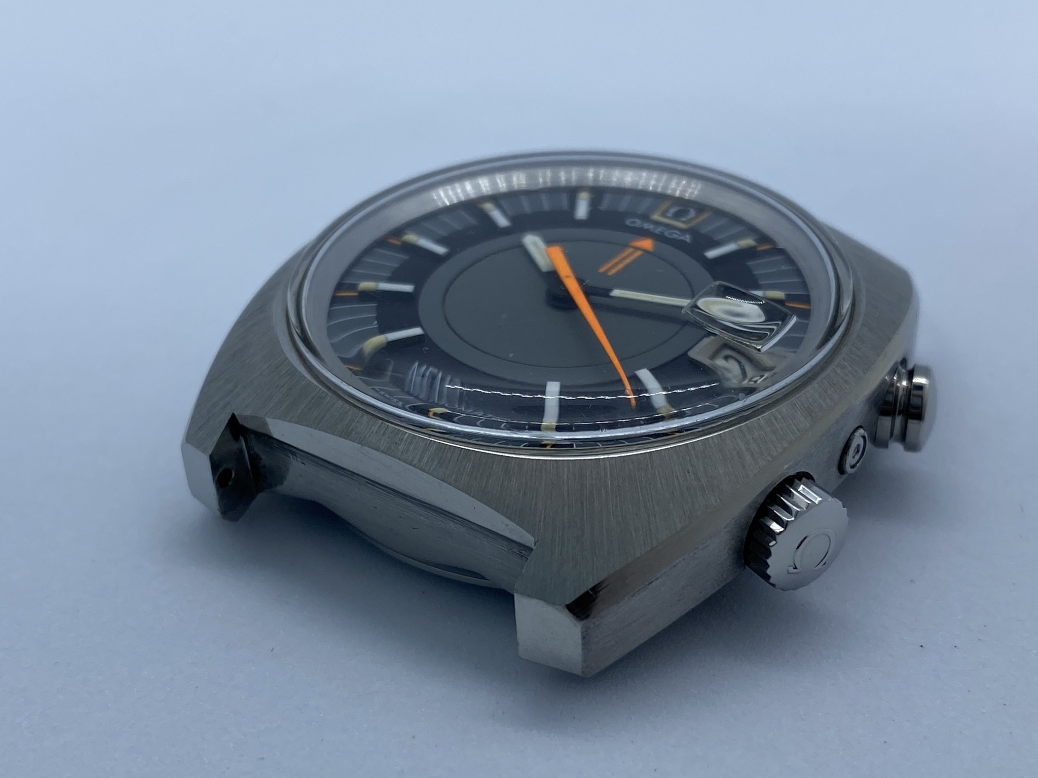 Case: Original 41mm stainless steel, with the brushing absolutely intact and clear, sharp edges to the polished chamfers. From the top, it's close to immaculate. Minute dots on the sides, with visible scratches inside the lugs from a bracelet. The caseback shows the usual smaller scratches from wearing and, unfortunately, some larger ones from failed opening attempts. Seamaster logo is sharp and clearly visible, though and when the watch is on the wrist, those imperfections luckily aren't visible.