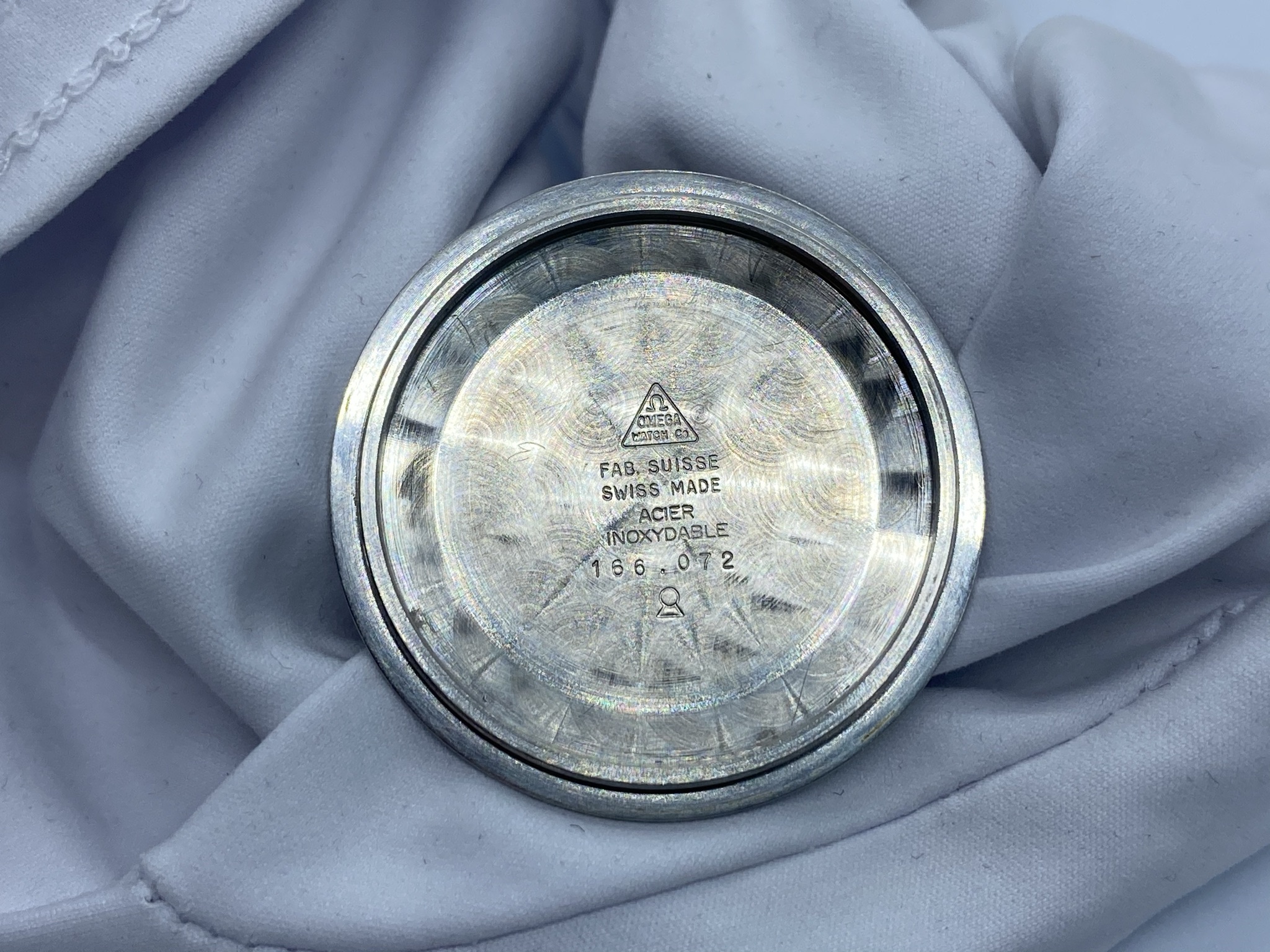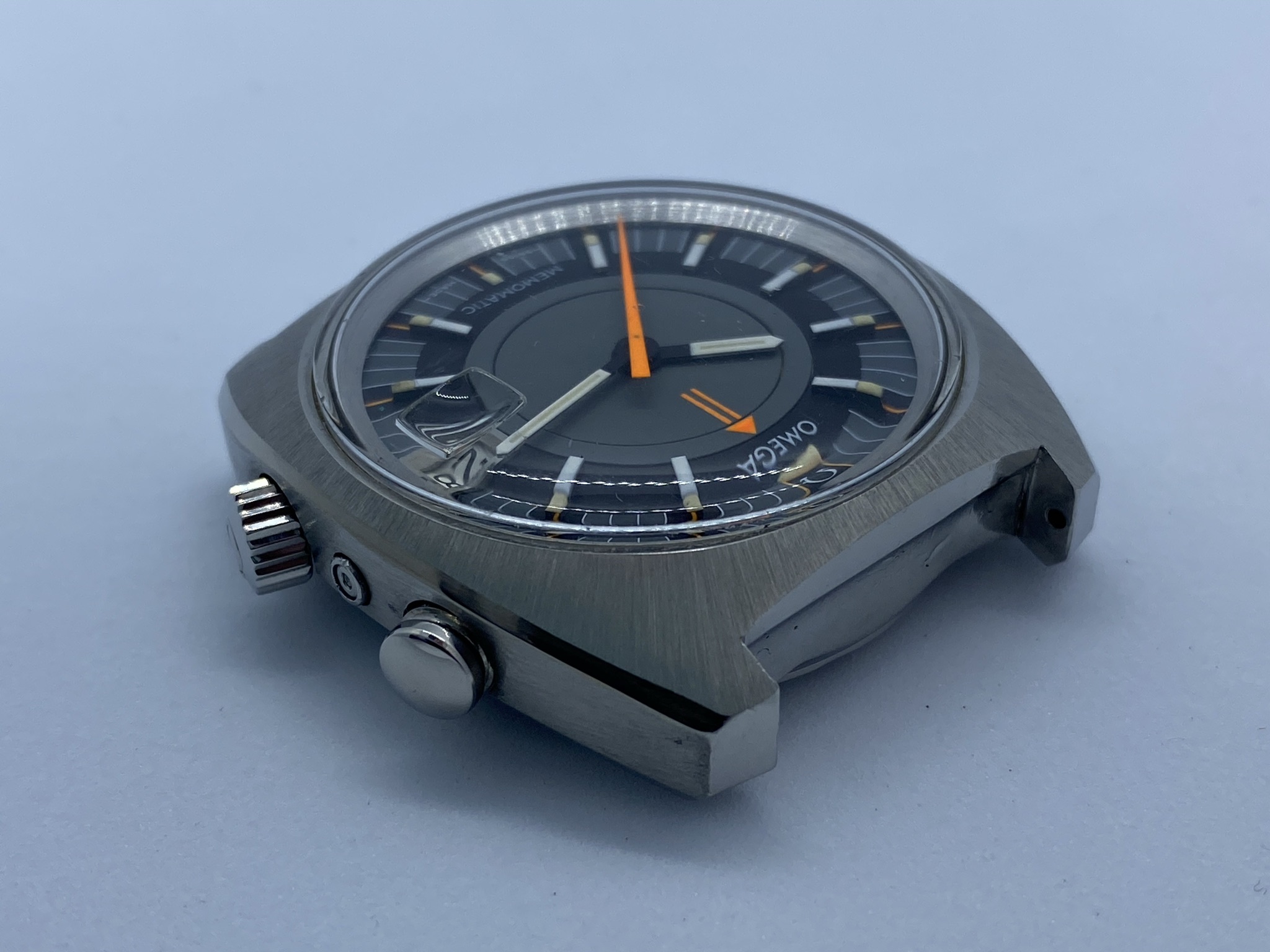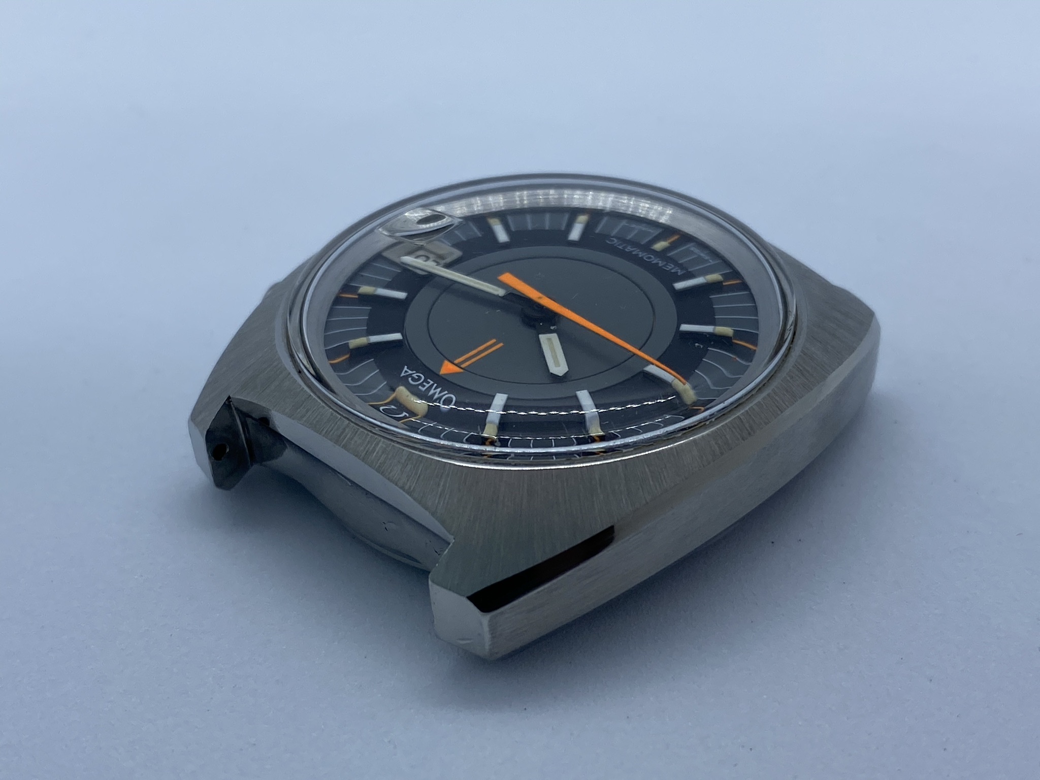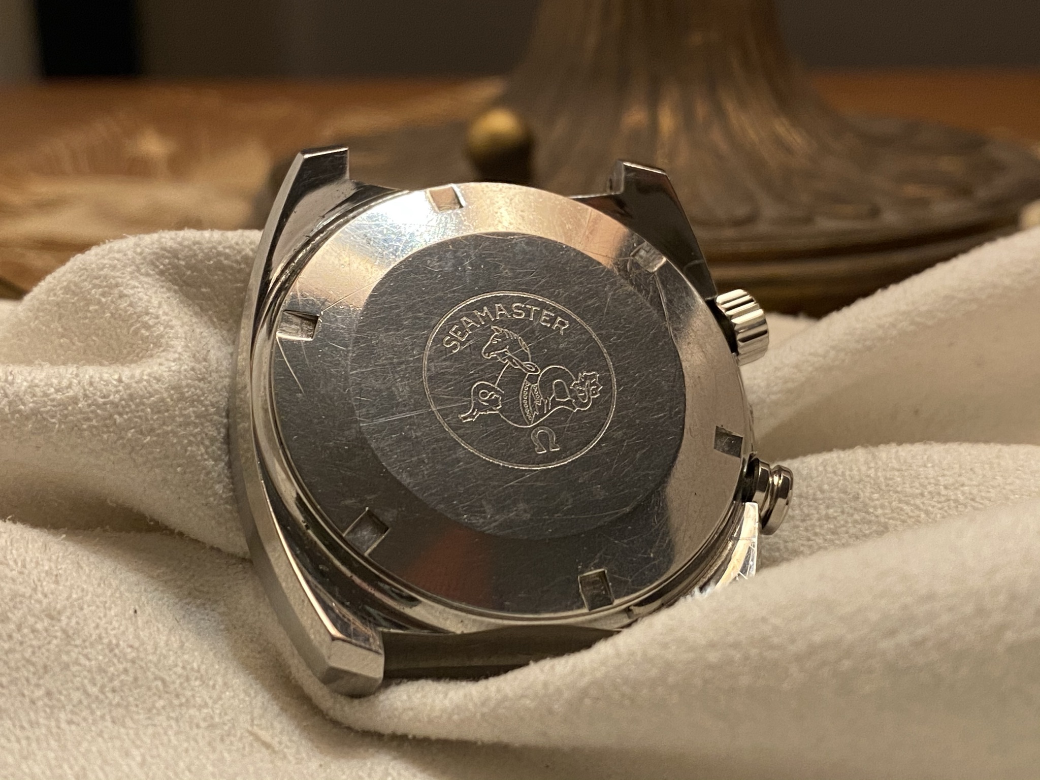 Case: Original 41mm stainless steel, with the brushing absolutely intact and clear, sharp edges to the polished chamfers. From the top, it's close to immaculate. Minute dots on the sides, with visible scratches inside the lugs from a bracelet. The caseback shows the usual smaller scratches from wearing and, unfortunately, some larger ones from failed opening attempts. Seamaster logo is sharp and clearly visible, though and when the watch is on the wrist, those imperfections luckily aren't visible.