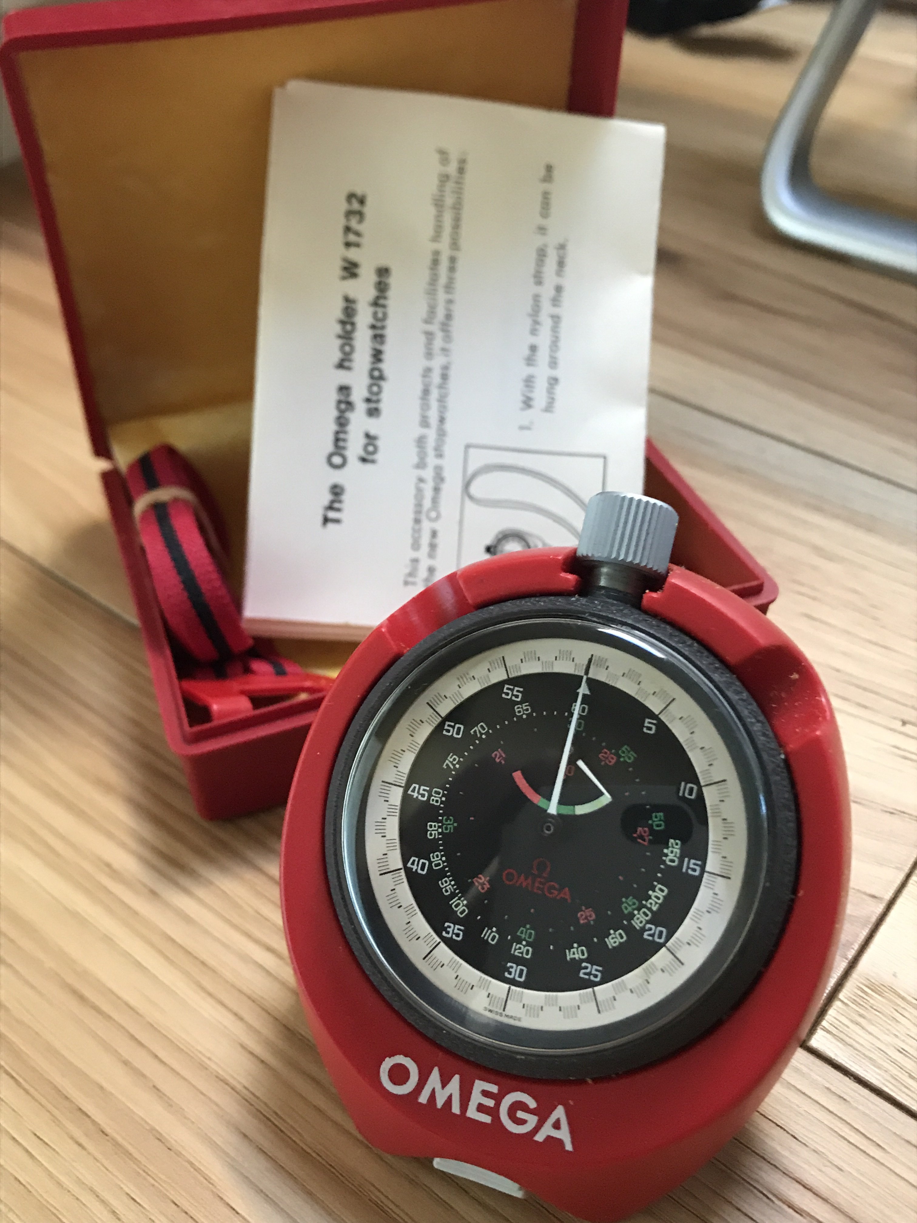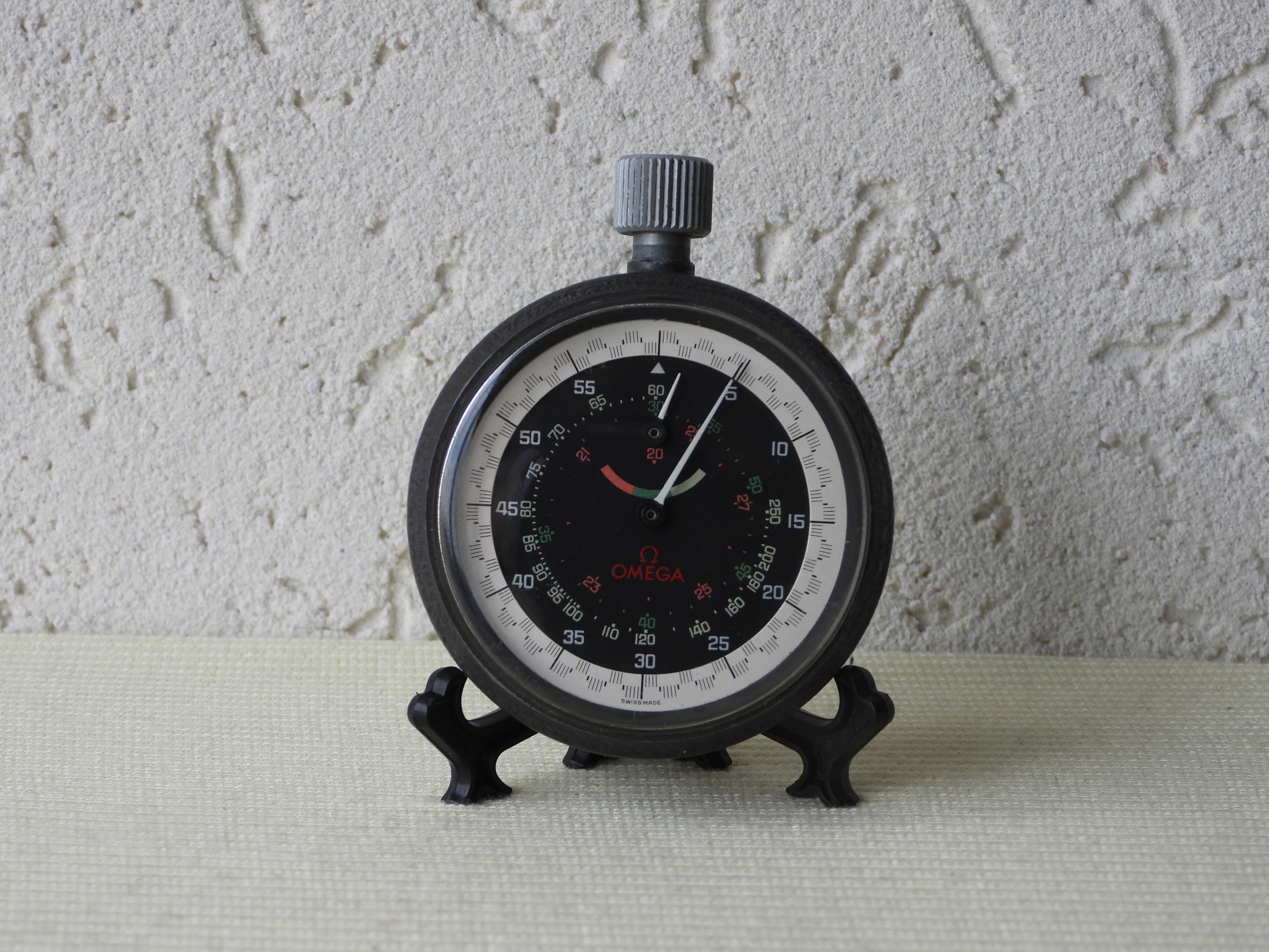 I own this beautiful Omega stopwatch. It is obvious to me that the center three minute scale colors correspond with the colored numers on the dial. I am able to measure speed from 20 to 250 miles a hour. But how do I interpret this? If in the first round the clock is pointing to 45 seconds, it will mean a speed of 80 miles per hour, in the second round it means about 30 miles an hour. At the top it will point at 60 seconds and a speed of 60 miles an hour in the first round. But what is the reference? How do I know what distance has been lapsed? Any help will be appreciated.