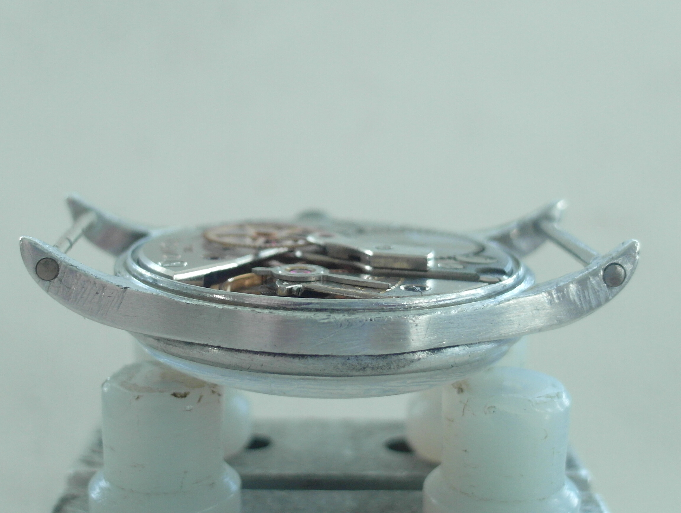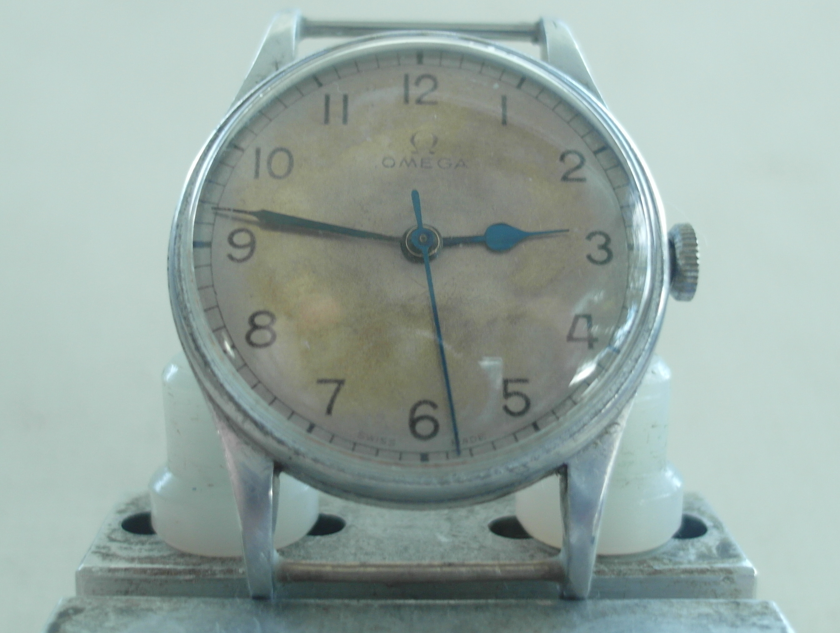 ·here is the rarer HS ( Hydrographic survey ) version of Omega`s WW2 Pilots watch. 1942. Alloy Middle unmolested with the very long lugs; not damaged or shortened ! some battle scars, but nothing serious. fixed bars. the upper of the brass fixed bars was missing. we replaced it with a stainless steel bar. secured with a drop of glue to avoid another mishap.... the lower bar is the original brass one; a bit worn now. secured as well. easy to remove, if desired. the lug holes are perfect. therefore the lugs are perfect. which is quite rare with this model; most have lug issues.... original "Bubble" glas with scratches. original crown. original case. original dial; not repainted. the script is very fine and original, but faded with age. has morphed into a silver colour with some age areas. shown in the pictures. . only the center has the light whitish colour . blued hands. the center second hand looks replaced with a different tail partand slightly thicker. works well, but service history unknown. therefore sold as is. HS engraved back has some pressure marks in the middle from opening and closing, i guess. movement looks very clean; a replacement of the mainspring might the way to go at the next service. diameter without crown: 33 mm. with crown: 35 mm. lug to lug: 43 mm. thickness: 12 mm. Paypal payment not possible here. bankwire or Transfer Wise for best rates and quick service. we only ship via Post courier international,EMS for A$ 65. the Covid related travel times from Down under are too unpredictable otherwise. somewhere there is the Bonklip band as well; have not found that one..... will let you know, if i do. we ship and declare in a way, that you do not have to pay all fees entering europe.....we offer full value insurance for 1% of the value, without showing on the parcel. via a 3. party insurer. Asking US$ 2400.