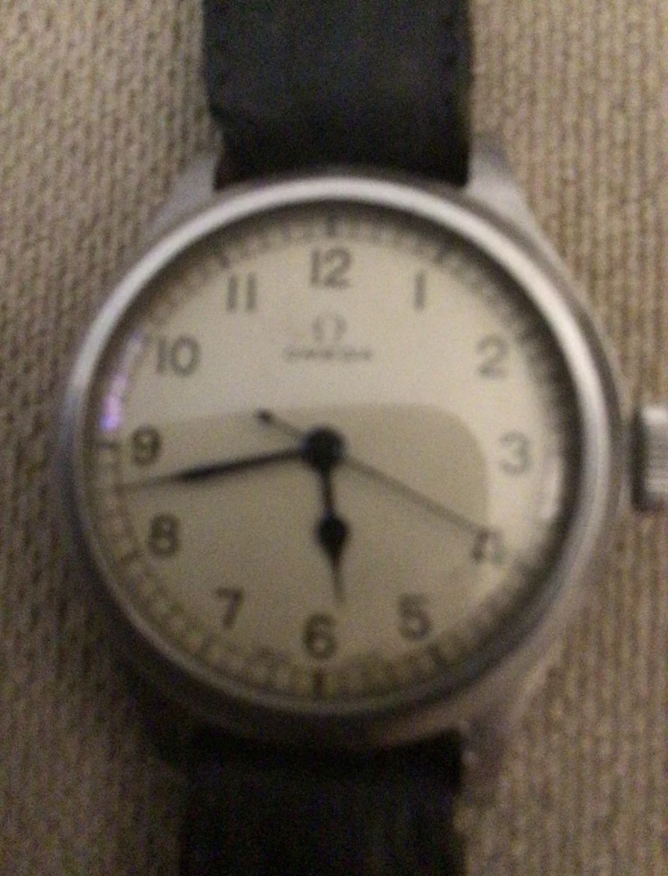 Front /dial pics are essential here. With Swiss made above the 6, its the 1956 re cased WW2 navigators omega. Yours is re issued in 1959. If no Swiss made above the 6, it is a re paint, which was normally done in black. Depends on the Fonts, if yours is a MoD dial or not. Kind regards. Achim