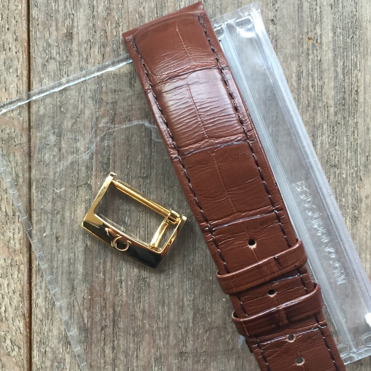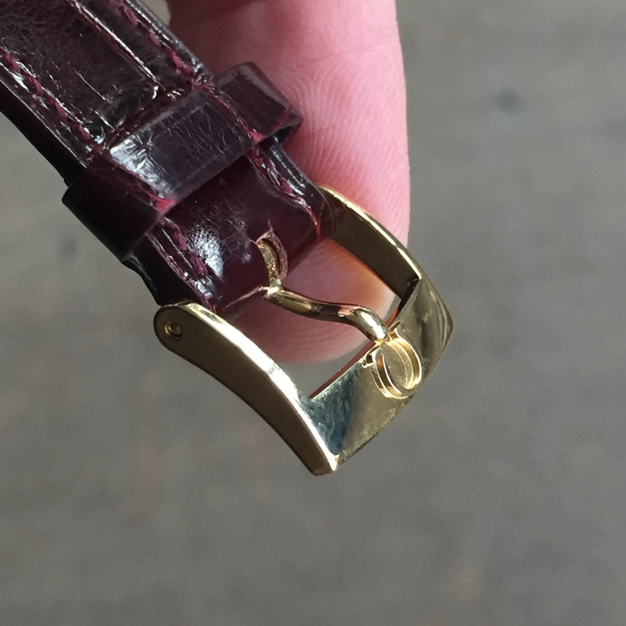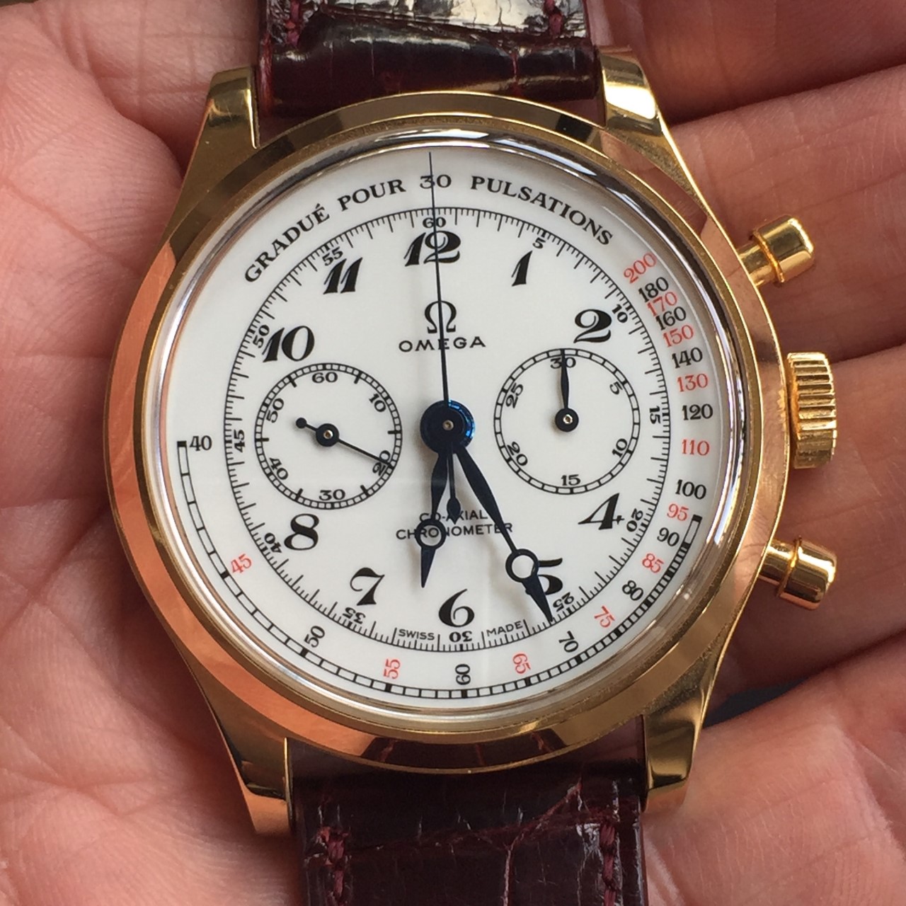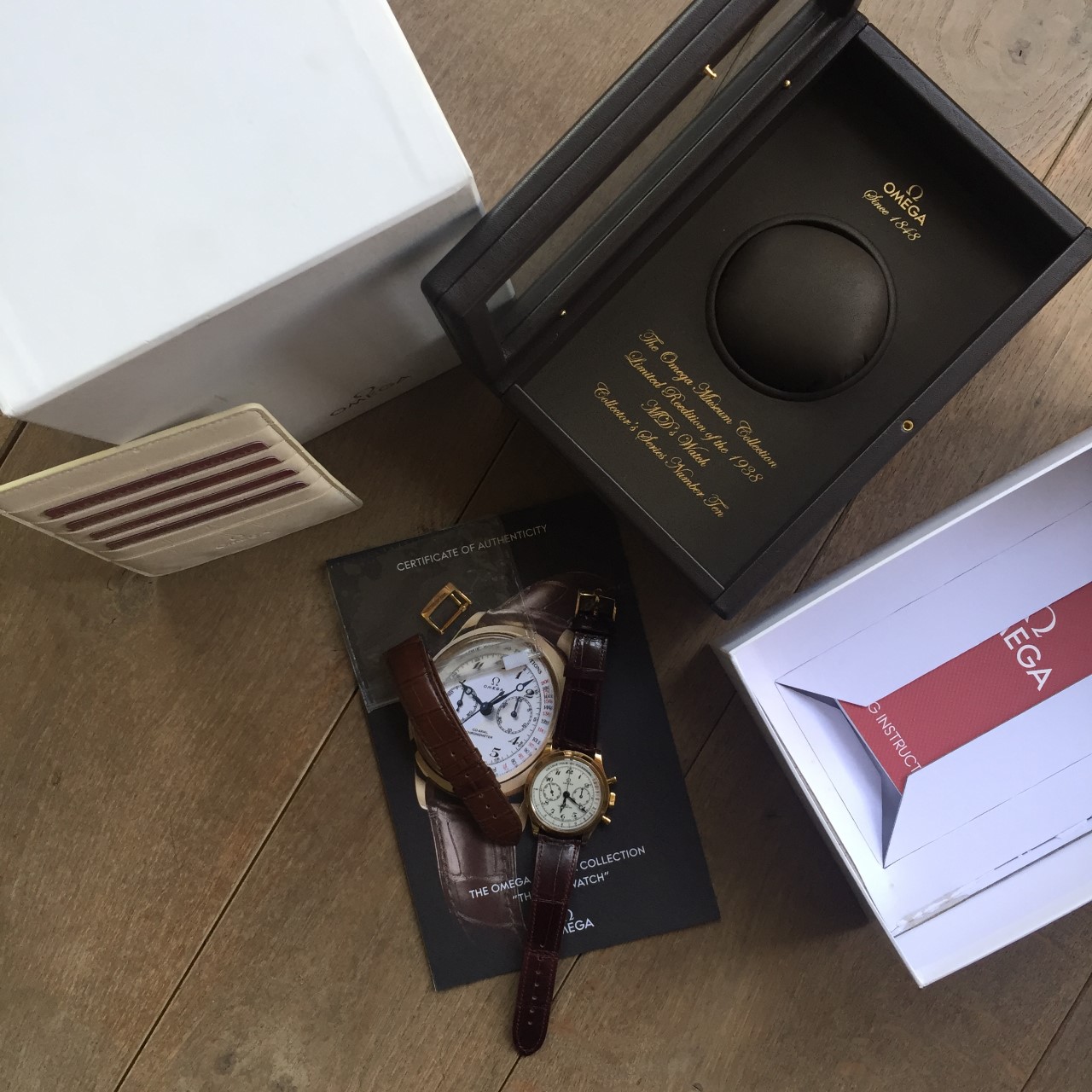 路For sale a solid gold chronograph powered by the co-axial calibre 3203. The watch has been worn only a few times and bears very, very little signs of wear (no scratches, no dings whatsoever). I am the first and sole owner. The watch was bought new from an AD in France in October 2017 (so it is still under warranty). It comes with original box and papers as shown here. The original buckle (18mm) and strap are shown separately here and are, of course, sold with the watch. I have added to the package a genuine Omega's 16mm solid gold buckle and a burgundy strap.