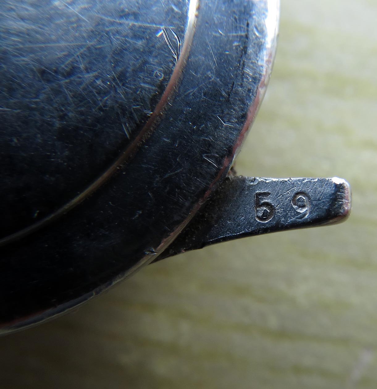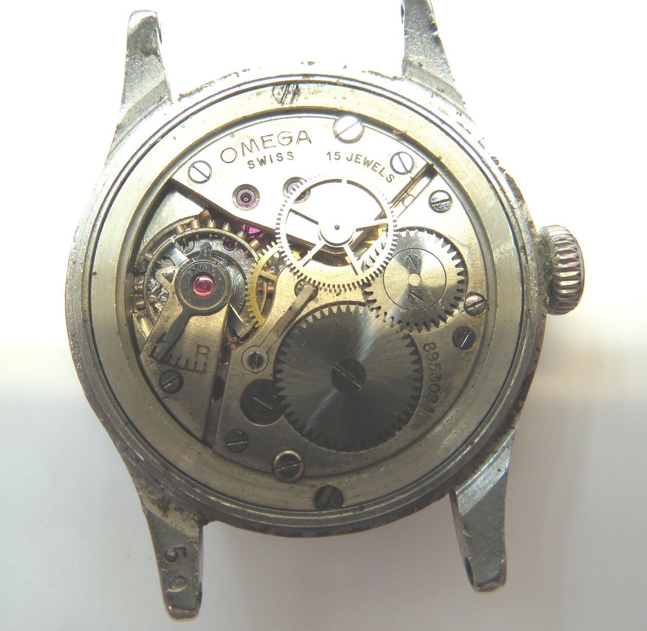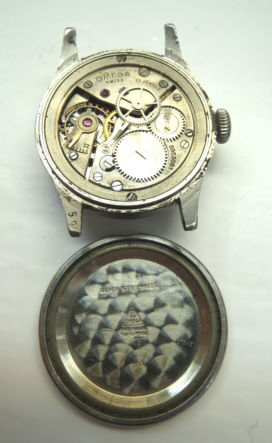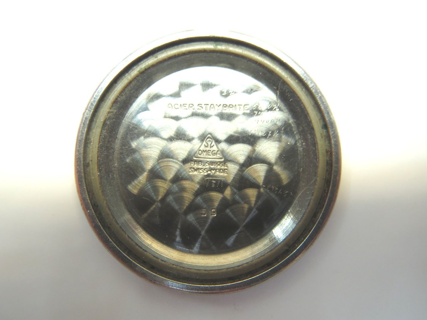 The back of the case (which is remarkably unpitted) reads 'Waterproof' and also 'Mod + Depose'. It also has '59' on the reverse of one of the lugs, but surely this a 1930's watch. There are also numbers on the back casing which are very hard to decipher - I'm fairly confident of 9749 but less so of two further digits 27.
