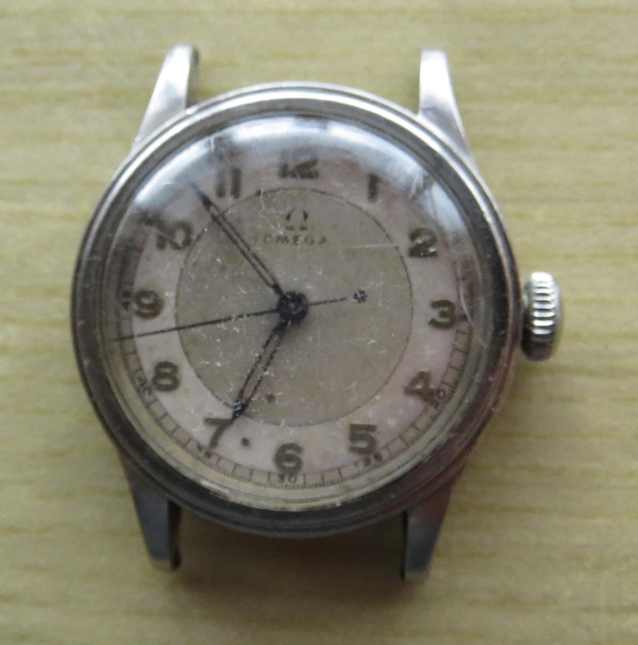 The movement is not functioning, but due to the crack in the crystal on the winder side I'm loathe to open up the back as the pressure required to fit it back together may make things worse. The crystal is in poor condition and the scratches obscure the fact that the face is pretty good for its age. Two-tone dial is always good. Any thoughts/comments?