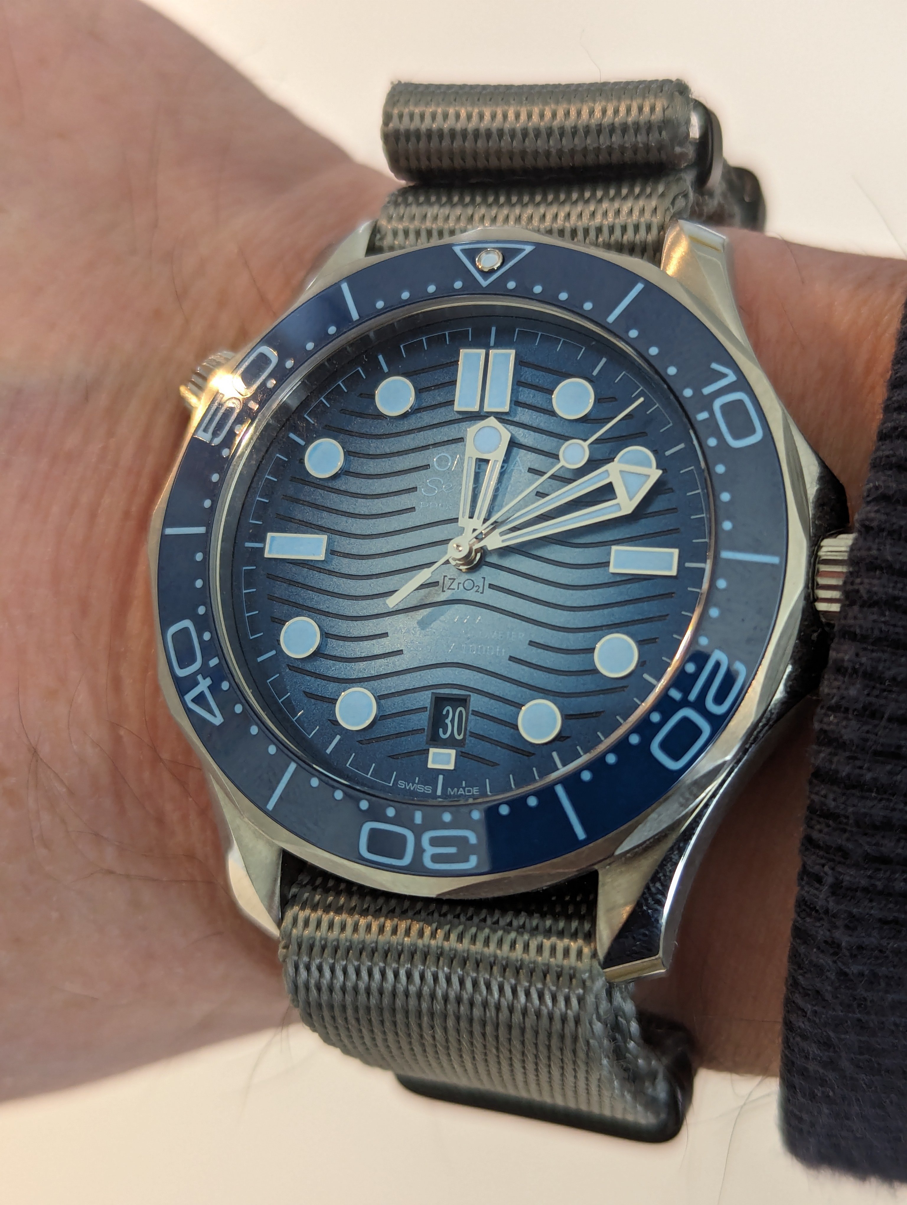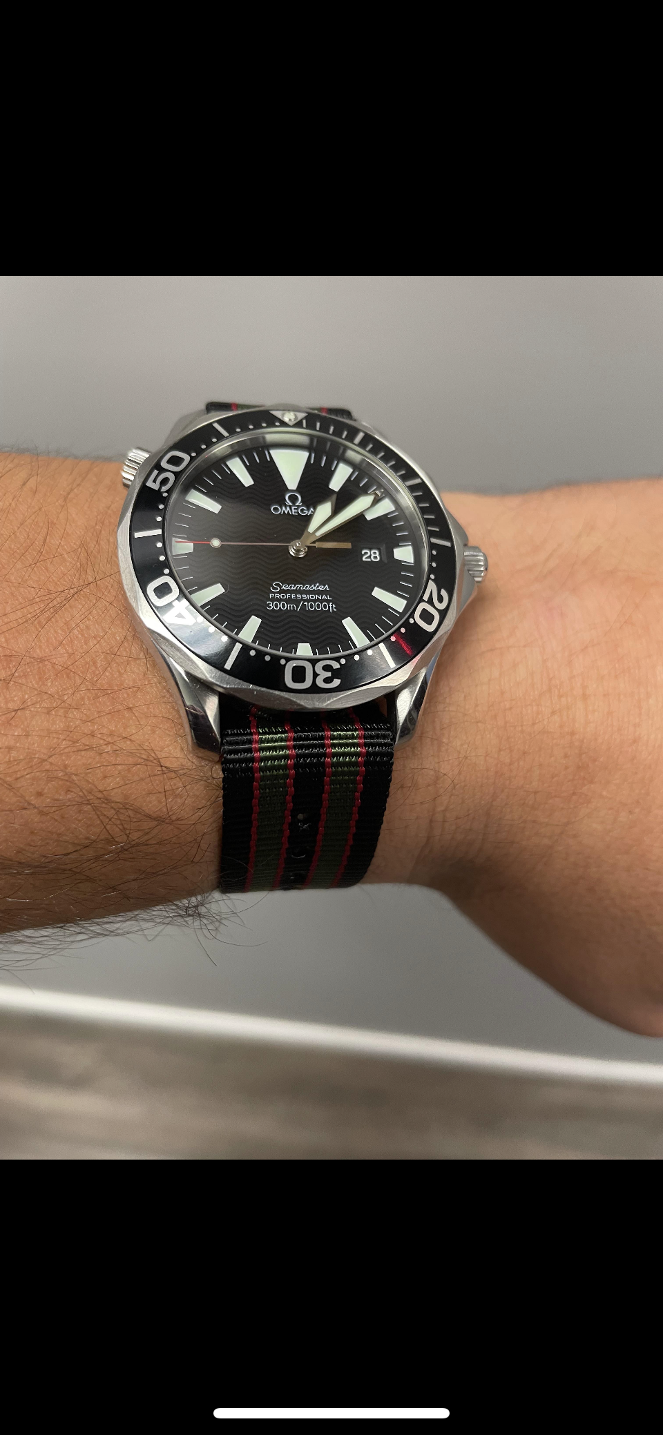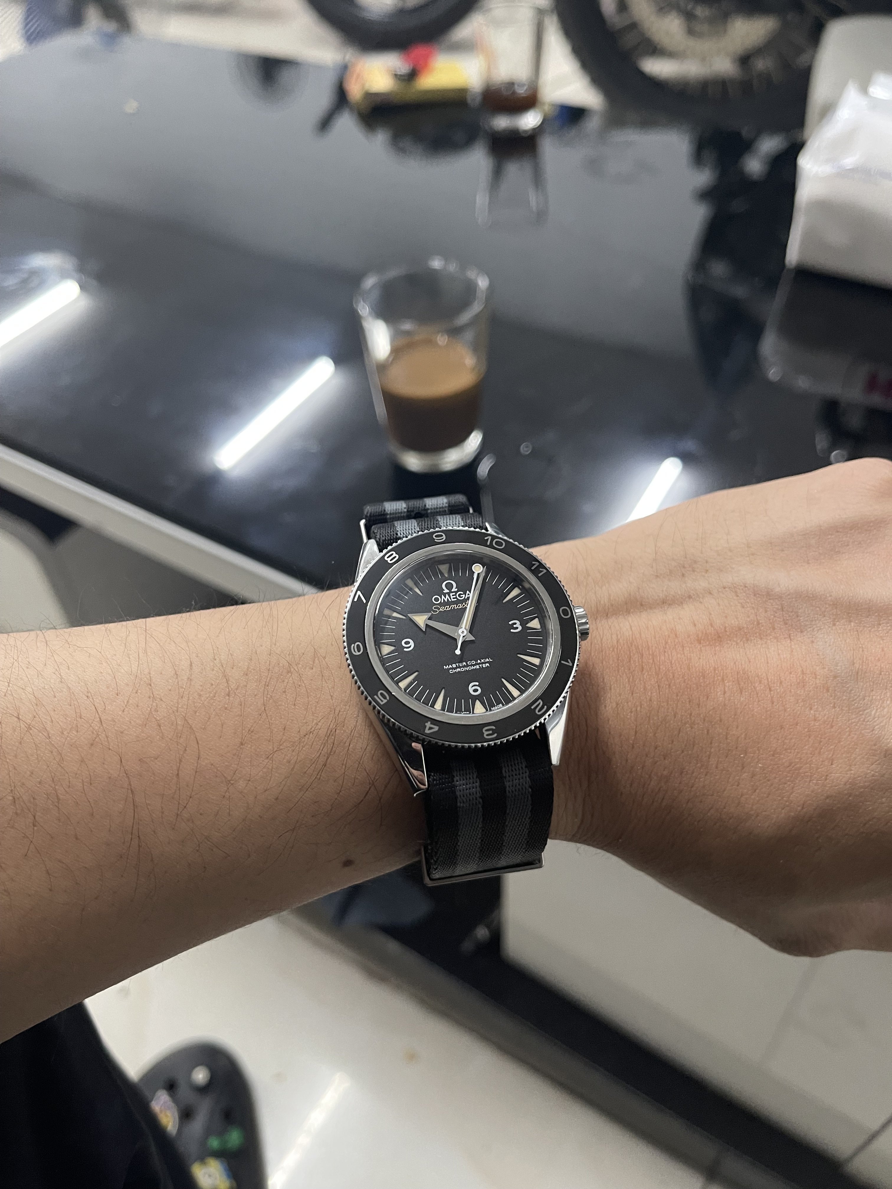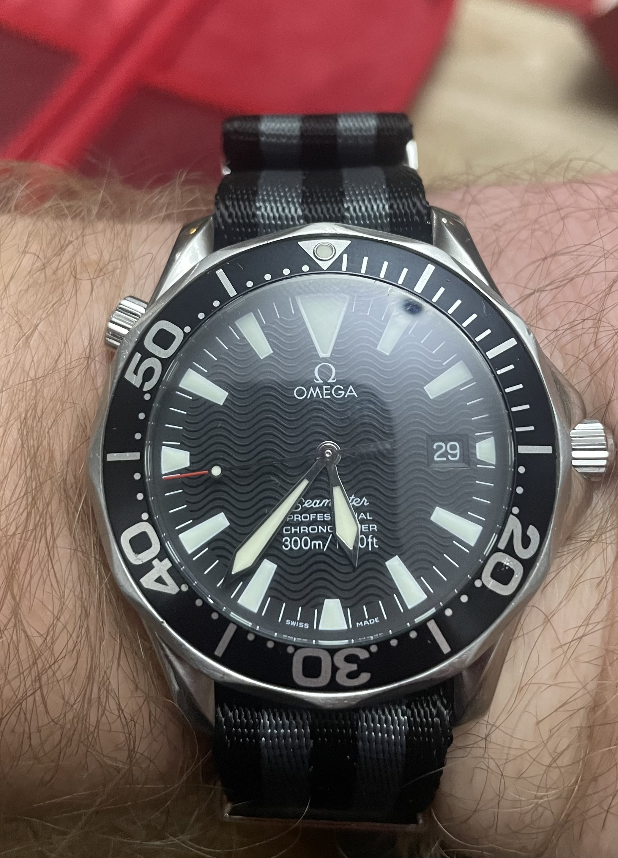 Freshly serviced just got it back today, on black and grey Omega Nato.