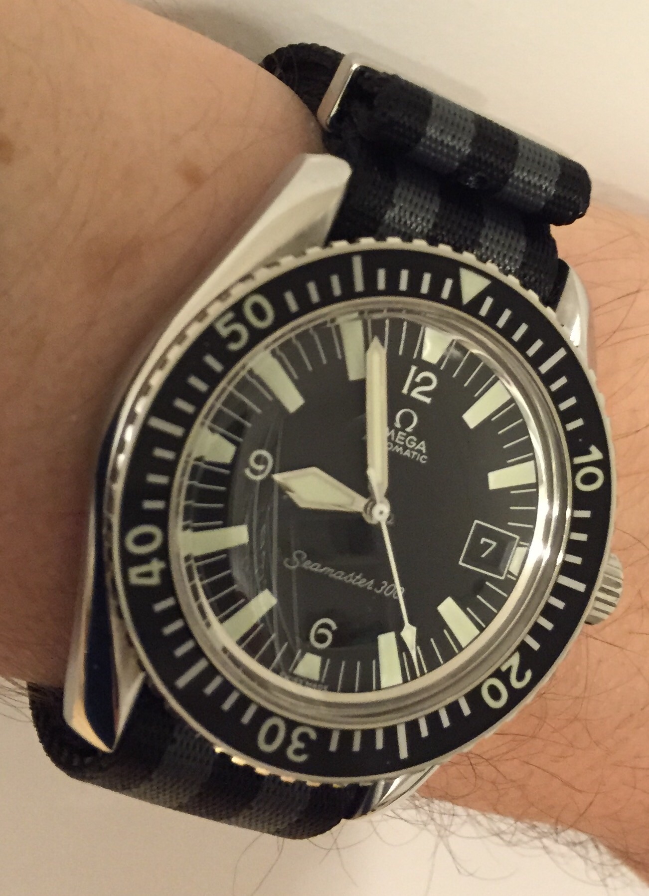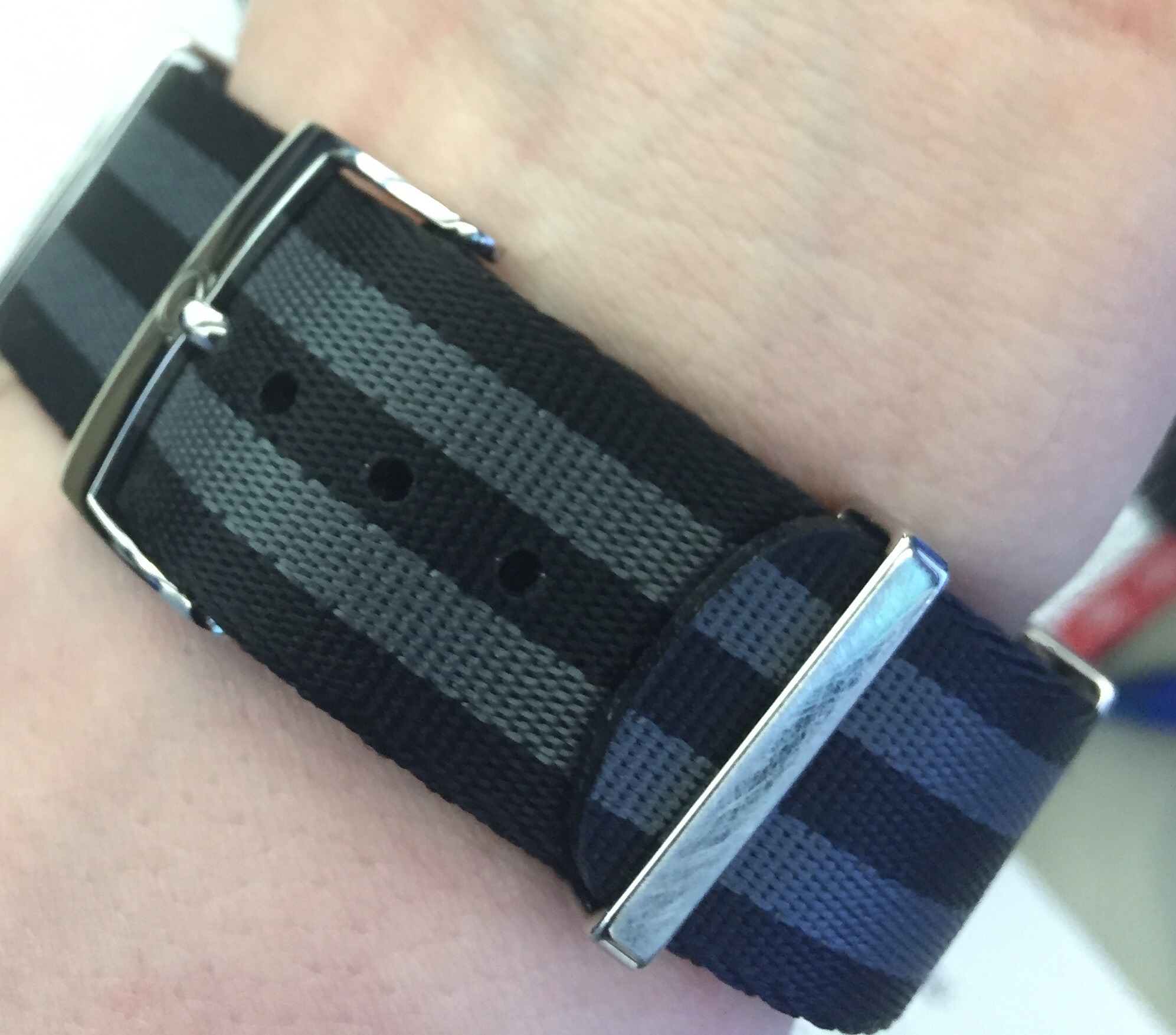 Just realized what the material reminds me of - it's basically a seatbelt! With stripes! Same glossy and indestructible feel... I know I have a strap problem but I'm sold and may go back for more. BTW the blue titanium SM300 on the tan leather NATO they had there look awesome - I wish I'd taken a photo - will do when I go back...