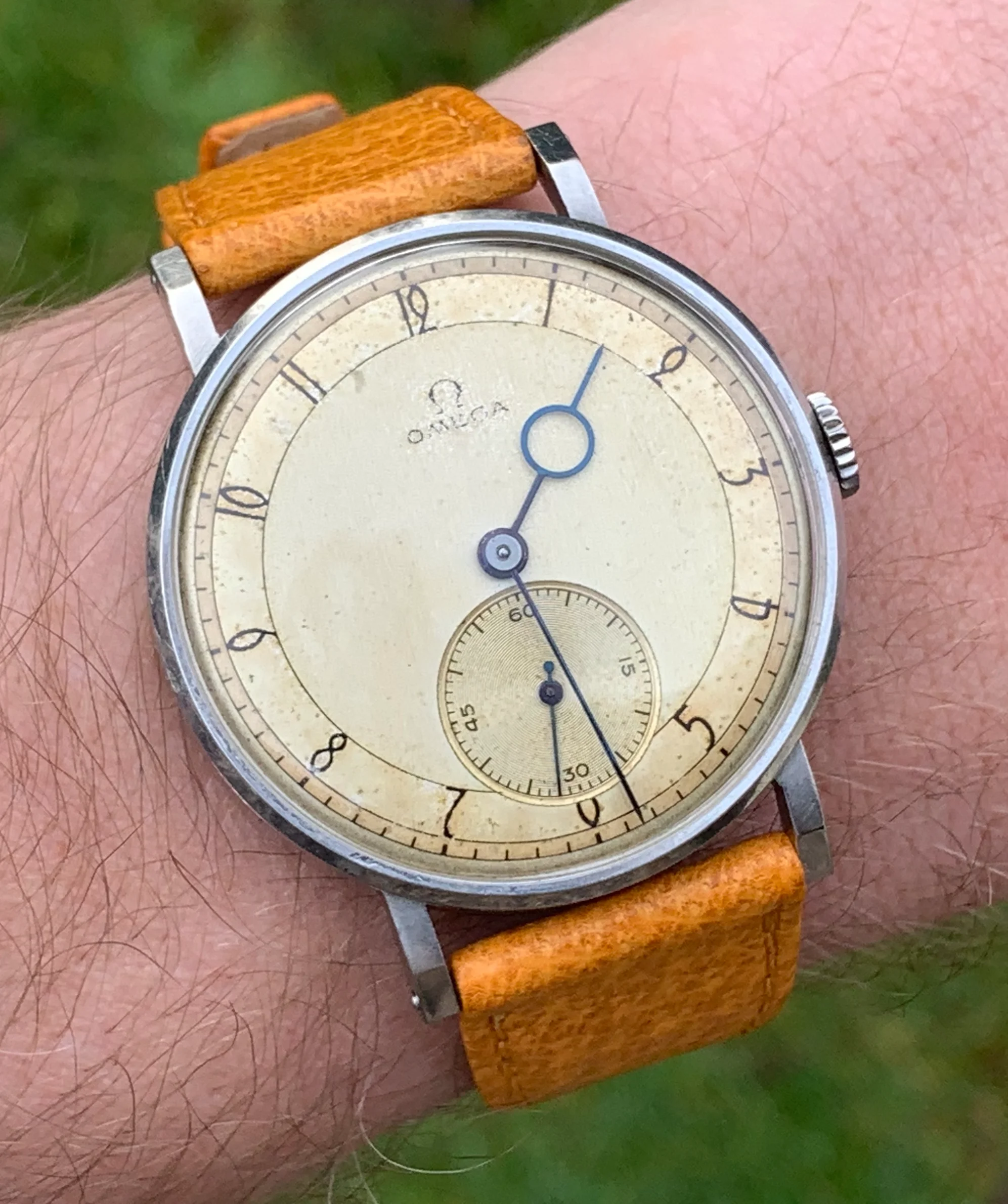 Currently, the watch can no longer be won up regularly: The crown jumps back immediately. When adjusting the time, however, the spring seems to be tightened briefly, so that the second hand moves minimally. The enamel dial has some damage at the edge and the plexiglass is clearly yellowed.