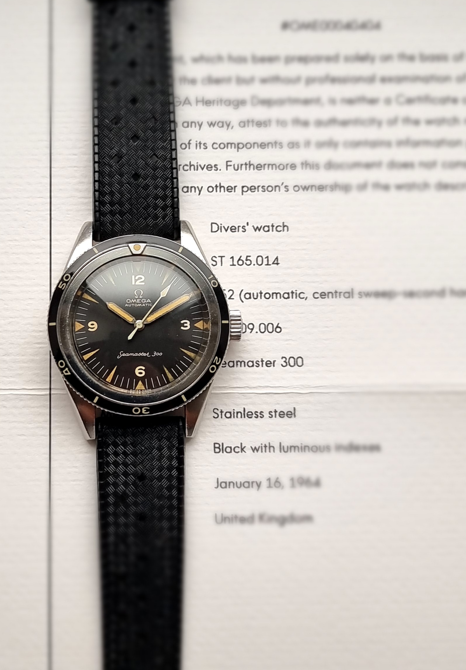 The watch is in very good vintage condition and the 39mm case remains sharp and has its original crown. It is still well defined with nice chamfers and lugs. The plexi is also original with no cracks. The case back has a very sharp 'Hippocampus' engraving indicating it may have been worn seldomly. As mentioned previously it has a very interesting double stamped caseback showing 14755-62 with 165014-62 beneath. The extract confirms the correct time for this to be regarded as a 'transitional' piece. The dial is is mark free with original hour plots that have aged with a lovely vanilla patina. The hands were relumed during service as the original lume was cracked quite badly and match the dial perfectly. Please note the bezel is repro, and this was carried out by our own specialist bezel maker Roger, aka @mcgyver . Unless you are very well informed and examine SM300 bezels with a loupe, it is unrecognisable from the original. The watch comes on an original 19mm Tropic strap and these were an option when they first sold.