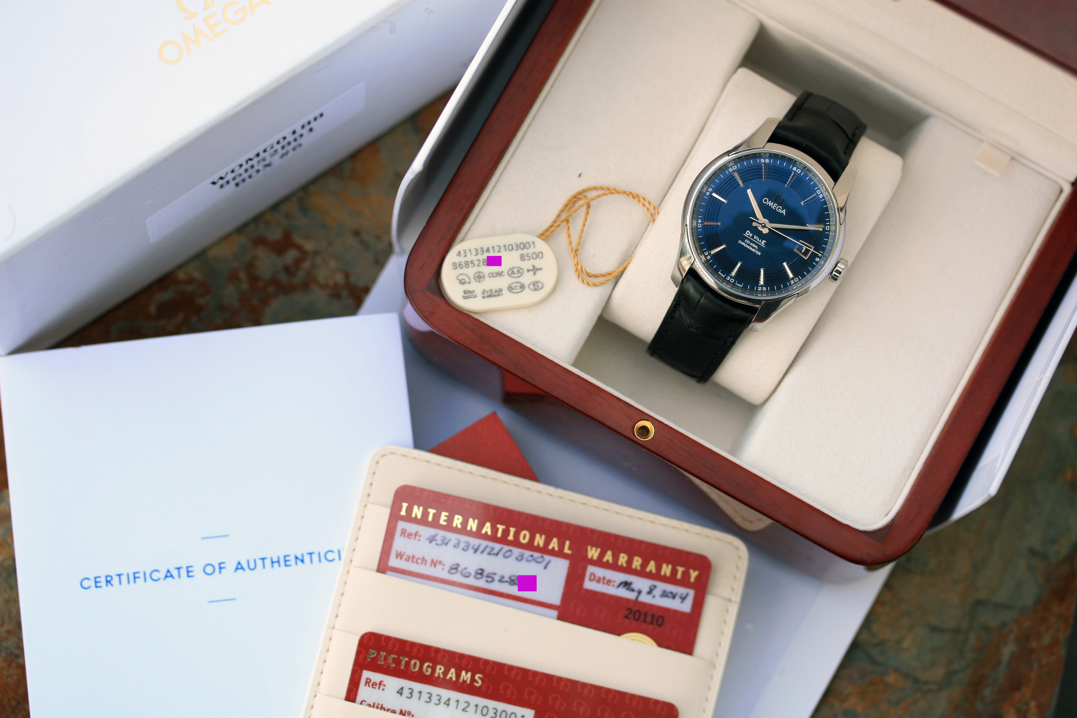 868528XX serial number with card dated May 8, 2014 with plenty of factory Omega 4-year warranty left over.