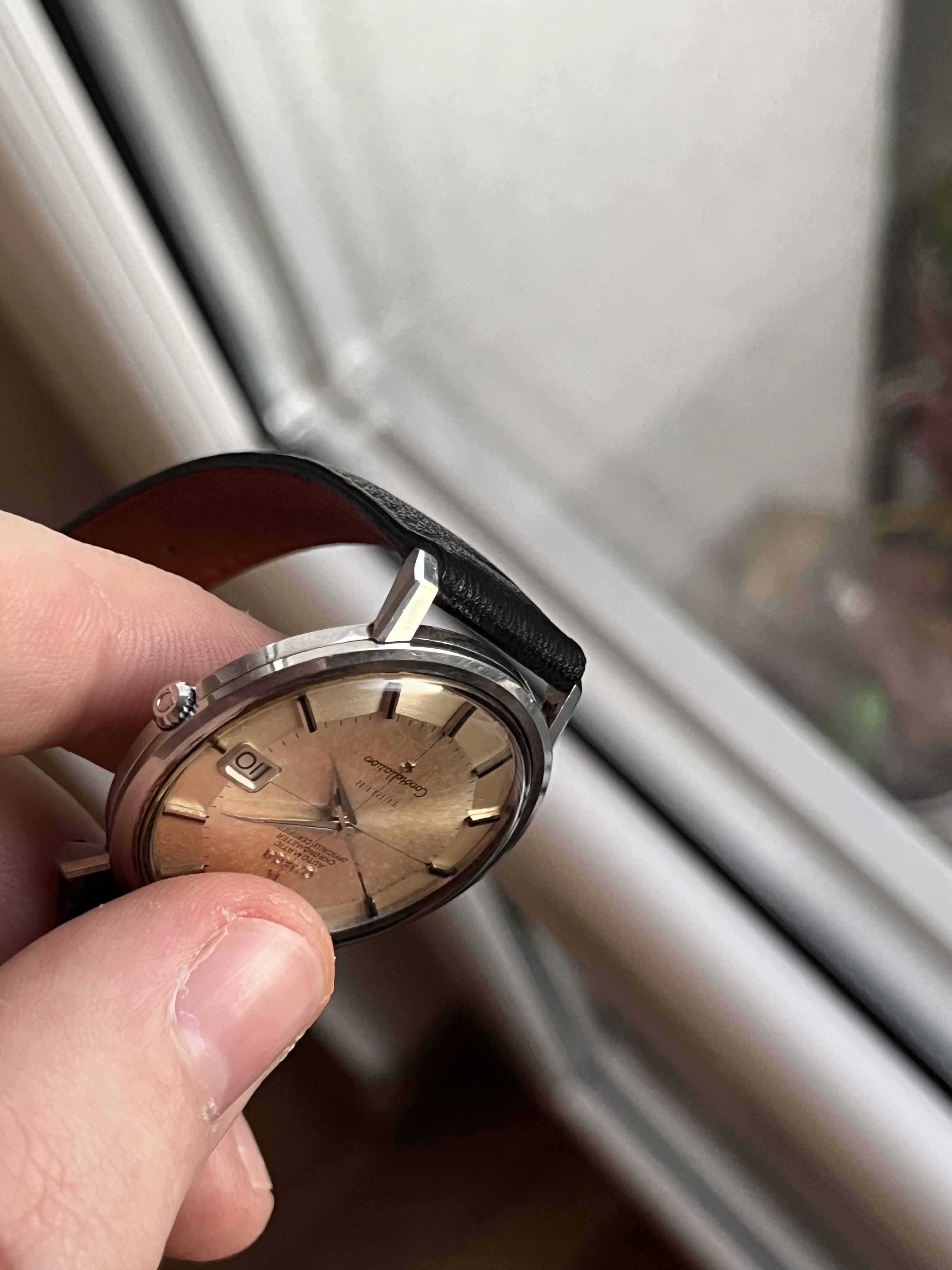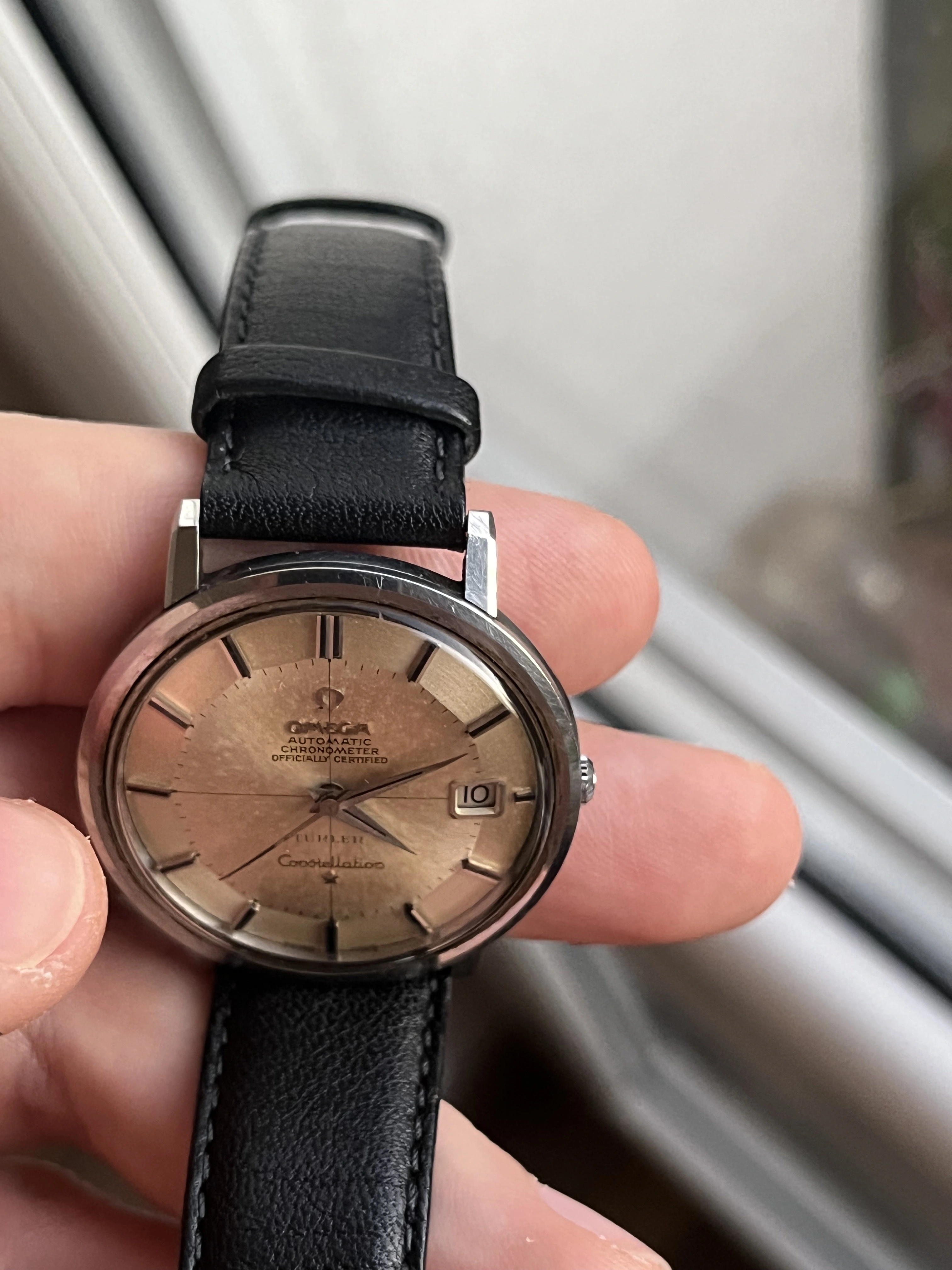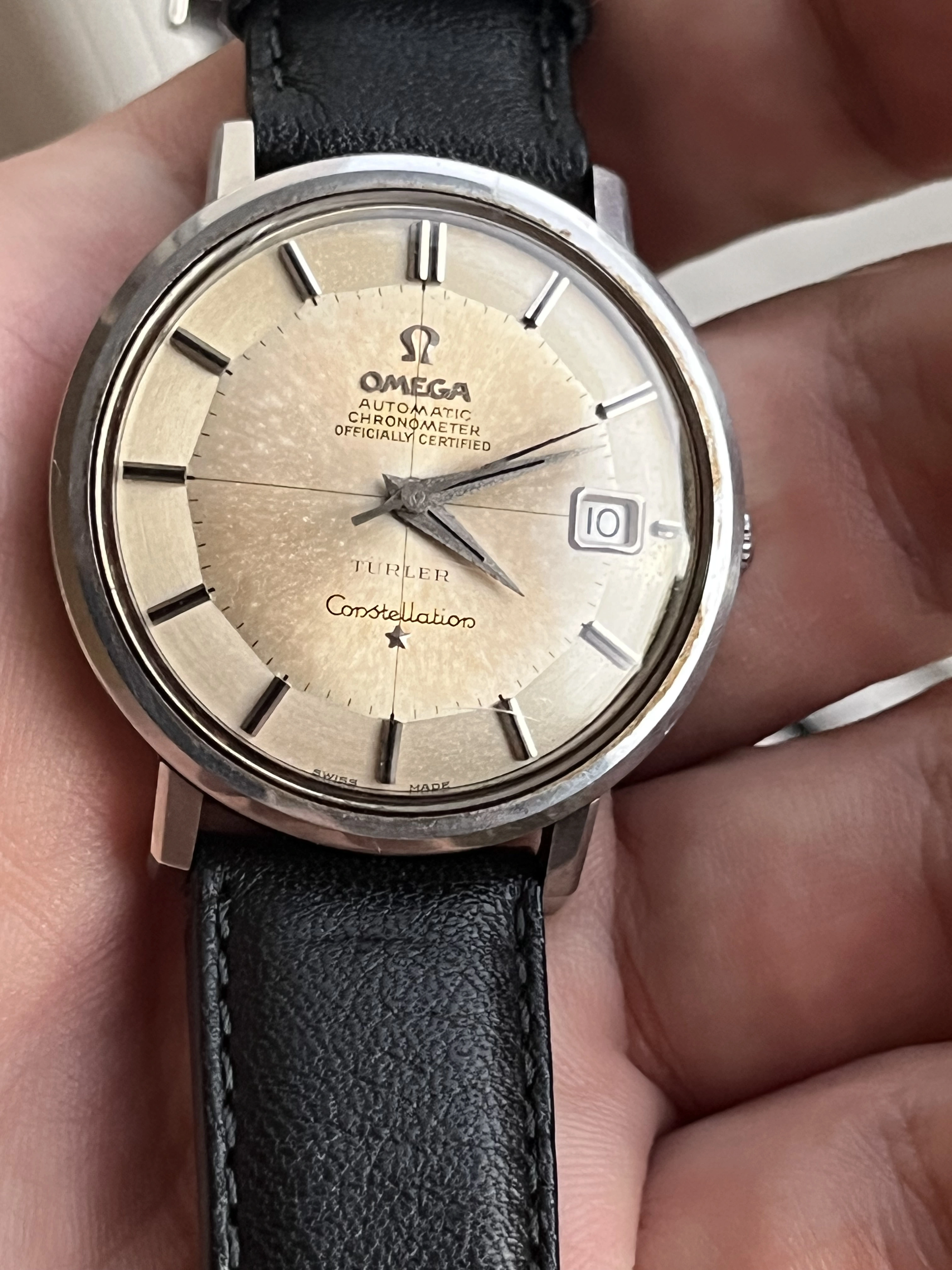 The patina is rather even and not distracting, decently sharp case, non-luminous dial and hands which is always preferable imo than having to deal with flaking tritium, the 35.5mm larger hidden crown cases are among my favorite Constellations.