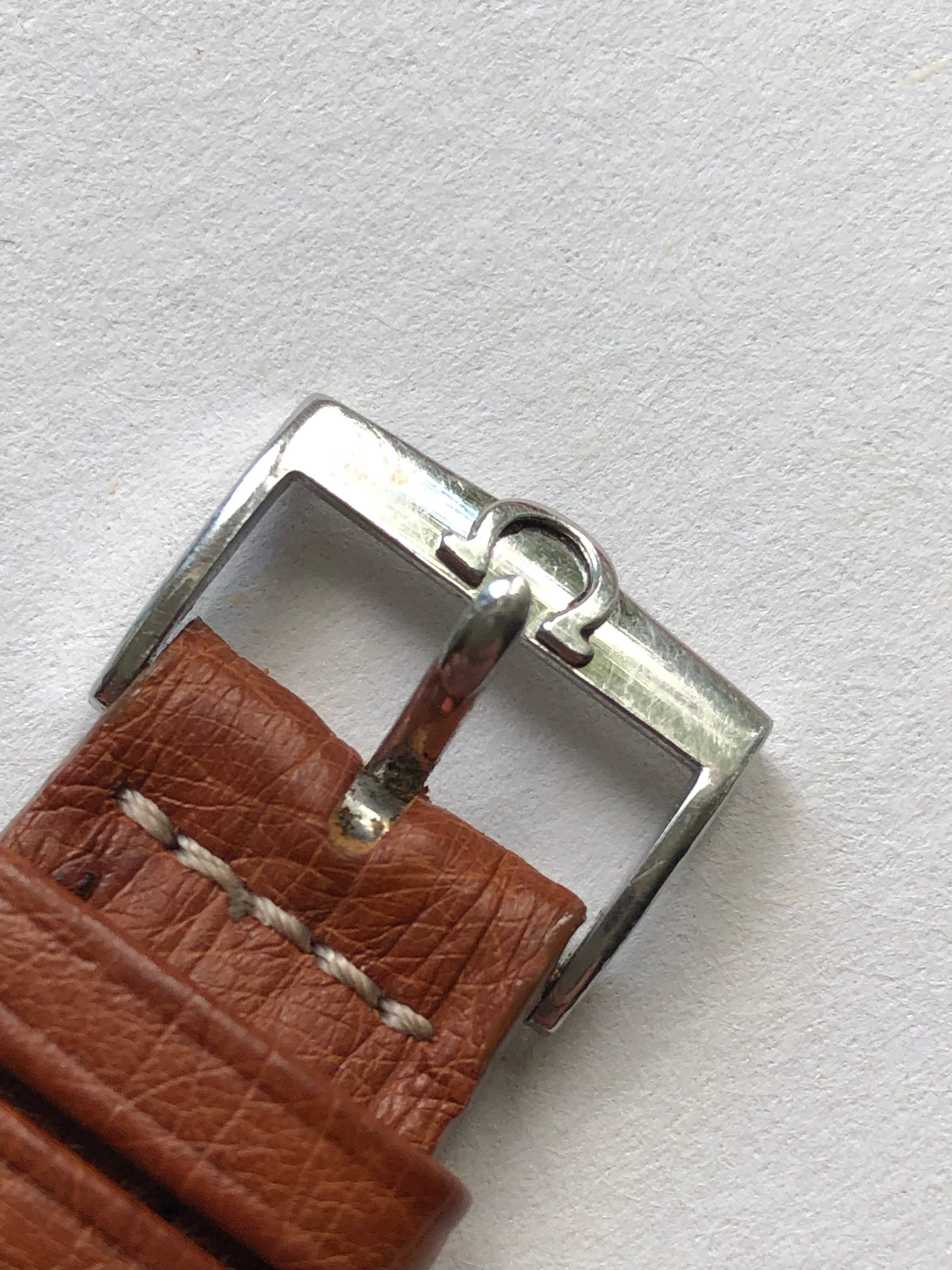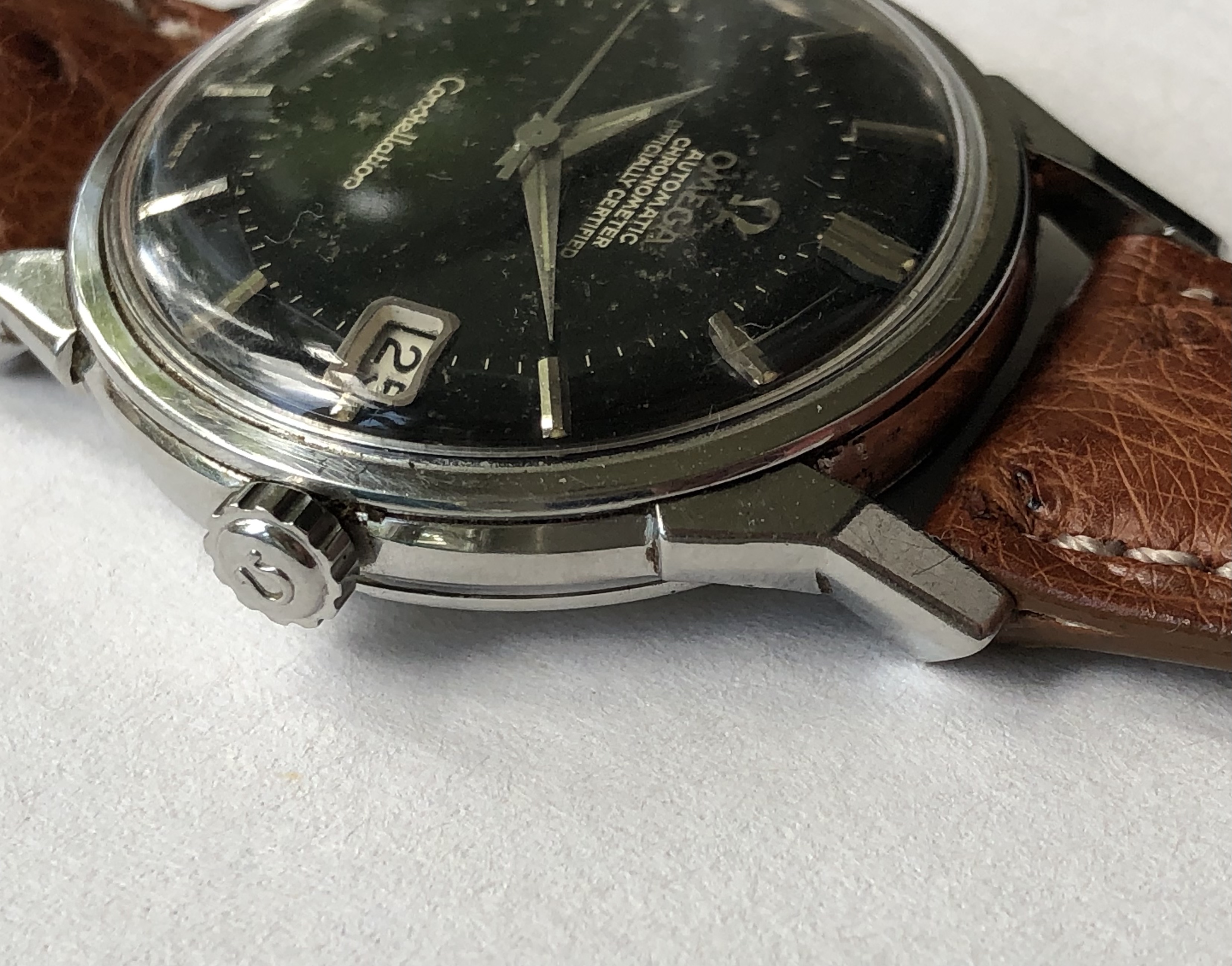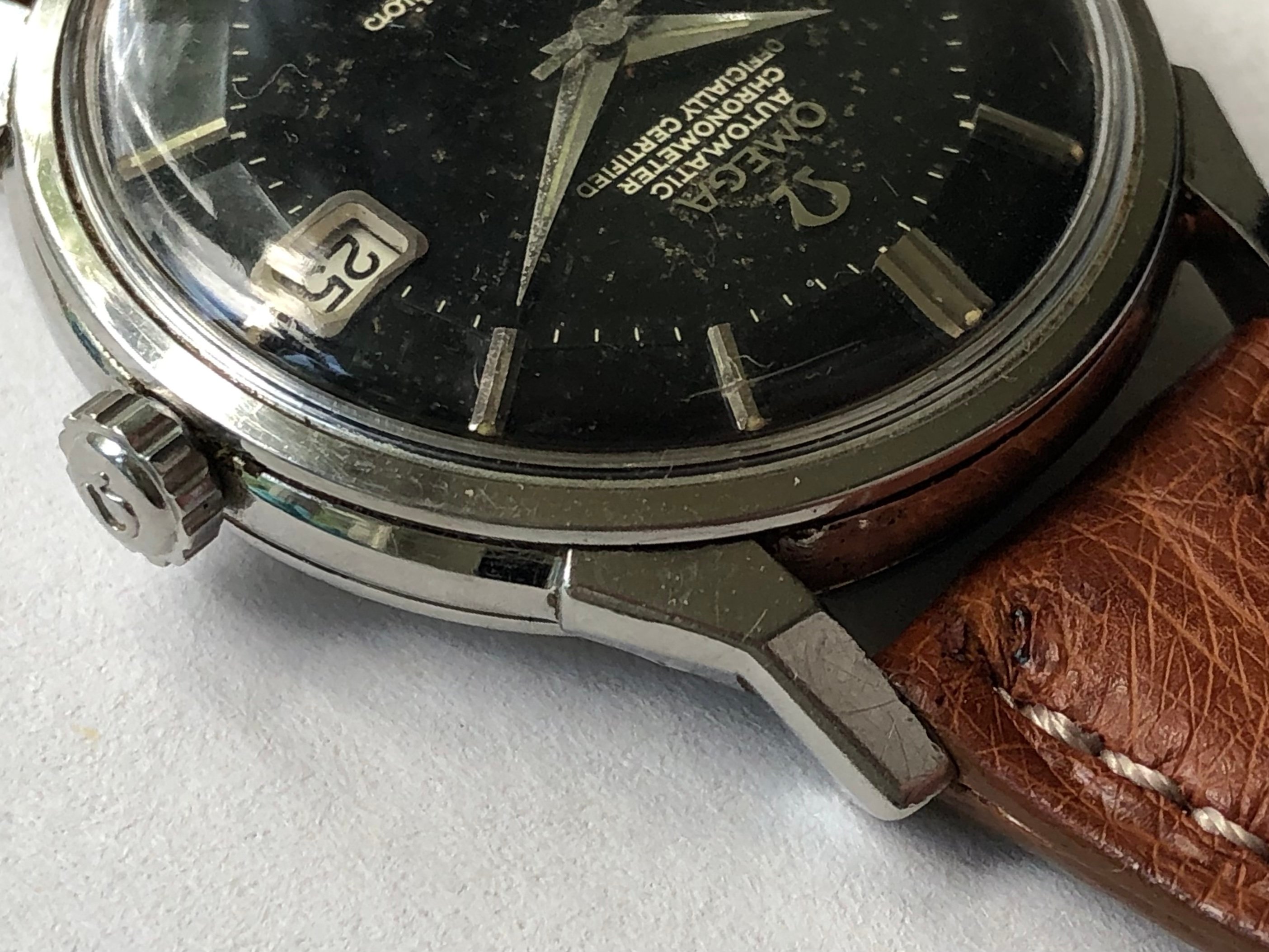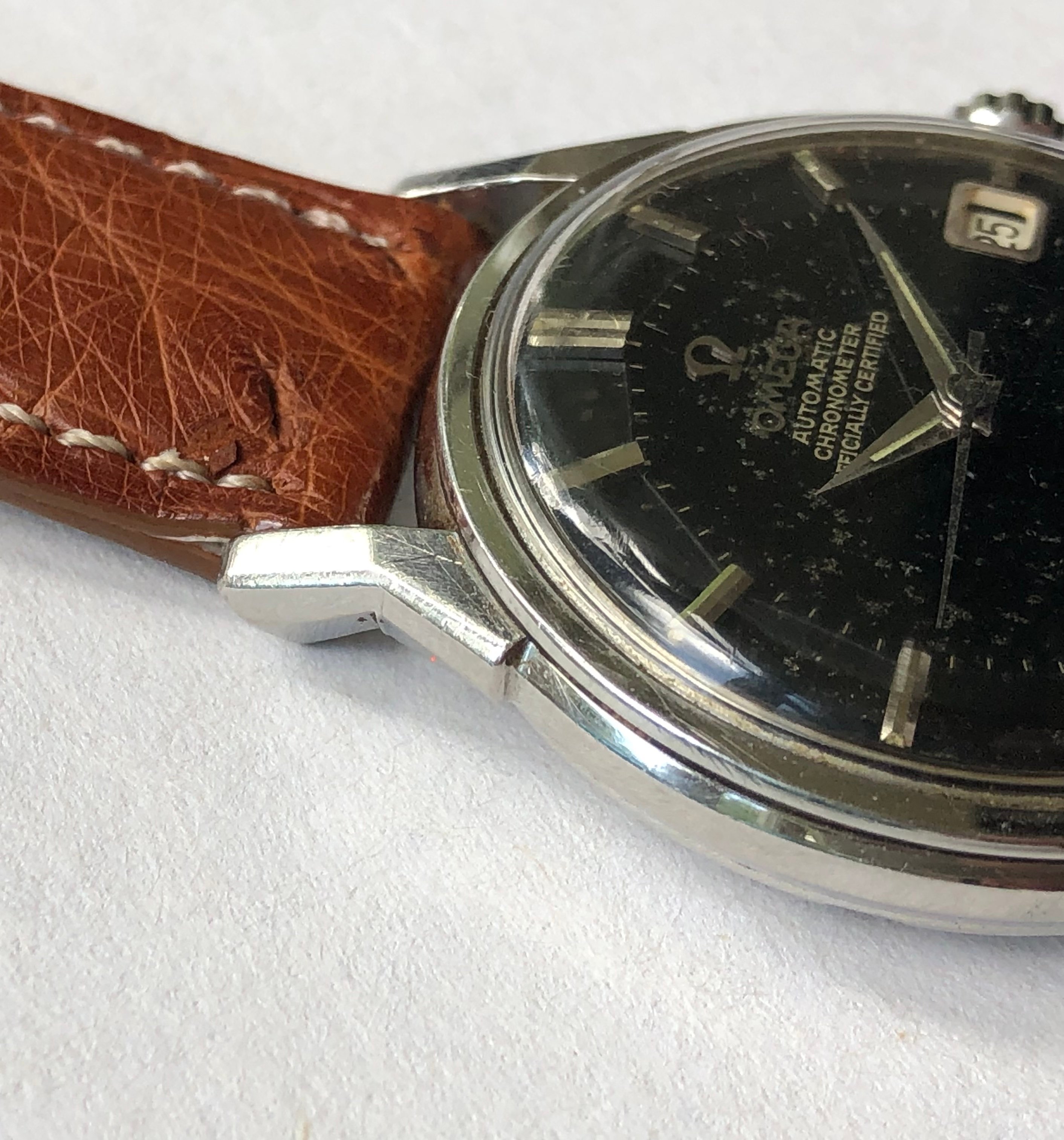 Hands/Crystal/Crown/Buckle: Original hands with oxidation, signed crystal with stress crack at 7 o'clock, signed (incorrect crown), original signed buckle.