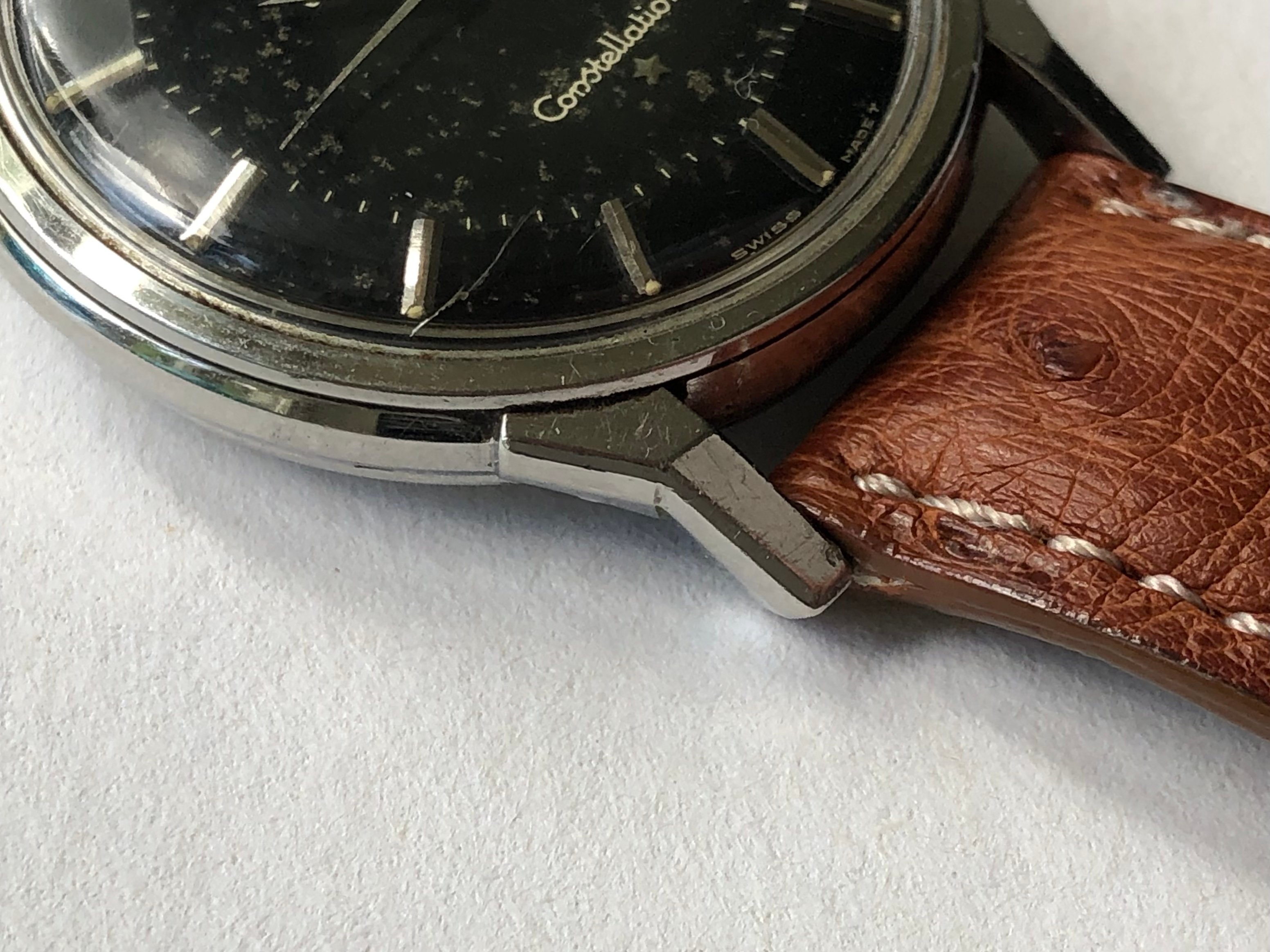 Case: 34mm stainless, ref. 166.005, with sharp case lines and honest wear