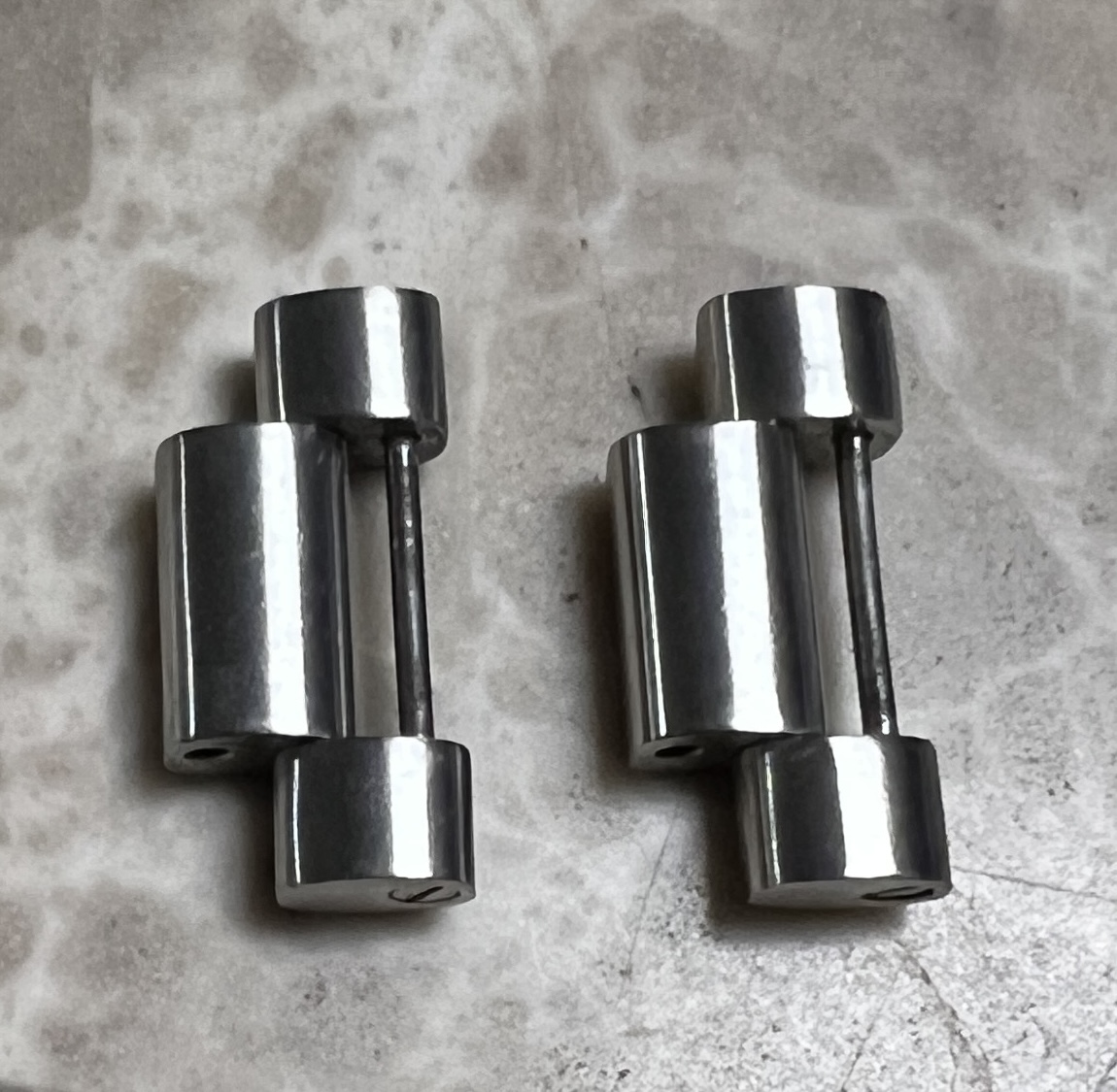 ·For sale ($55 each OBRO) have a pair of genuine Omega Seamaster Planet Ocean 18 MM half links, reference 115ST1589. These links are very hard to source and can be used on various bracelets, including STZ4972 (PO 21 MM modern bracelet), STZ4980 (PO 19 MM modern bracelet), as well as various other bracelets which tapers towards 18MM at the clasp (such as the 1610/930) in order to better adjust the bracelet length or to better center the clasp on the wrist. They are in unpolished condition and each comes with its pin and 2 screws as shown below.