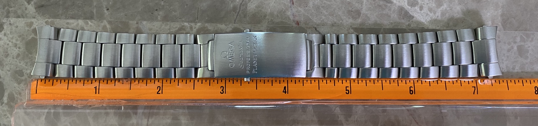 1- Good conditions 20 MM Omega stainless steel bracelet, reference 1580/952 with 6 full size and one half size removable links; total length is 7 3/8 inches as shown with very little stretch. Should fit a 8 inch wrist.