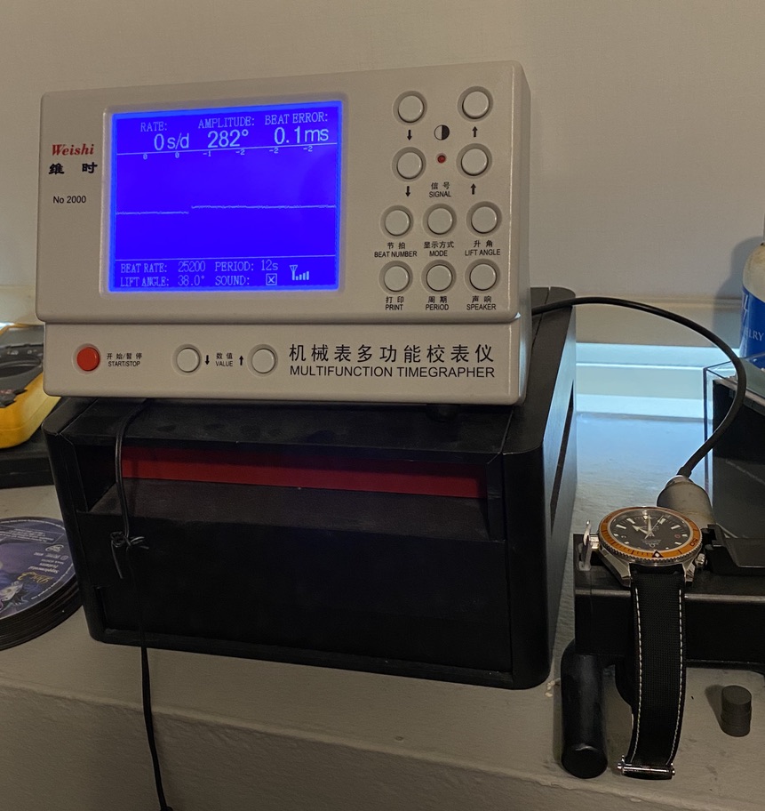 The watch is in very good conditions, with a few small marks on the head and bracelet as shown on pictures. The bracelet length is about 7 3/8 inches by itself, so should fit an 8 inch wrist when installed on the watch head. The movement is a caliber 2500C coaxial and the watch is running very well with no issues whatsoever and strong performance based on the time grapher reading shown below (running at 0 SPD with amplitude of 282 and 1 ms beat error). The dial lume is green and glows very nicely with very little sun exposure as shown.
