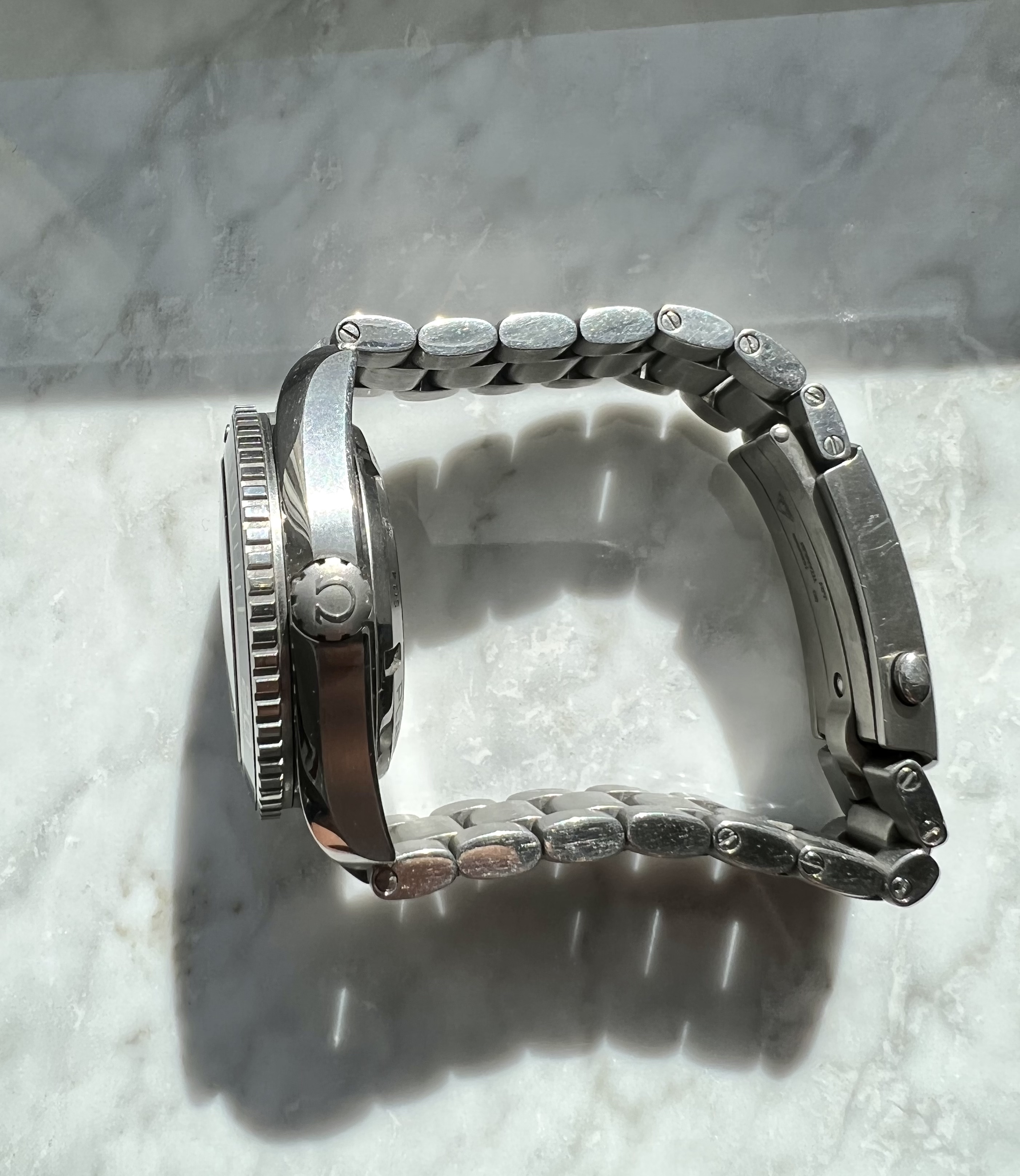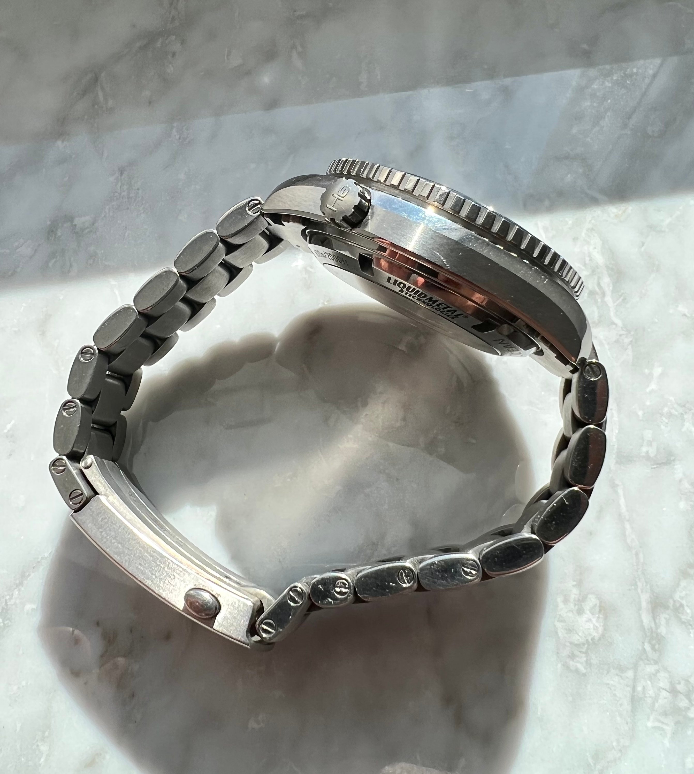 Case: Titanium, 42mm. The case shows the usual signs of wear but no deep scratches or dings. The crystal has 3 discreet scratches at 12 o'clock, visible in certain lights and angles.