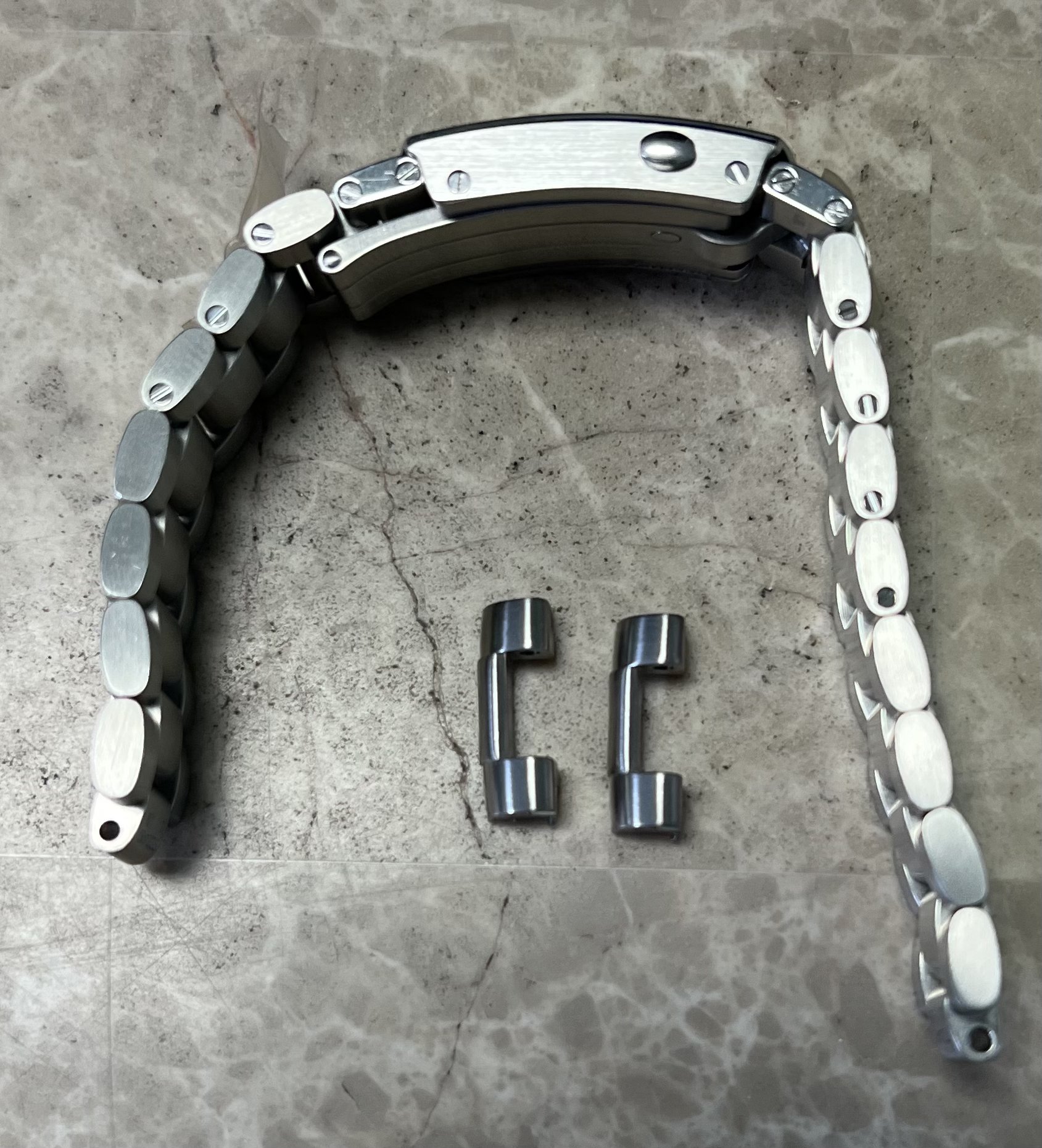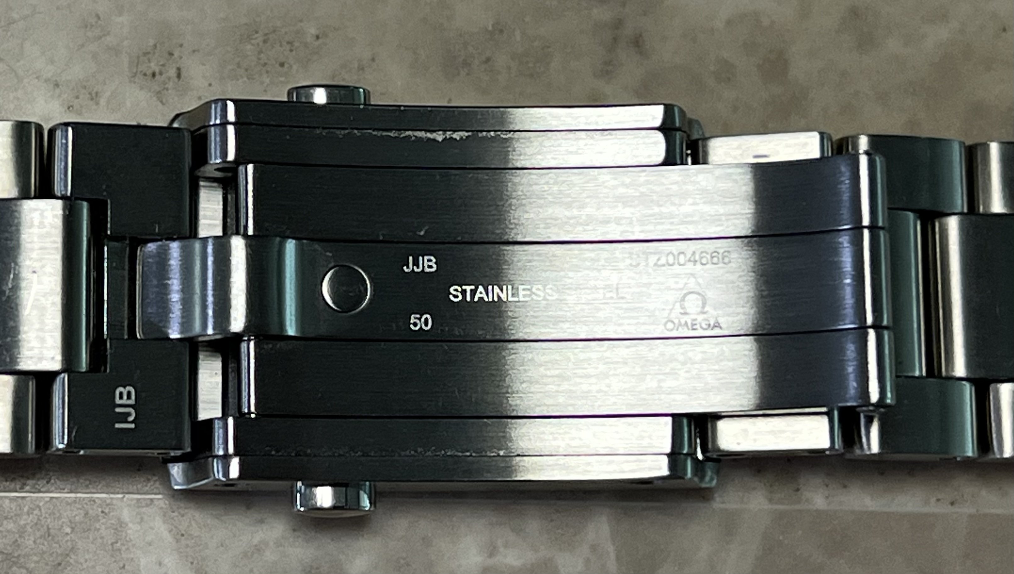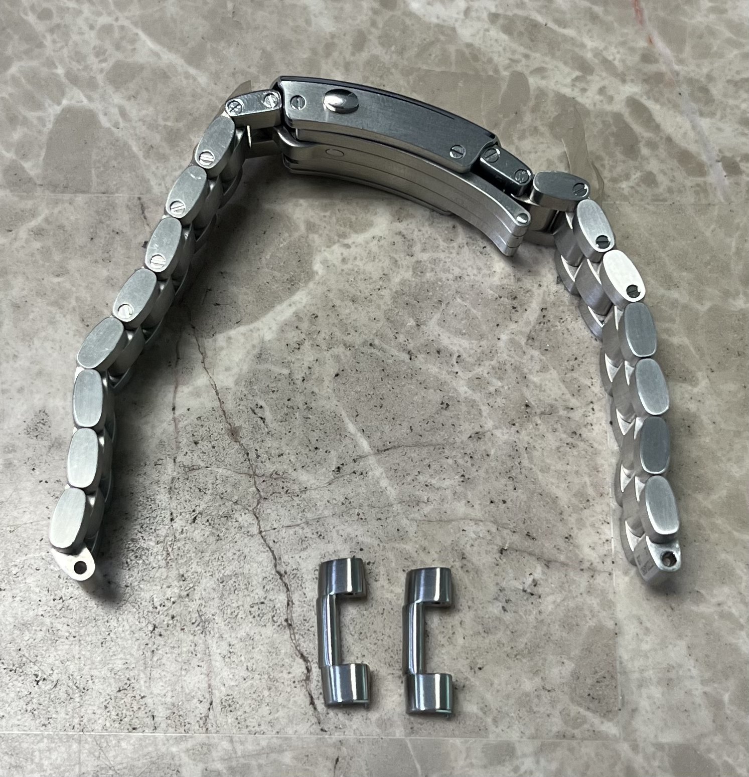 The bracelet clasp reference model, which has the 3 position extension, is STZ004666; the bracelet fixed links at each side of the clasp have reference numbers STZ004980 and STZ004990 at their case end, respectively as shown. The bracelet is in excellent conditions as shown and has a total of 7 removable links; its length with the extension at the clasp in is 7 inches, so should fit at least a 7 ½ inch wrist when installed on the watch head. It comes as shown with the stainless steel end links.