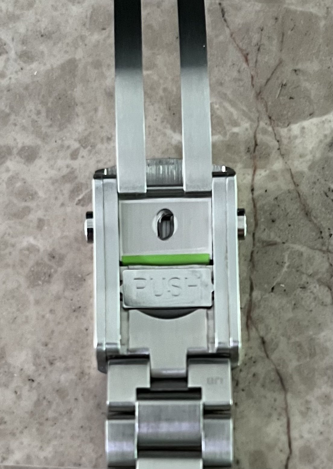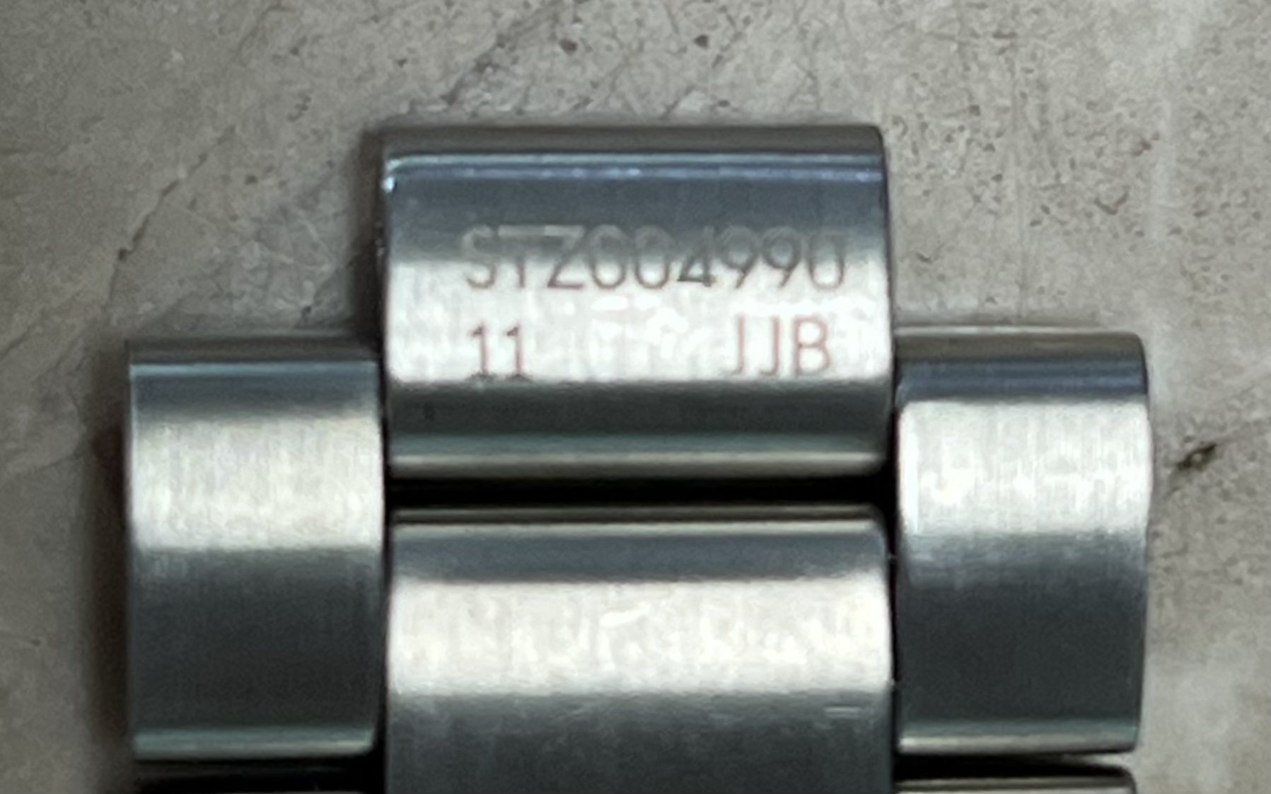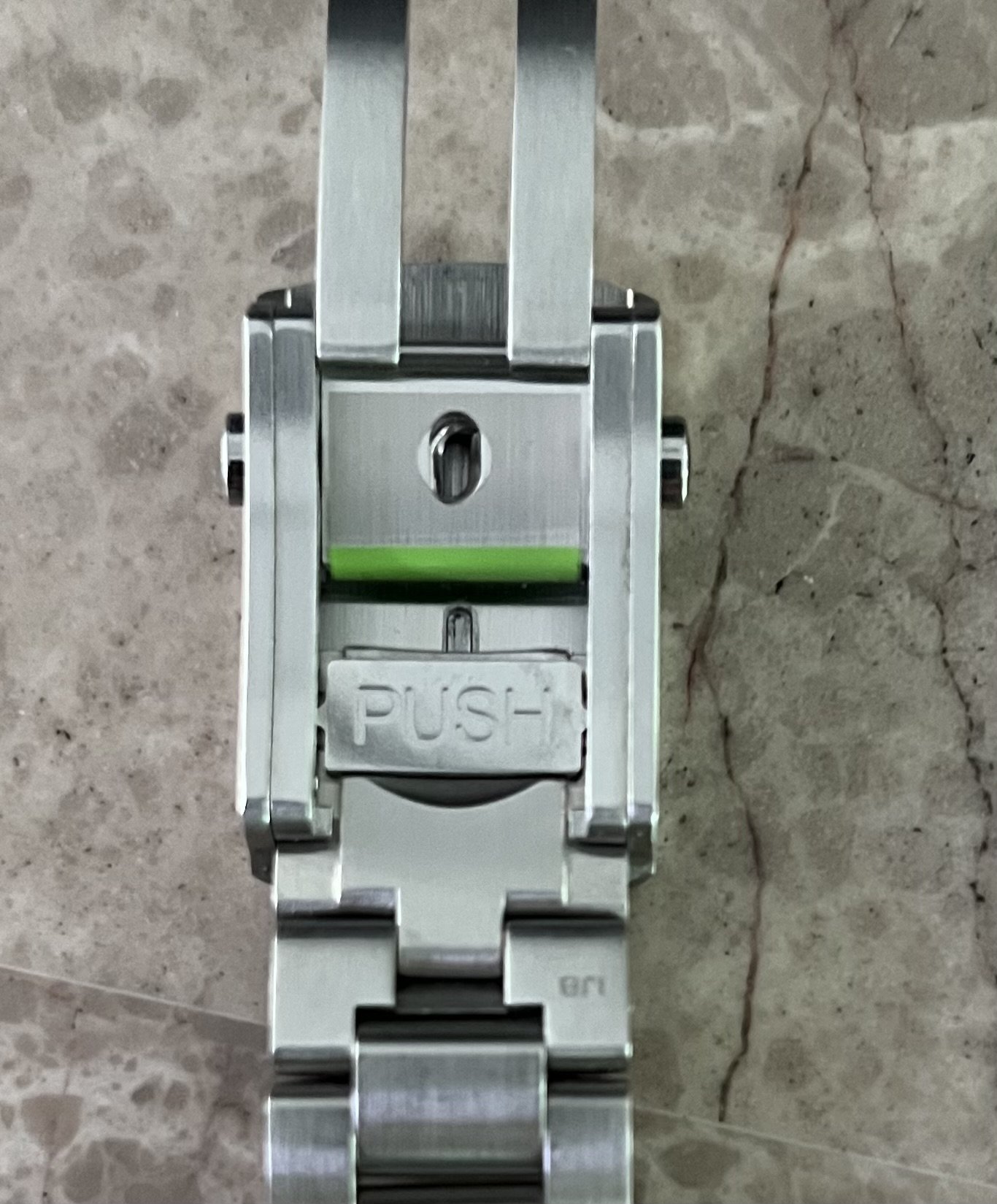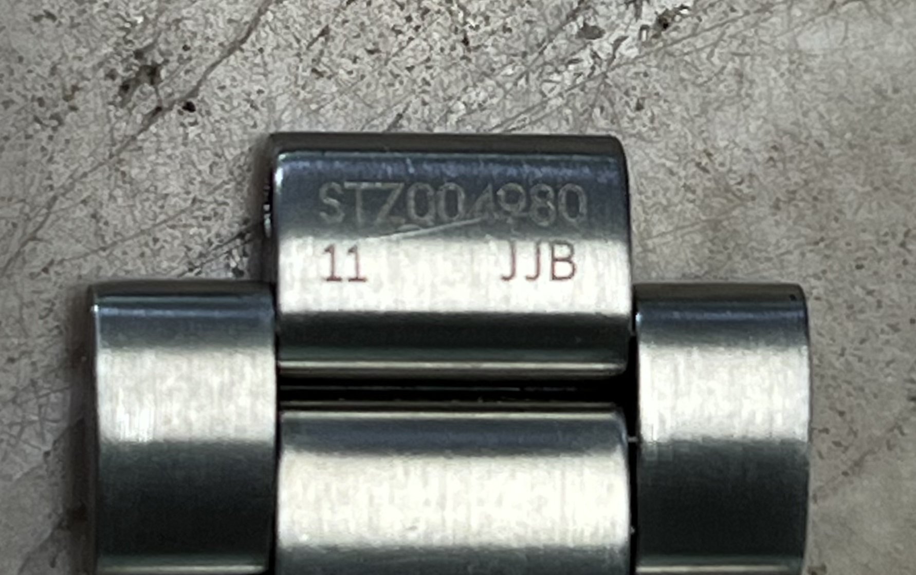 The bracelet clasp reference model, which has the 3 position extension, is STZ004666; the bracelet fixed links at each side of the clasp have reference numbers STZ004980 and STZ004990 at their case end, respectively as shown. The bracelet is in excellent conditions as shown and has a total of 7 removable links; its length with the extension at the clasp in is 7 inches, so should fit at least a 7 ½ inch wrist when installed on the watch head. It comes as shown with the stainless steel end links.
