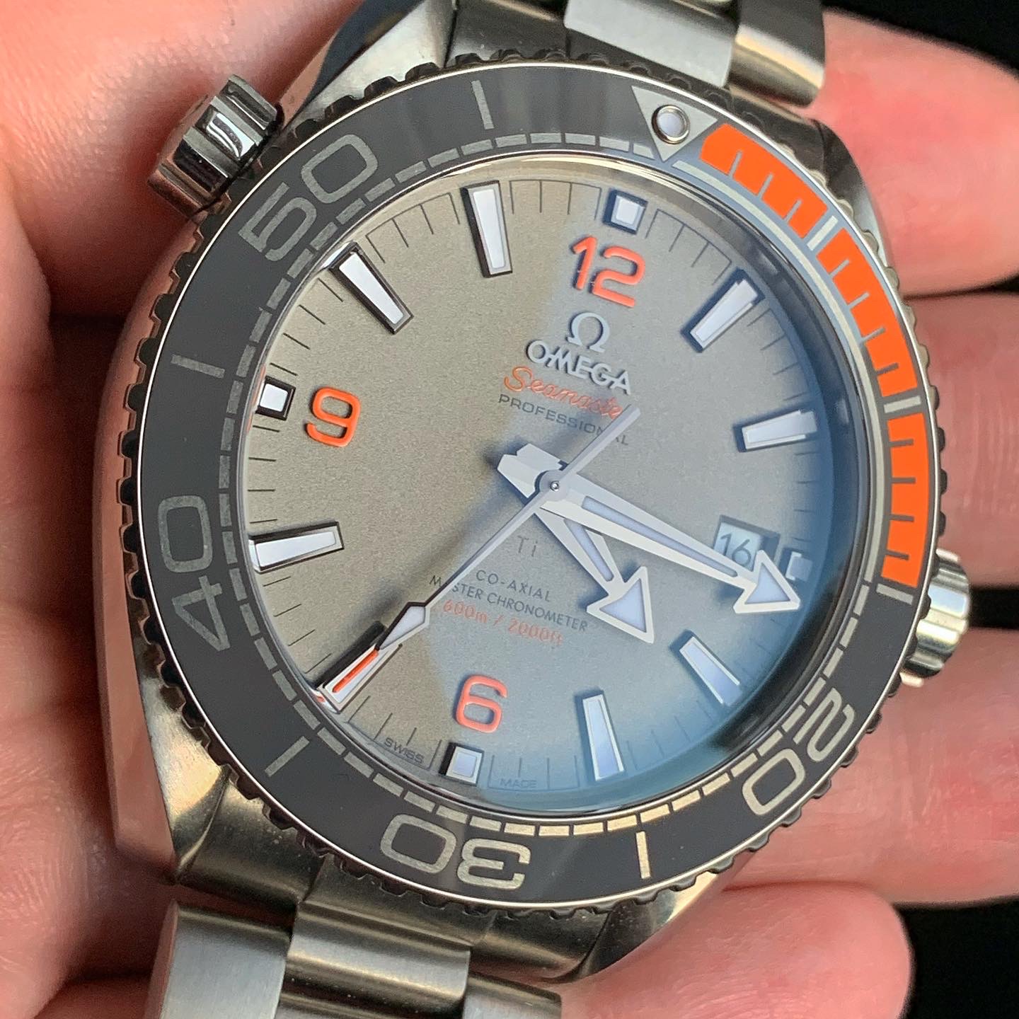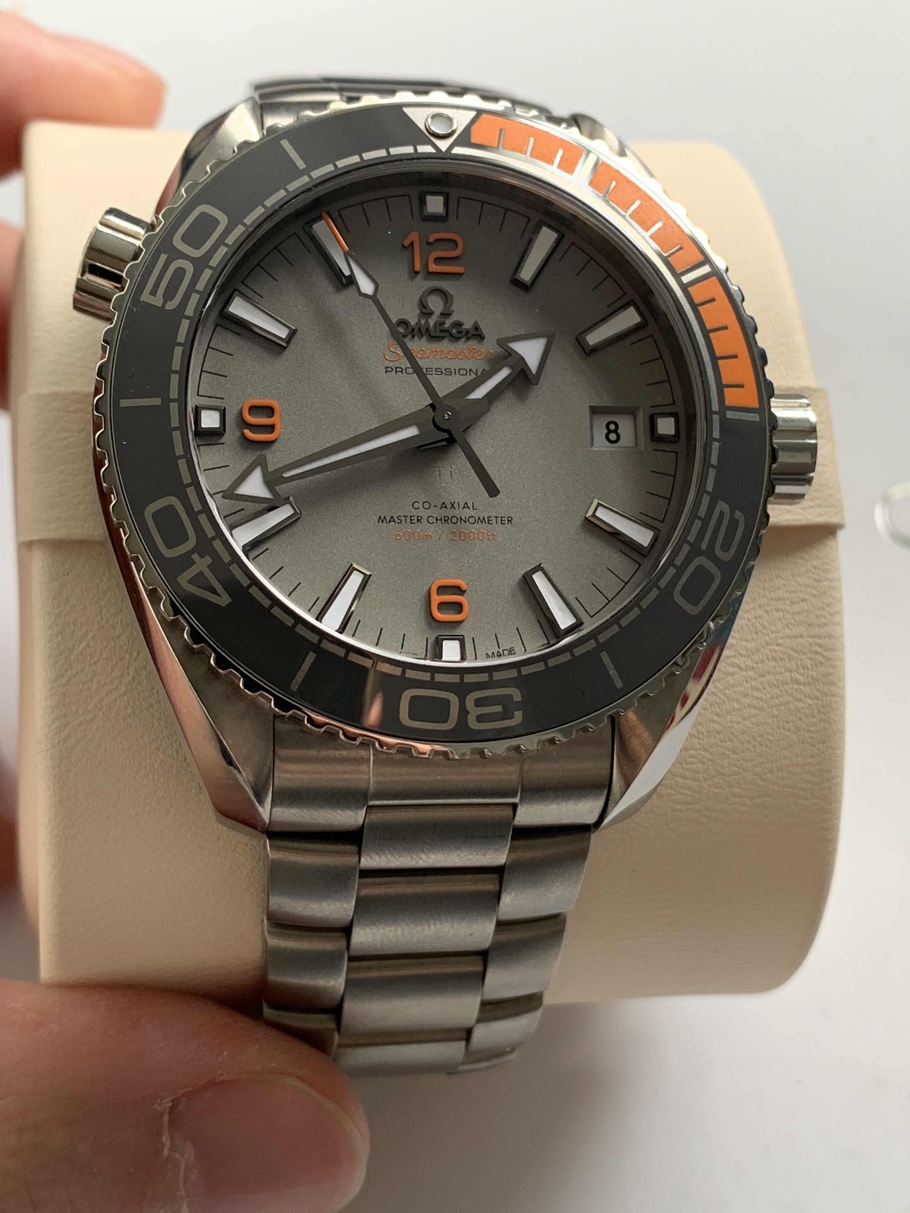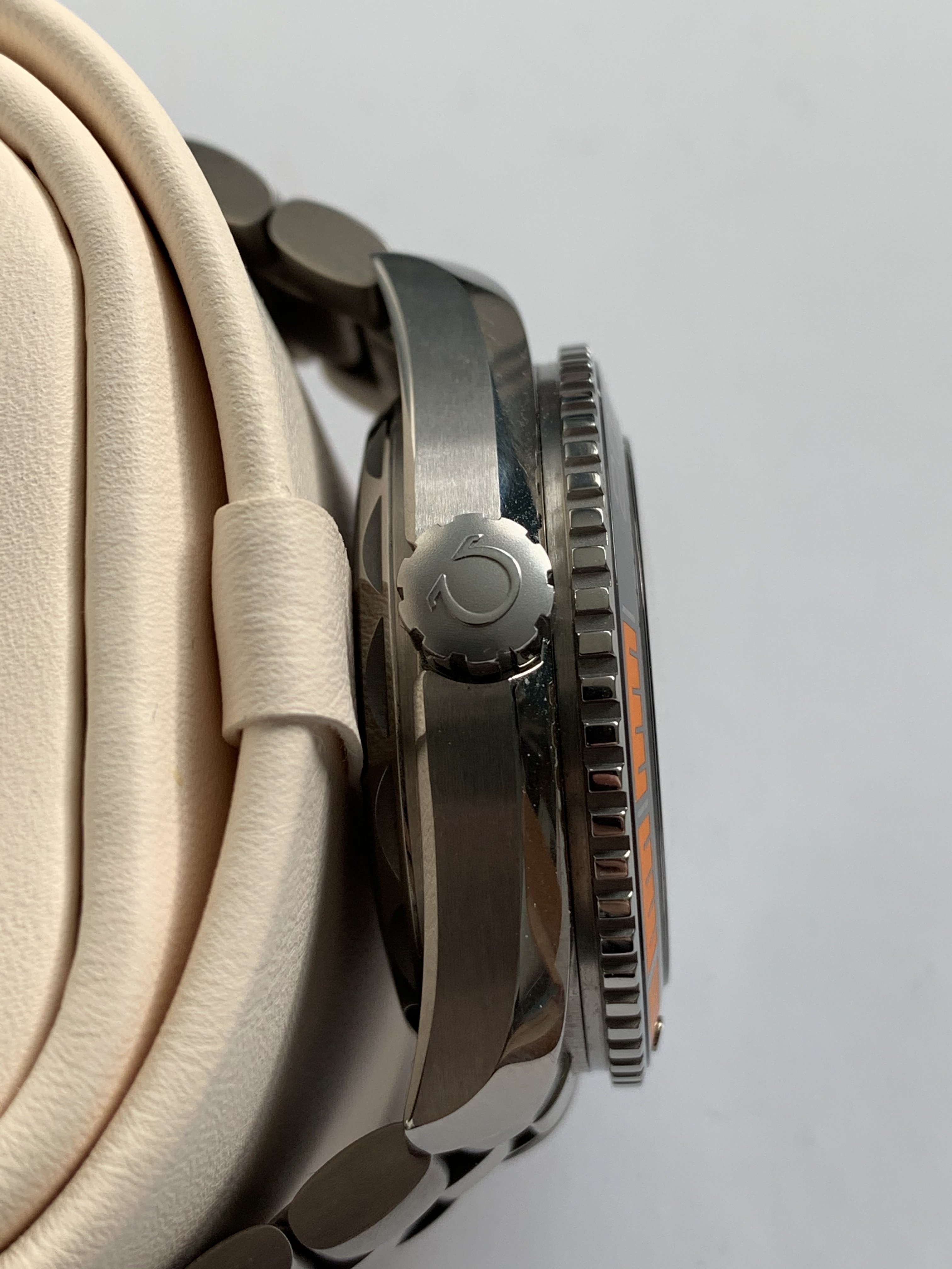 One of the best modern Planet Ocean references, with stunning orange accents in titanium case and comes with titanium bracelet.