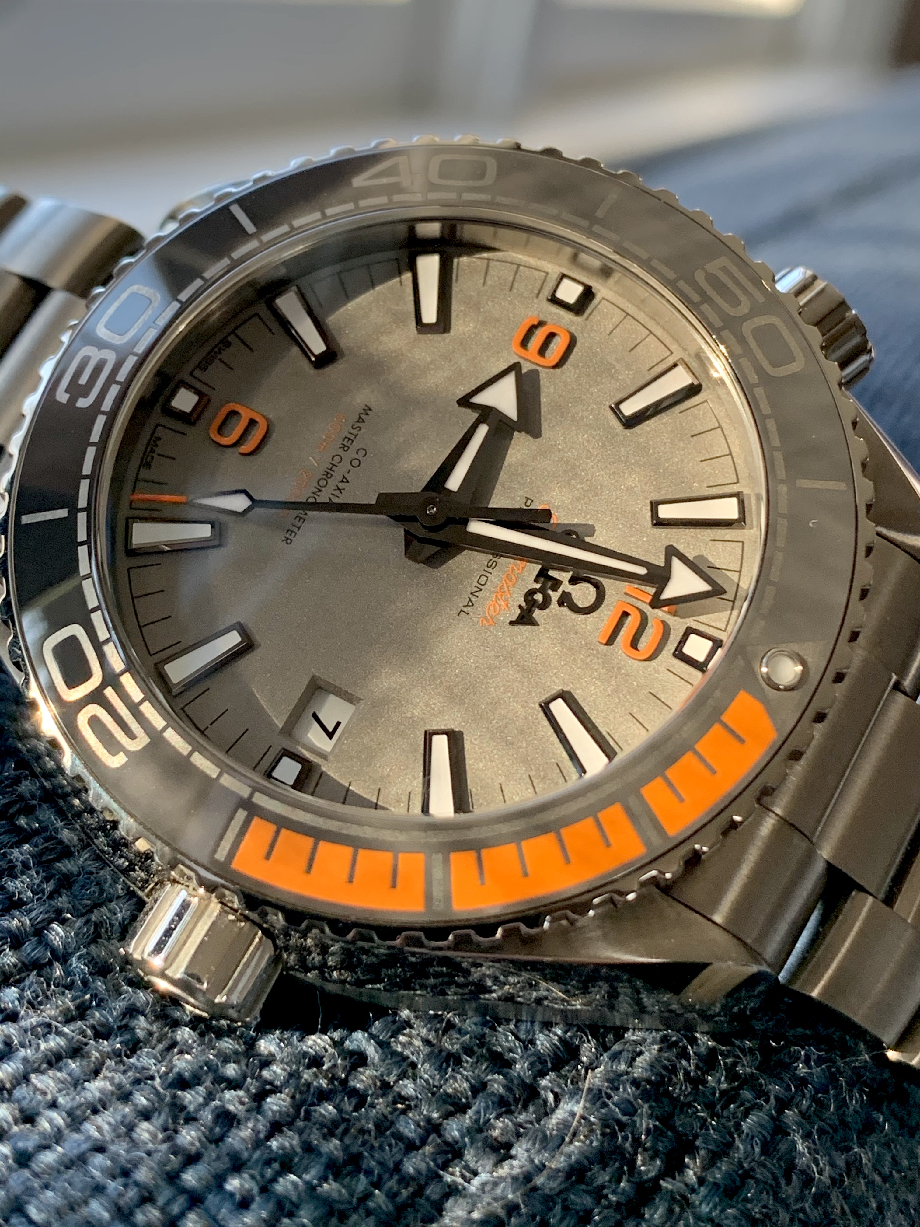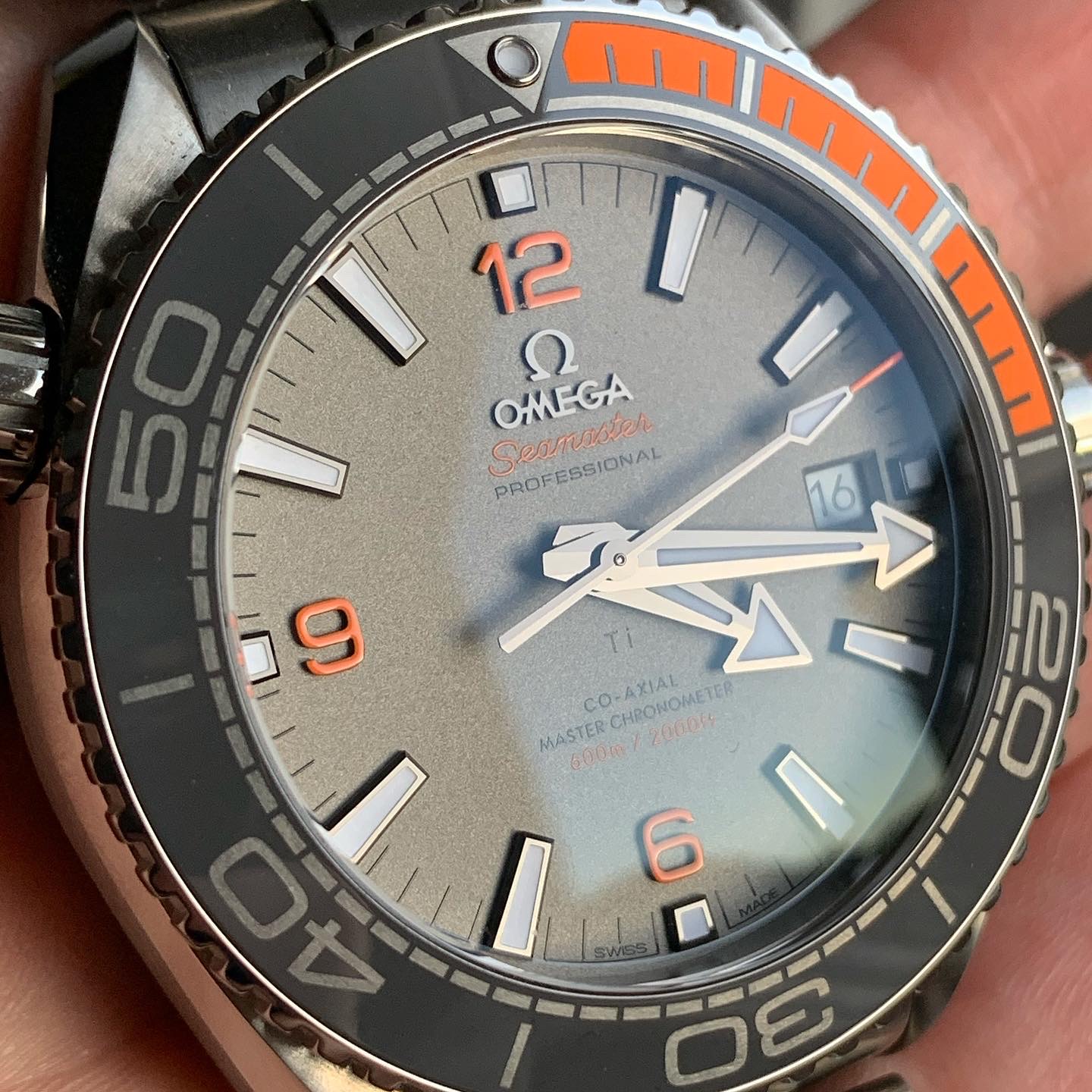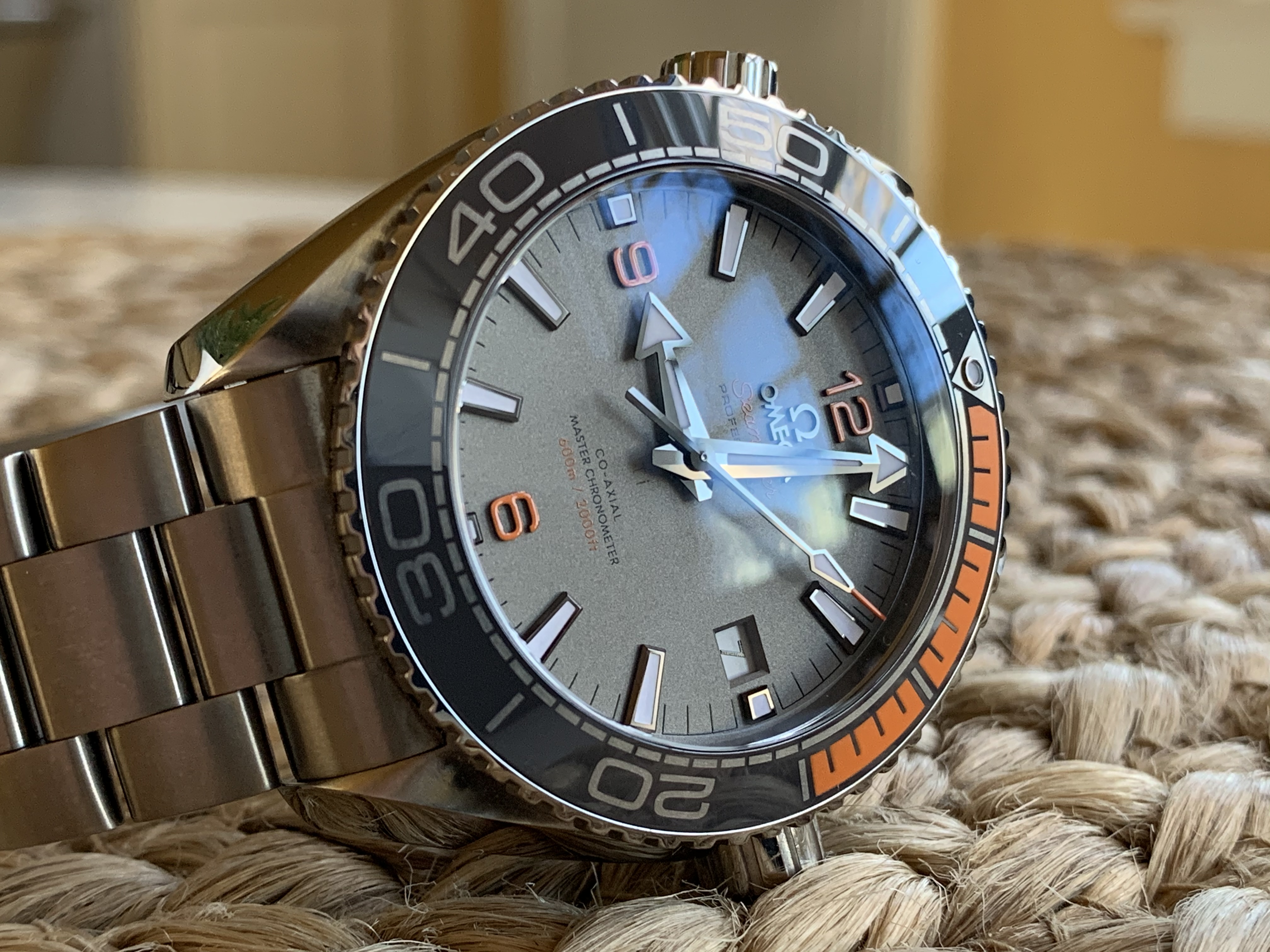 One of the best modern Planet Ocean references, with stunning orange accents in titanium case and comes with titanium bracelet.