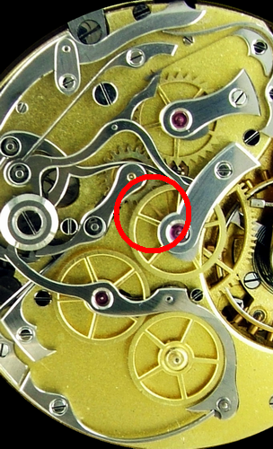 Ringed in an image below is the ‘finger piece’, mounted on the chronograph wheel, which turned the chrono minute hand exactly on the elapsed minute (as opposed to the minute hand moving continuously).