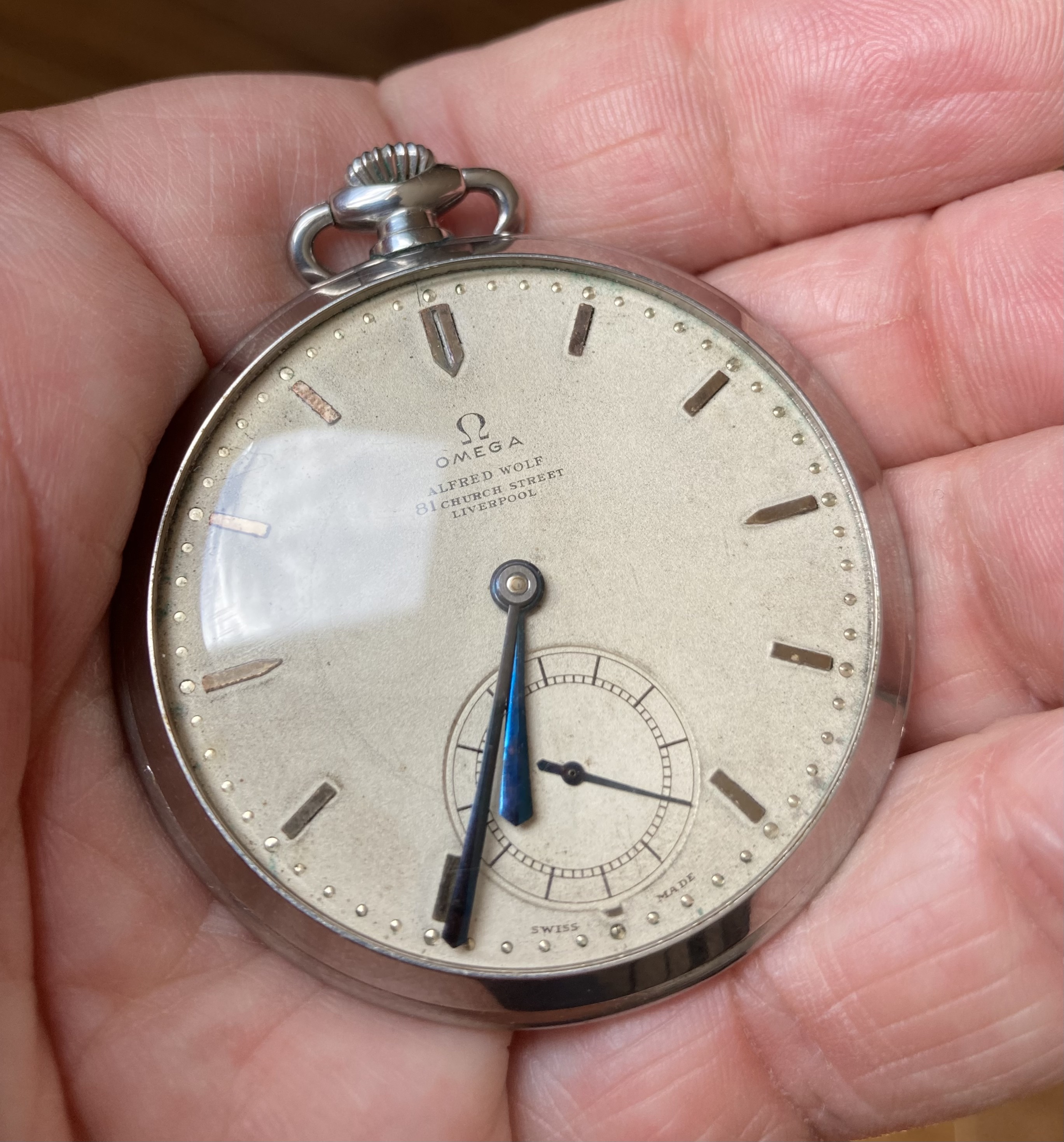 It has a "silvered" dial with blued steel "club" style hands.