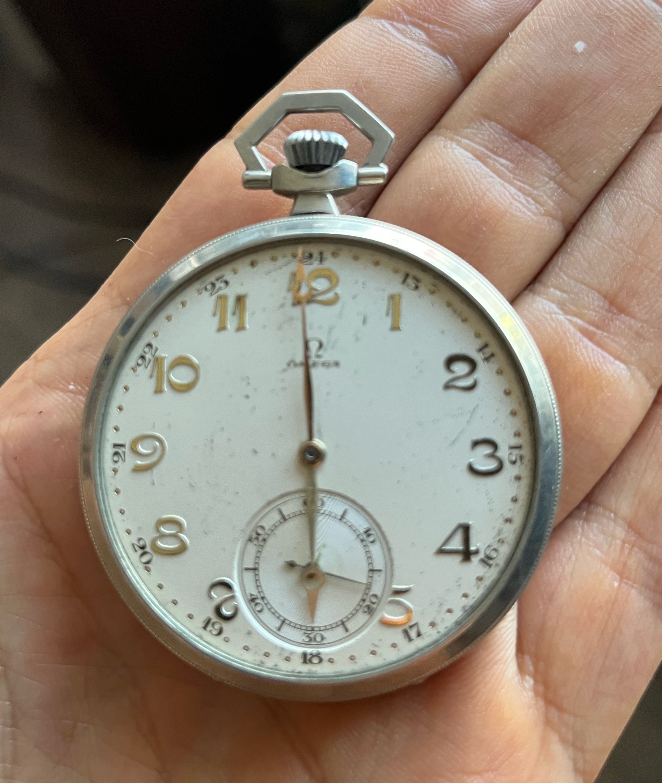 Very few nickel plated cases for pocket watches. It's either 'métal blanc' i.e. nickel based alloy, or a staybrite produced before Omega advertised them as such inside.