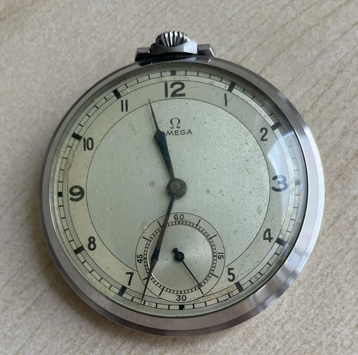 We have recently cleared out my dads house and found a box of old watches which included this old vintage omega pocket watch - I have searched but I cannot find one identical. The face is 4cm wide, I cannot open the back which appears to be a stainless steal case and the watch is not working when wound.