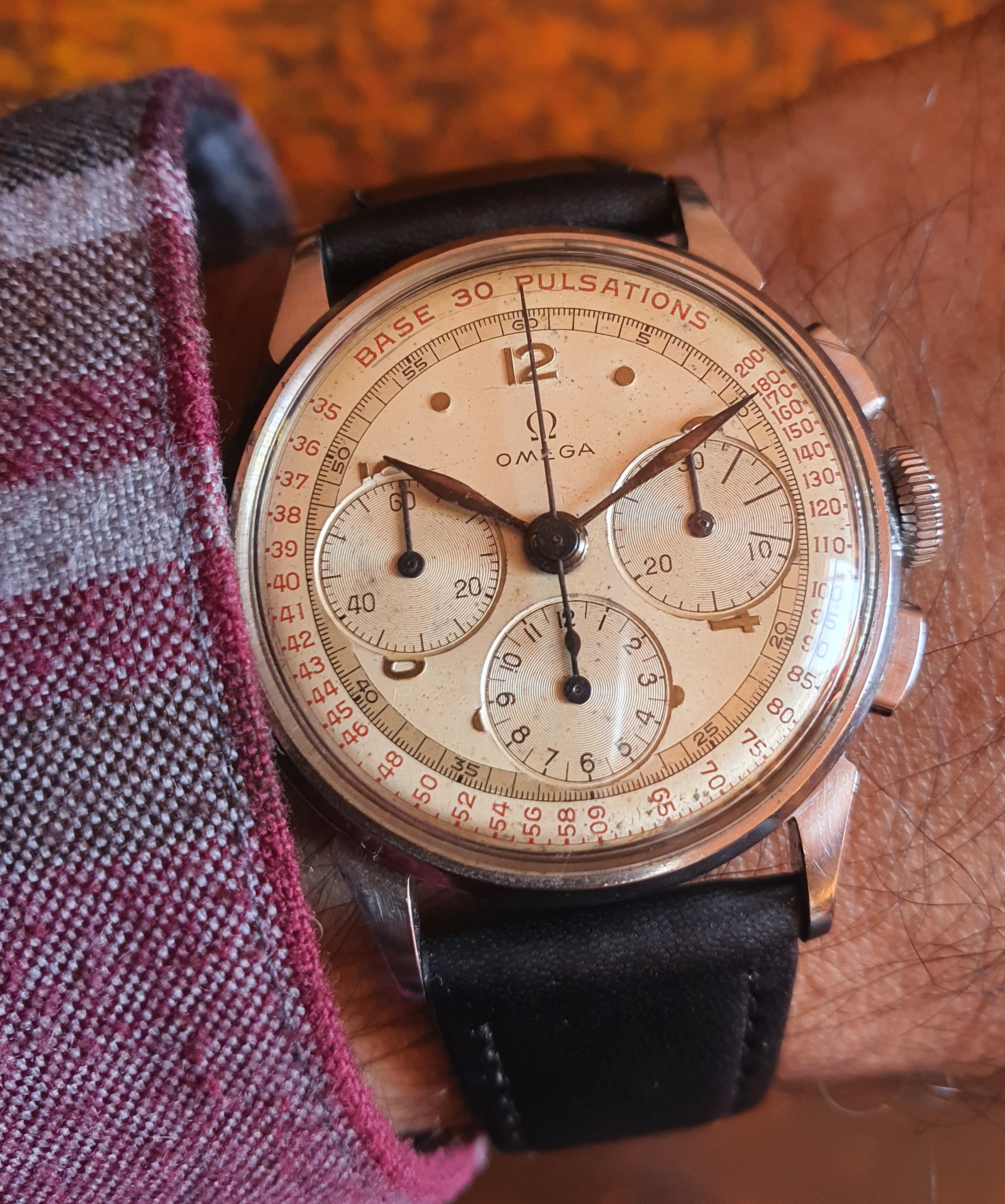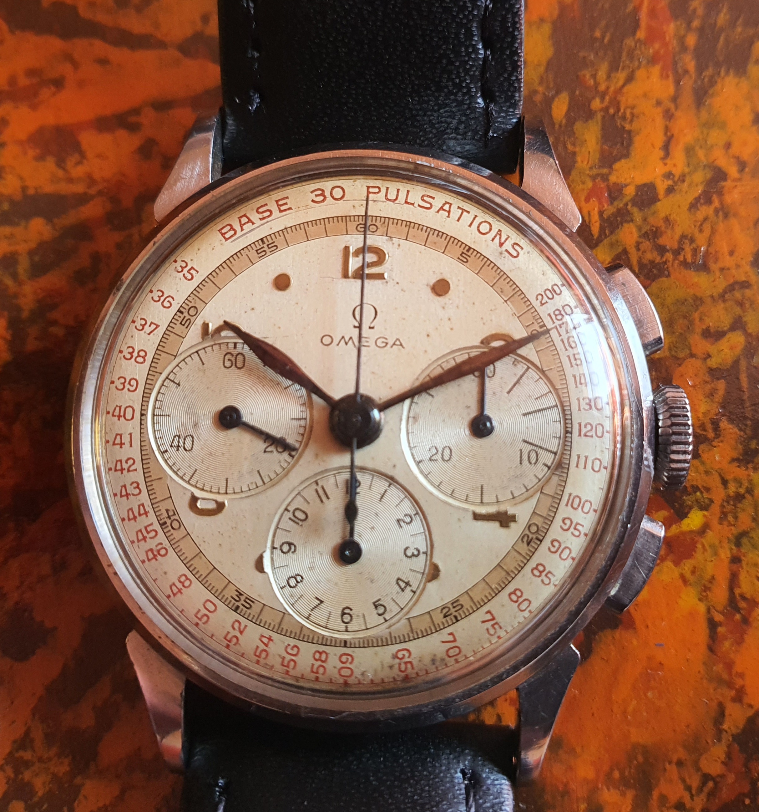 ·I invite you to post photos of your Omega pulsometers, with a movement's summary and details about your watch. I begin with my 2277-1, case steel, inside dial with pulsometer scale (base 30), movement is manual winding, caliber 27 Chro C12 T2 (aka 321) 17 jewels, movement number 10723658 (50s).