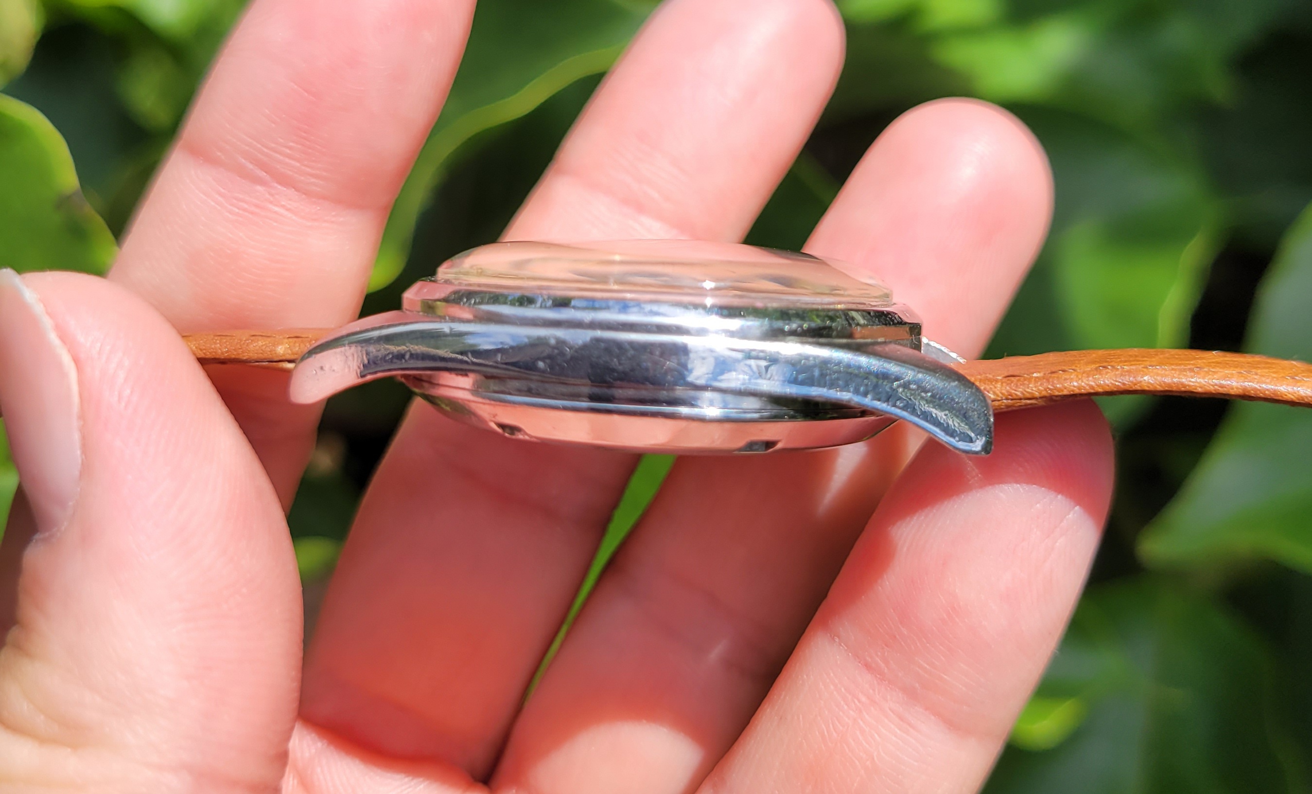 The dial has a silver tone which looks lovely in the sun. There is a small tool mark near the center post, which is not very conspicuous at most times of day (covered by hands). There is also a thin drag mark on the 12-3 side. Lume loss is present to the hour and minute hands.