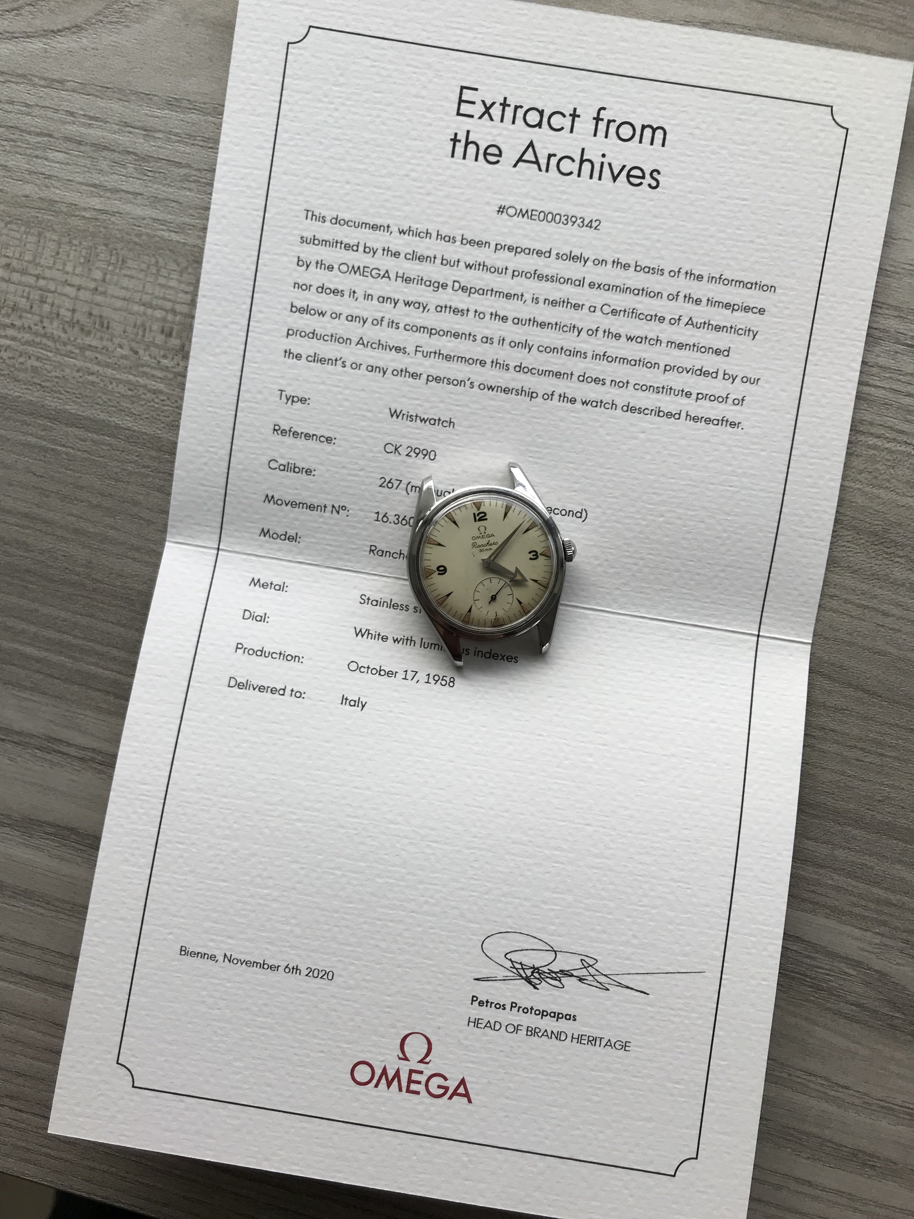 The reference is 2990-1. It was produced on October 17, 1958 and delivered to Italy according to the extract.